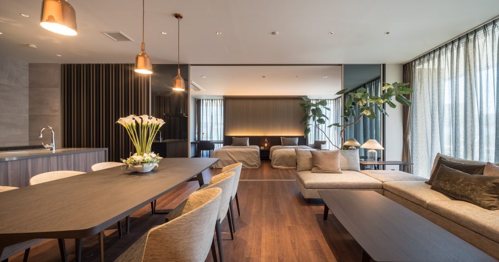 宿泊するだけの空間にとどまらず、ゲストが羽をのばして過ごし、パーティも開催できる機能とゆったりとした広さを確保しました。イメージしたのは、ホテルのスイートルーム。大地から発想した温もりを感じる空間美を演出しています。