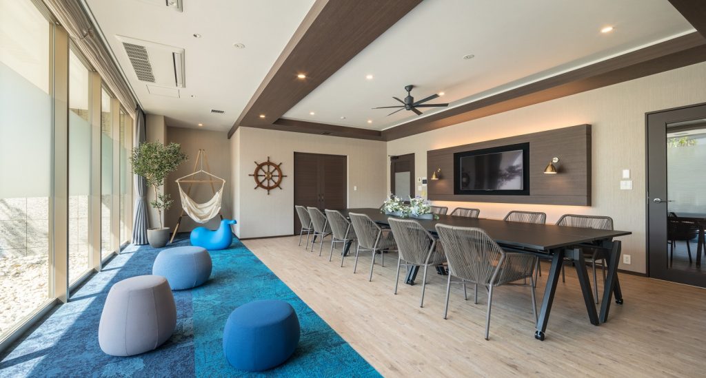 海のイメージから導いたコンセプトは、シーサイドクラブハウス。クルーザーのオーナーたちが集うような空間を目指しました。集会室のみならず、パーティルームとしてなど多目的な利用が可能です。