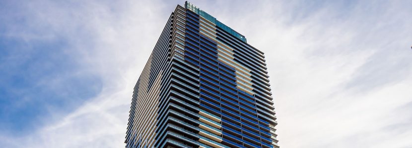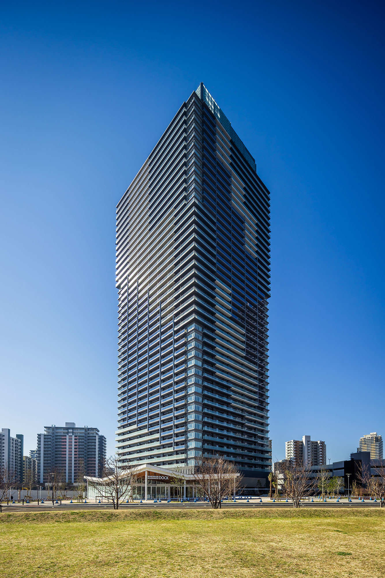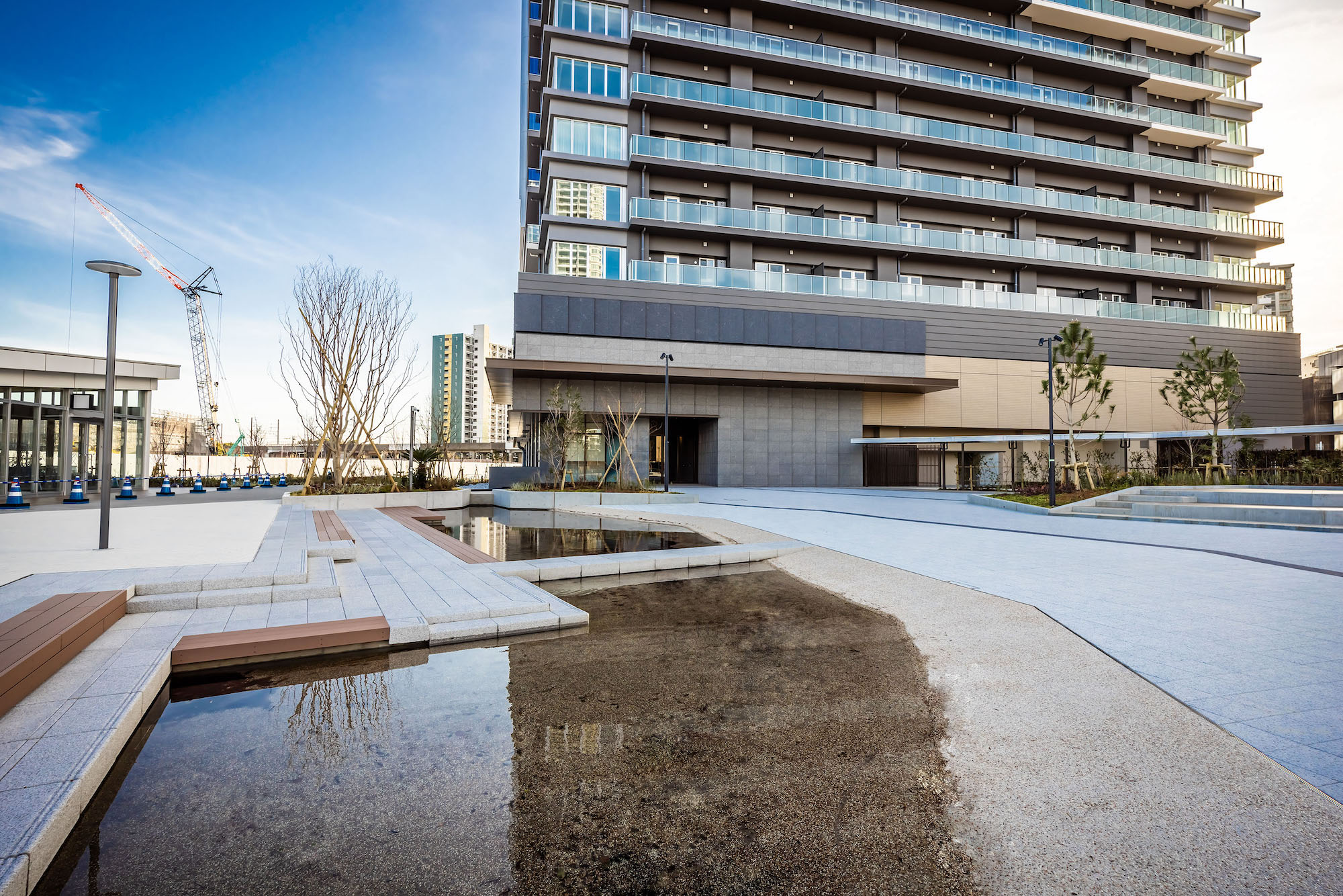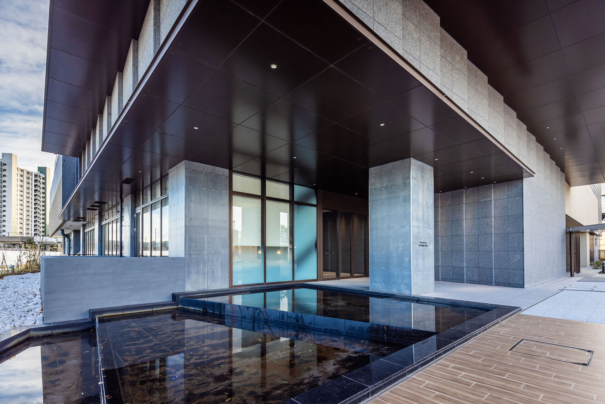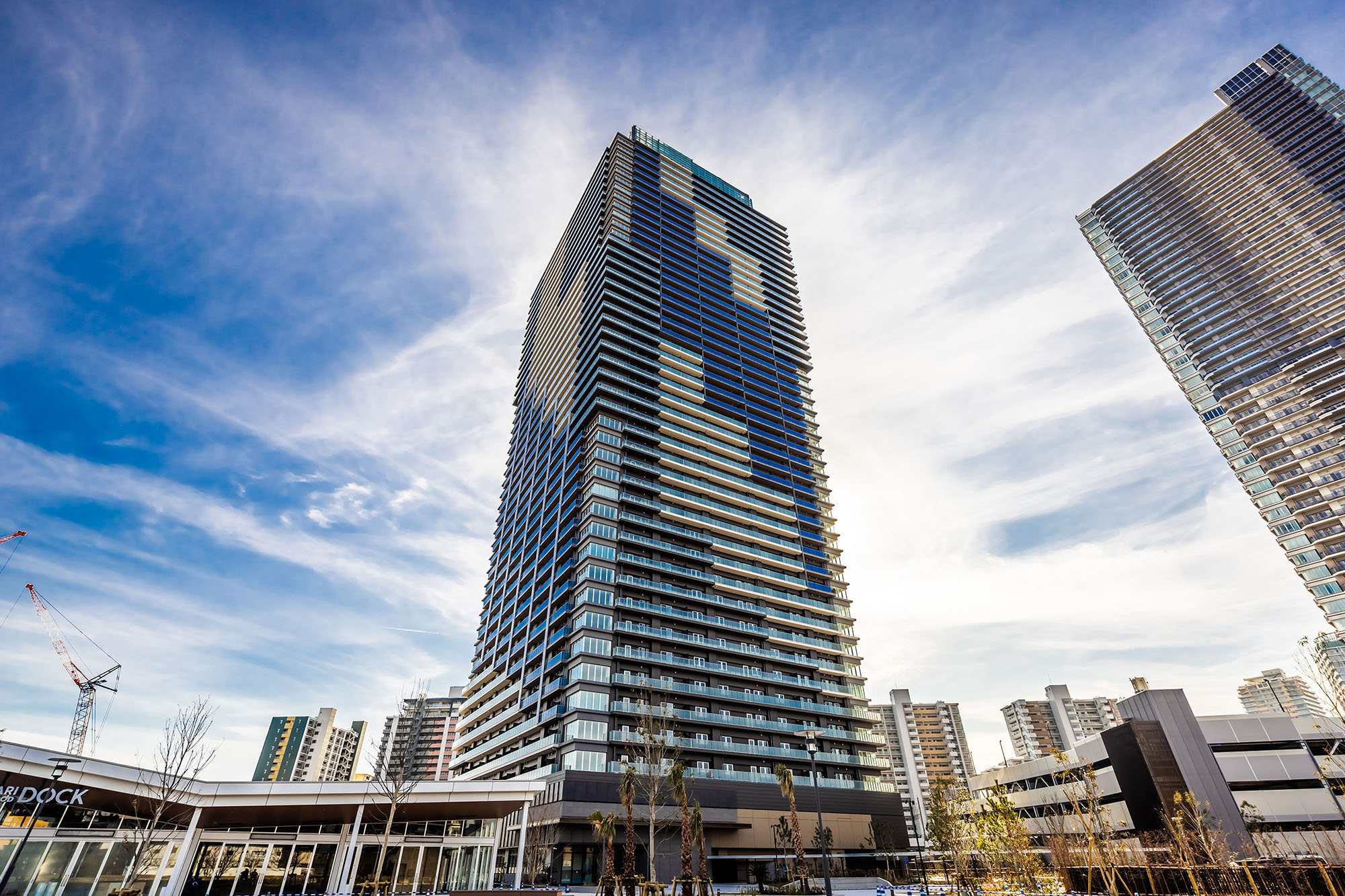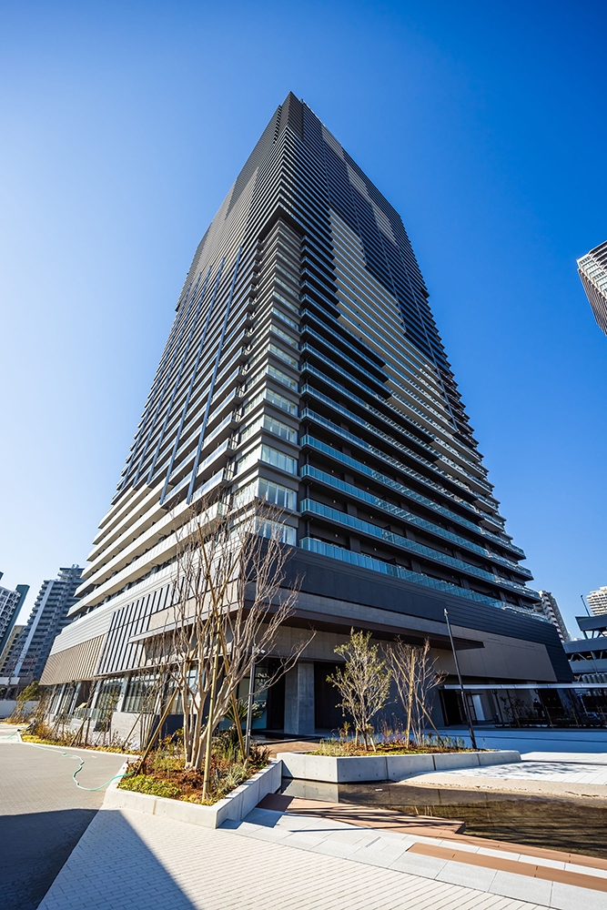 爽やかな色彩をまとうシンボリックな佇まいは、ランドスケープからはじまるストーリーに基づいてデザインされています。ストーリーの起点は、エントランスアプローチの「マリンプラザ」。その水面に小さな波が生まれ、タワーの足元へと打ち寄せながら、徐々に大きな波へ。それがスパイラル状に空へと立ち上っていく様子を、建物全体で表現しています。スパイラルは、表情の異なるガラスパネルやバルコニー形状などにより繊細に構成。タワー頂部もガラスパネルを用いて連続的に、象徴的に描いています。