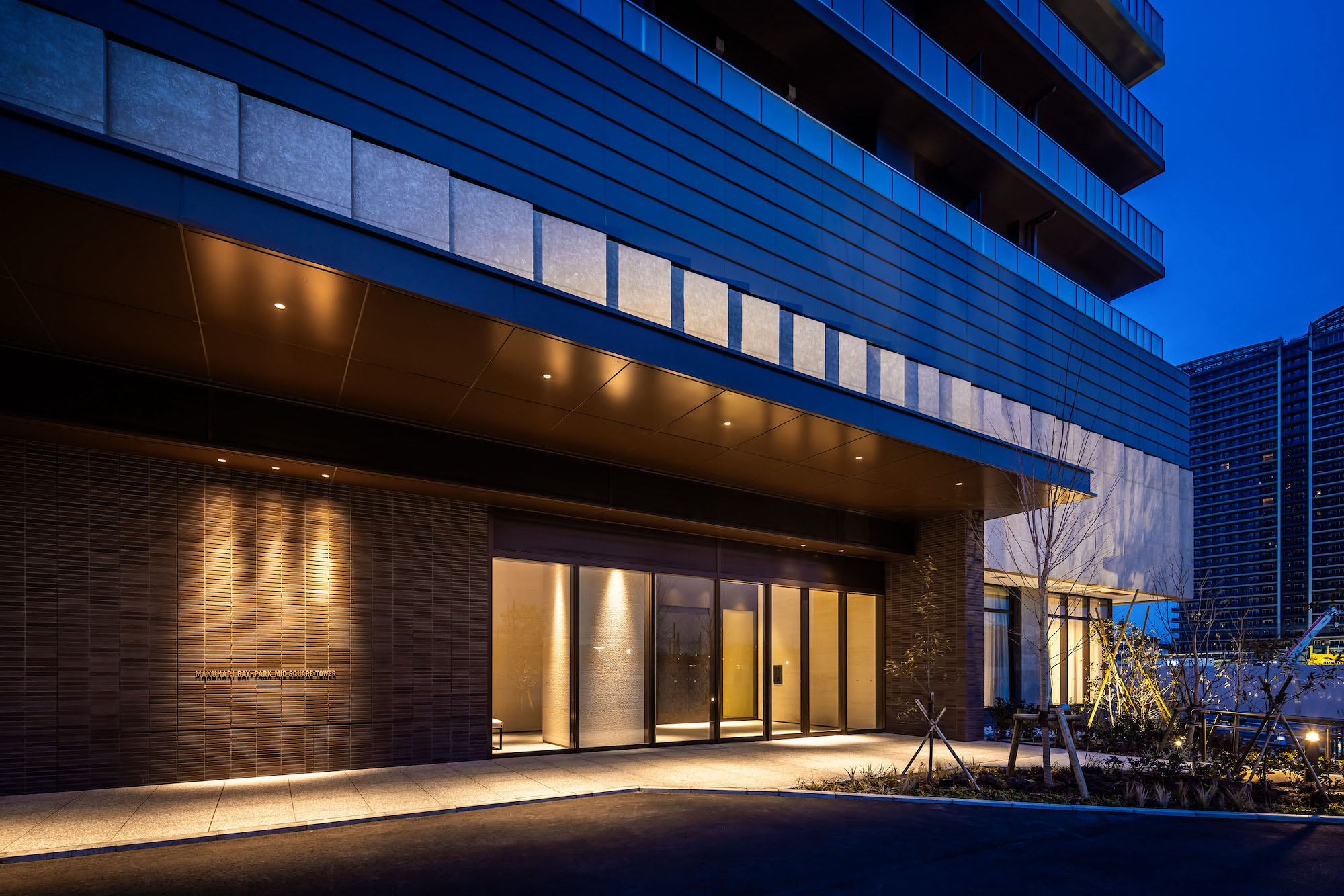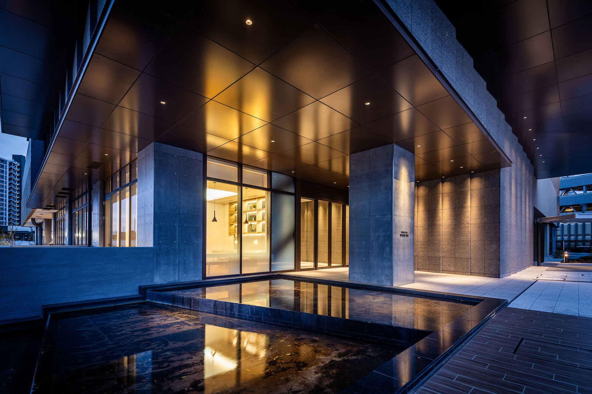 波をモチーフに描いた基壇部のダイナミックなデザイン。グランドエントランスには大きな庇をあしらい、誇らかな佇まいを追求。水の音やきらめきに癒されるアプローチは、桟橋を渡るように、プライベートな空間へと導きます。