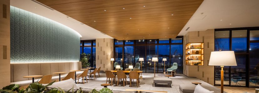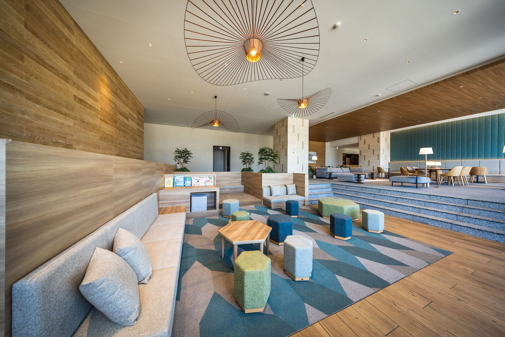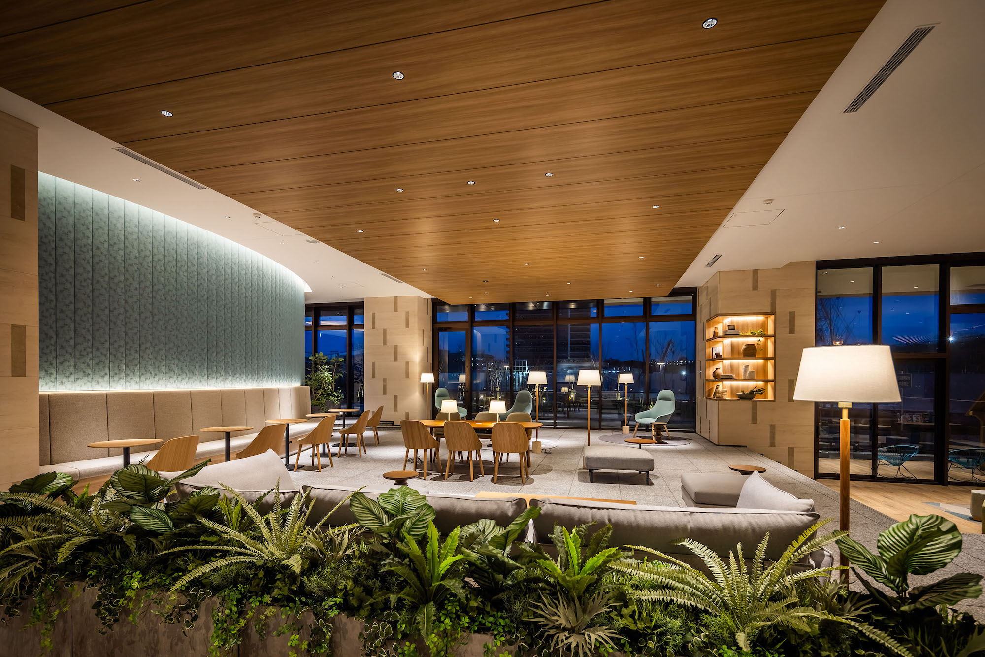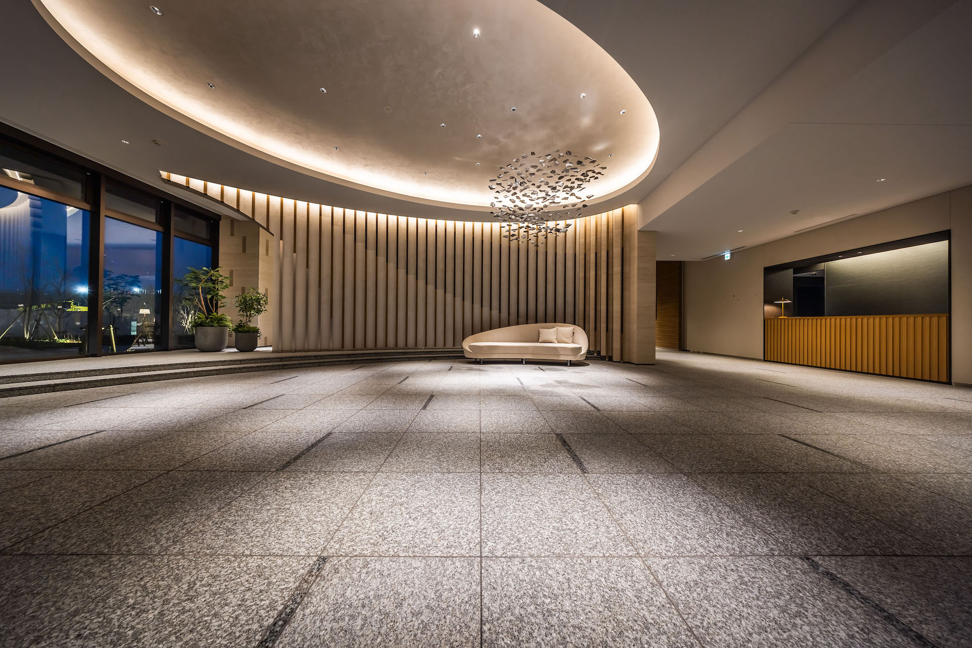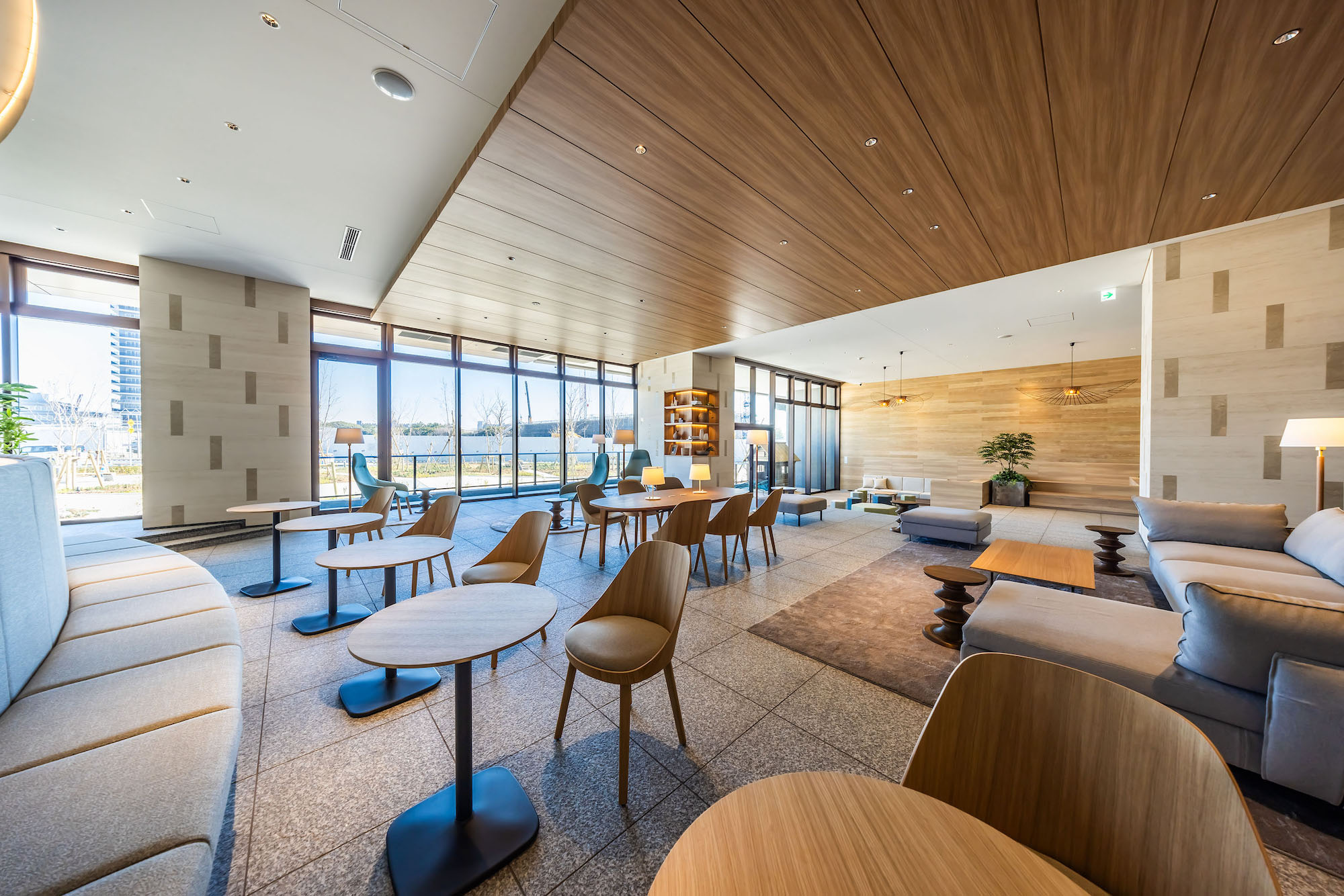 グランドエントランスの扉が開くと、海風を感じる空間が待っています。風の流れを表現したルーバーの壁。反射して揺れる光が、煌めく水面を思わせるアート。天井や家具の曲線美。そのすべてでおおらかな迎賓空間に仕立てています。