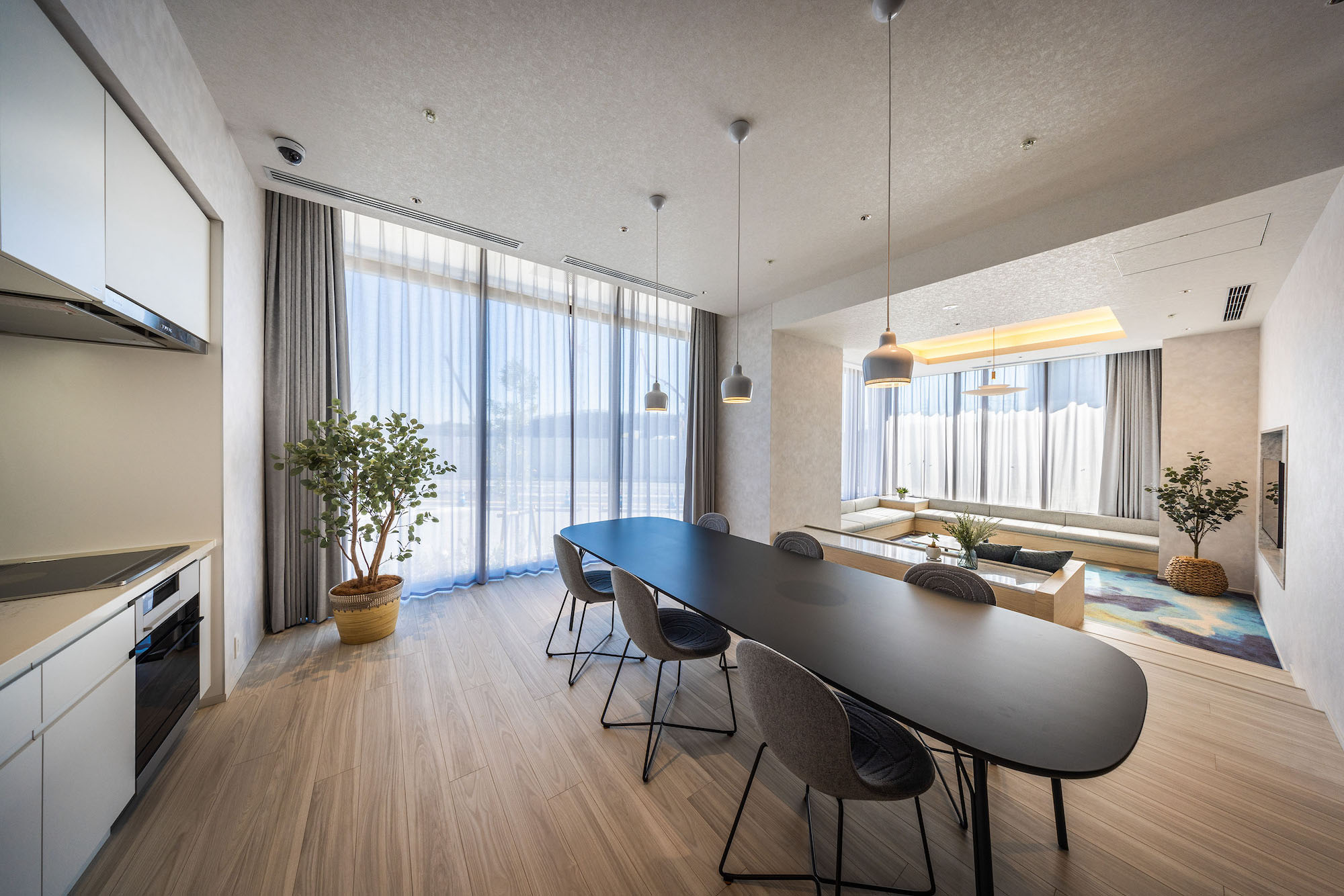 深海のように静かな世界。ゲストスーペリアに求めたのは、深まる時間に身を委ね、静寂の中で穏やかに過ごせる空間美です。大きく縁取られた窓辺には、小上がりのようなしつらえを。自由な姿勢で気ままにくつろげるスペースです。