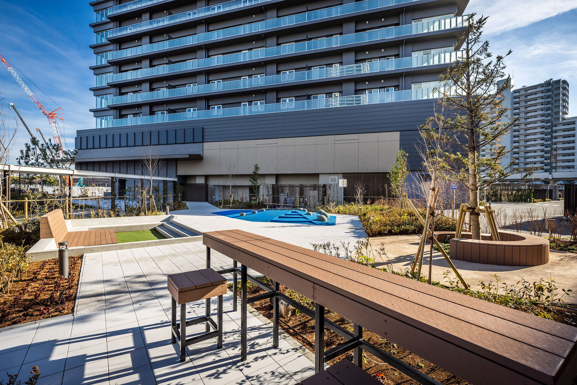 子どもたちが思い切り走り回り、安心して遊べるプライベートテラス。プレイロットとしてだけでなく、木陰で読書や青空の下でコーヒーブレイクなど、多彩な過ごし方ができる空間です。