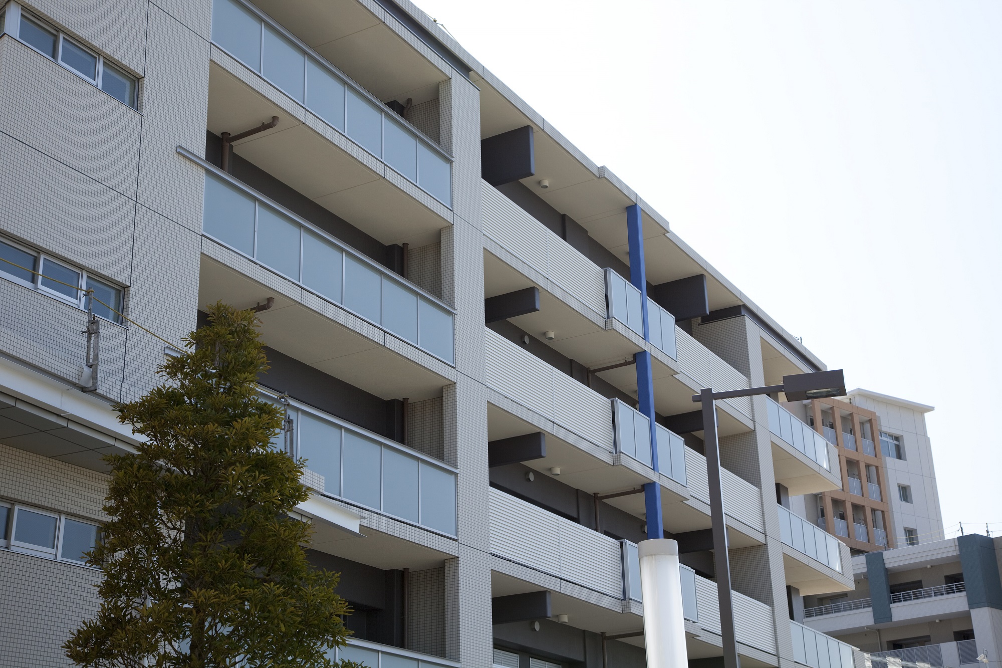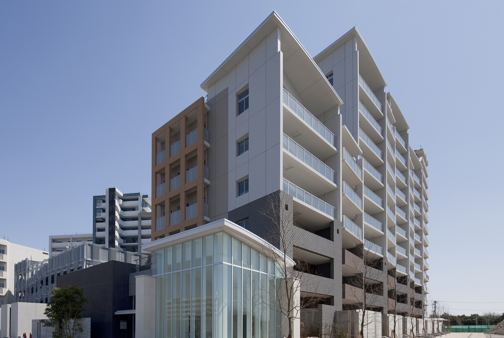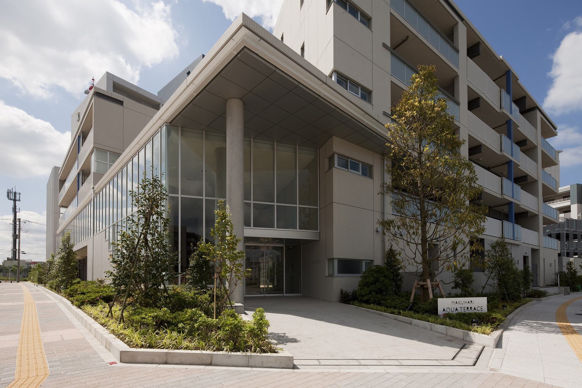 「幕張アクアテラス」は4つの住棟で構成されています。海の方向を望む「アクアレジデンス」は、中高層部の白とバルコニーのガラス手摺りが透明感を演出し、住棟上のアーチ形状の屋根が帆船のような優雅な印象。花見川に面した「キャナルレジデンス」は、オランダ・アムステルダムの「カナルハウス」をデザインモチーフに、色彩によってリズムや軽やかさとたくさんの人々が住まうコミュニティを表現しています。その2棟をつなぐ位置にある「ベイレジデンス」は、ガラスやタイルなどの素材を活かしたモダンでシンプルなデザインに。メッセ大通りから最初に出会う「ディアレジデンス」は、街区の顔として、白い外壁と凹凸、そしてエントランスからライブラリーへと外壁を覆うガラスウォールによって洗練された表情を見せています。