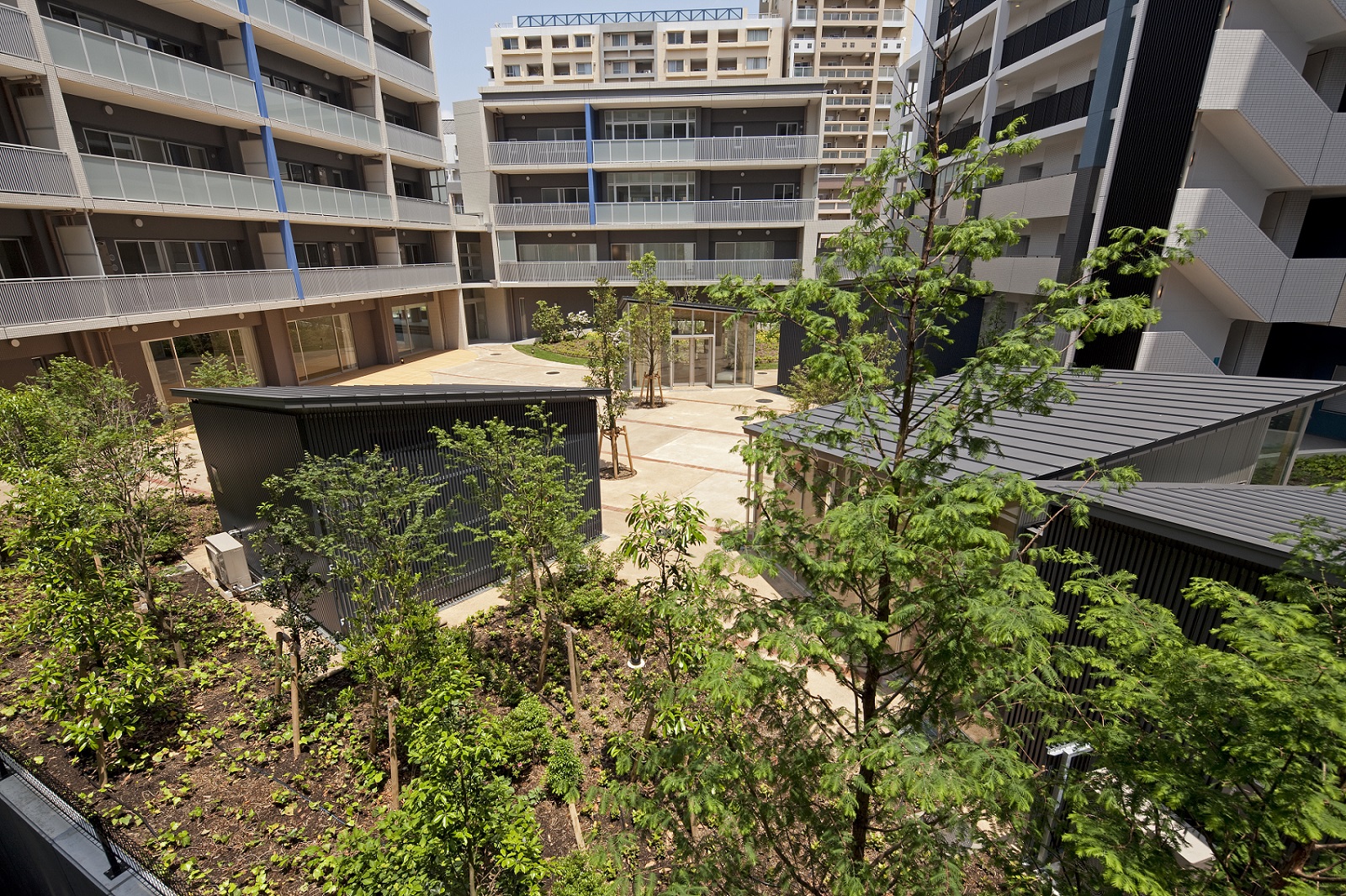 「幕張アクアテラス」には、集まって住む楽しさをより深める、さまざまな共用施設が用意されています。その中心となるのが、中庭「キューブガーデン」。ワクワクが詰まったいくつものキューブは、自然の温もりや和みを感じさせる木造建築で、大人も子どもも遊びや憩いを楽しめる空間です。他にも、「ディアレジデンス」には「コムホール(キッズルーム兼集会室)」や「コムライブラリー」、「アクアレジデンス」にはパーティールームやゲストルームとして使える「アクアスイート」などが設けられています。