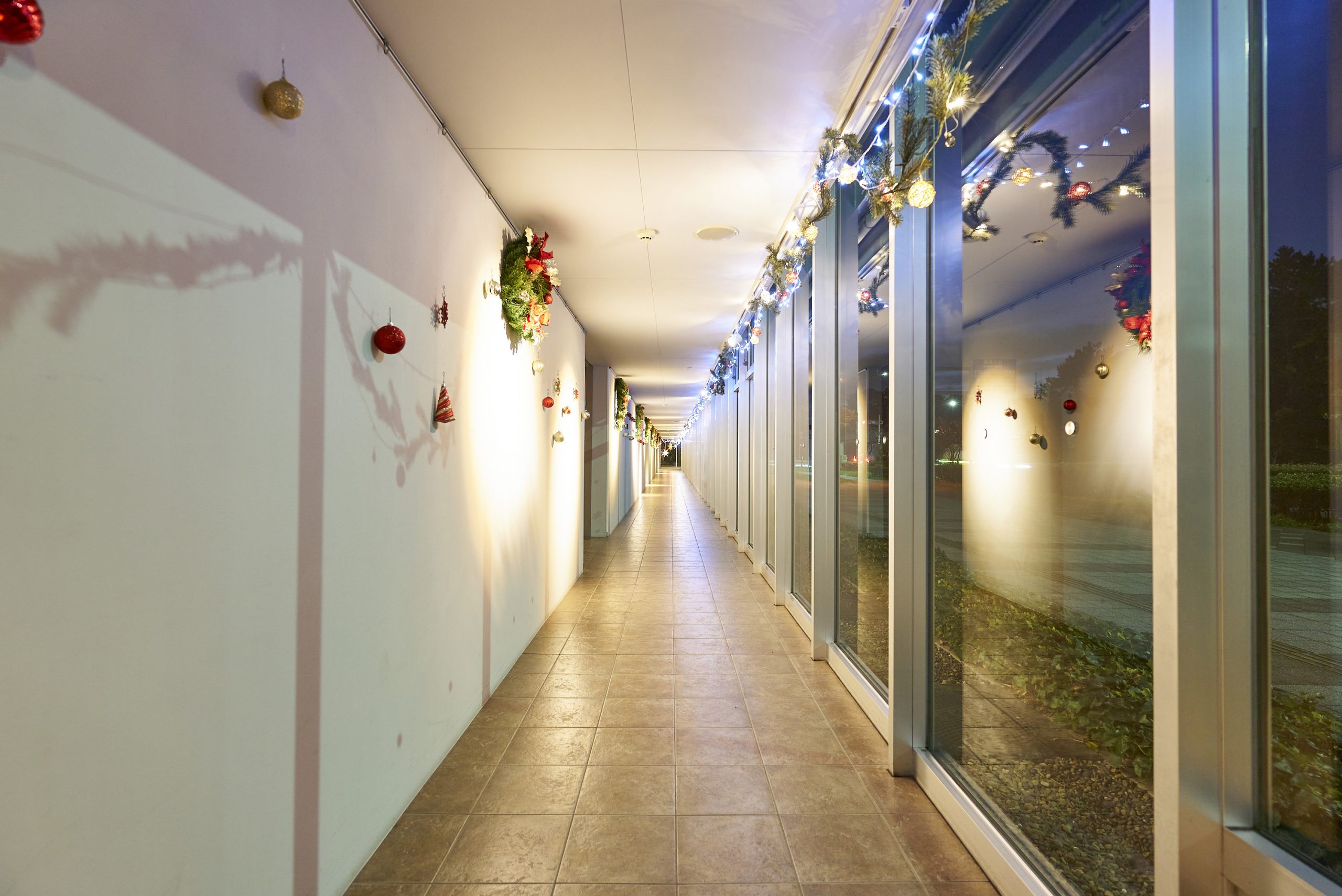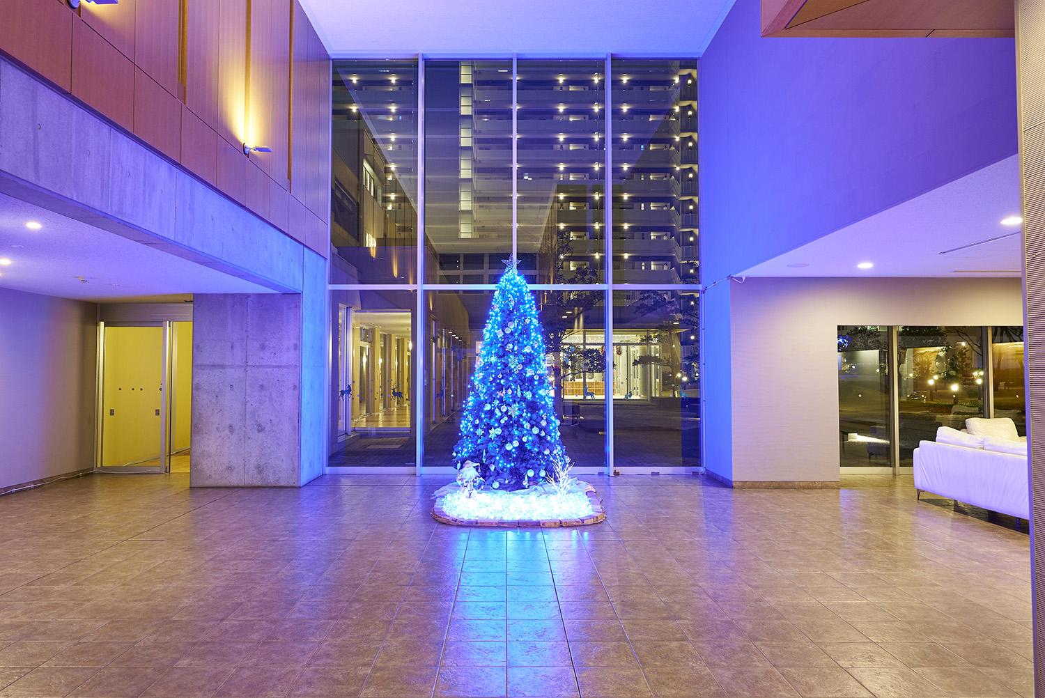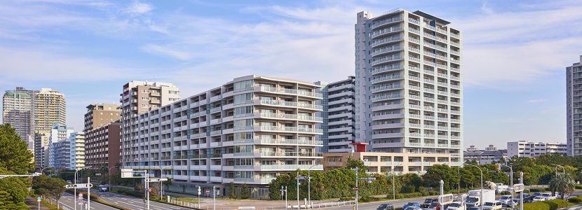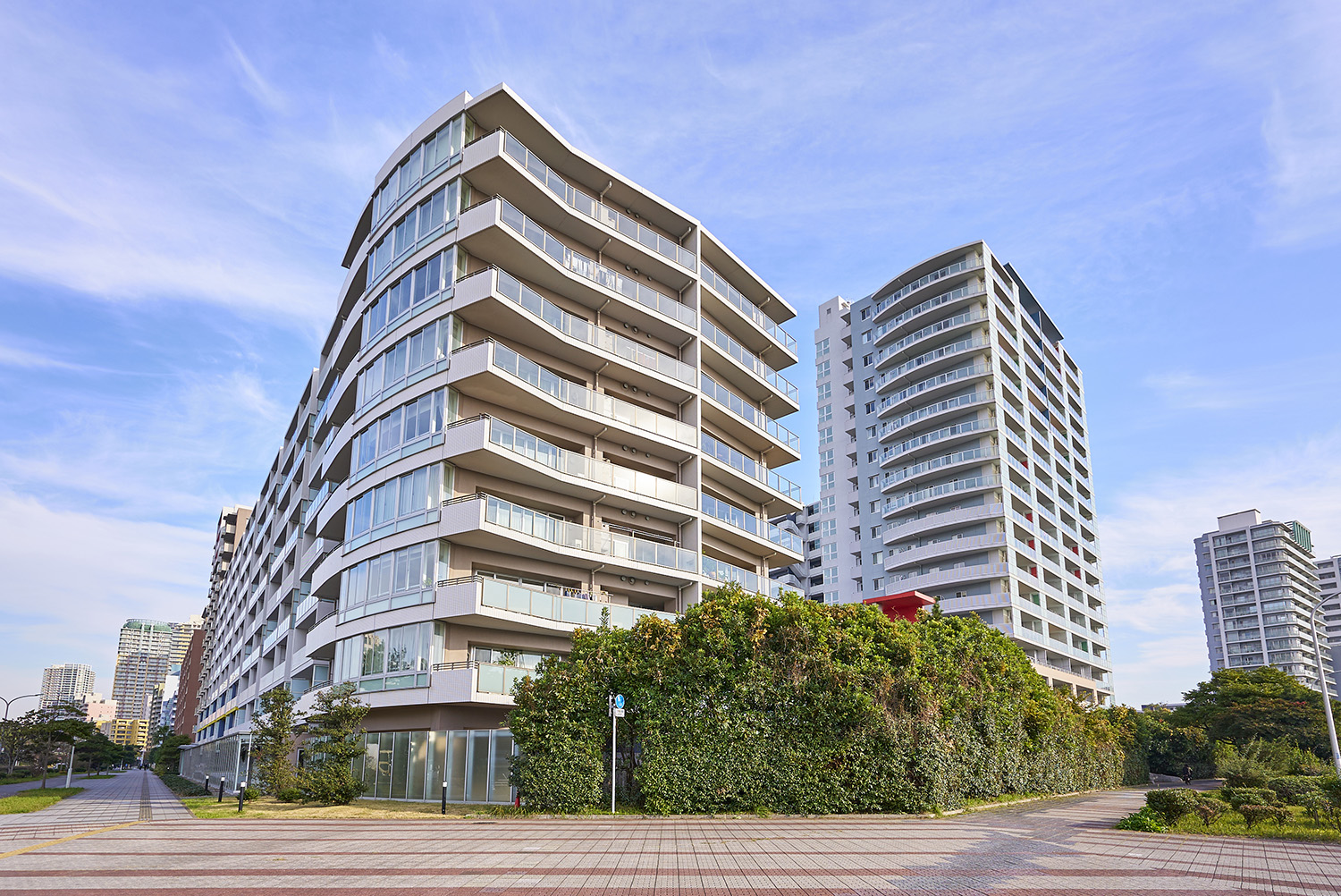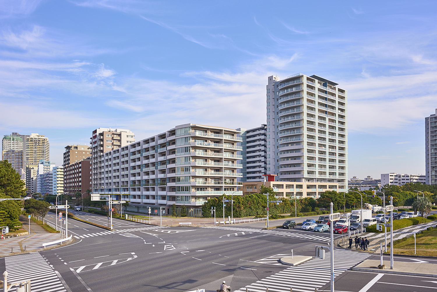 建物コーナー部分の曲線を描くガラスウォールがベイタウン入り口のアイキャッチにもなっている「パークレジデンス」。「街に向かって開く」をテーマとし、ガラス張りの共用廊下「アートコリドー」を設けて通りや見浜園の緑との一体感をデザインしています。