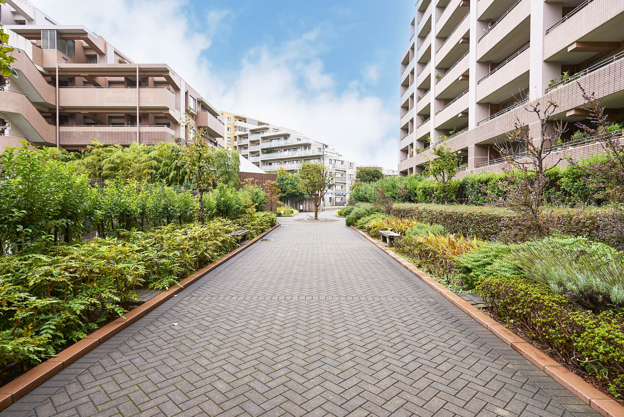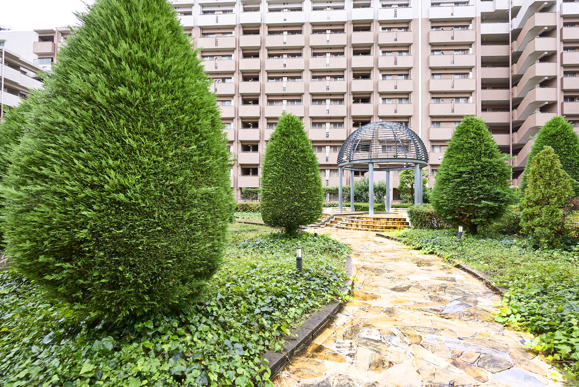 また、広大な敷地には、ゆったりと住棟が配置され、さらに駐車場の上部を屋上庭園として活用することによって約1万㎡にも及ぶオープンスペースが創出されています。ヨーロッパの伝統的な風景式庭園をモチーフに、シンメトリーな美しさを見せる滝や幾何学的に配された樹木など、水と緑と建築が一体となった様式美の香るランドスケープです。