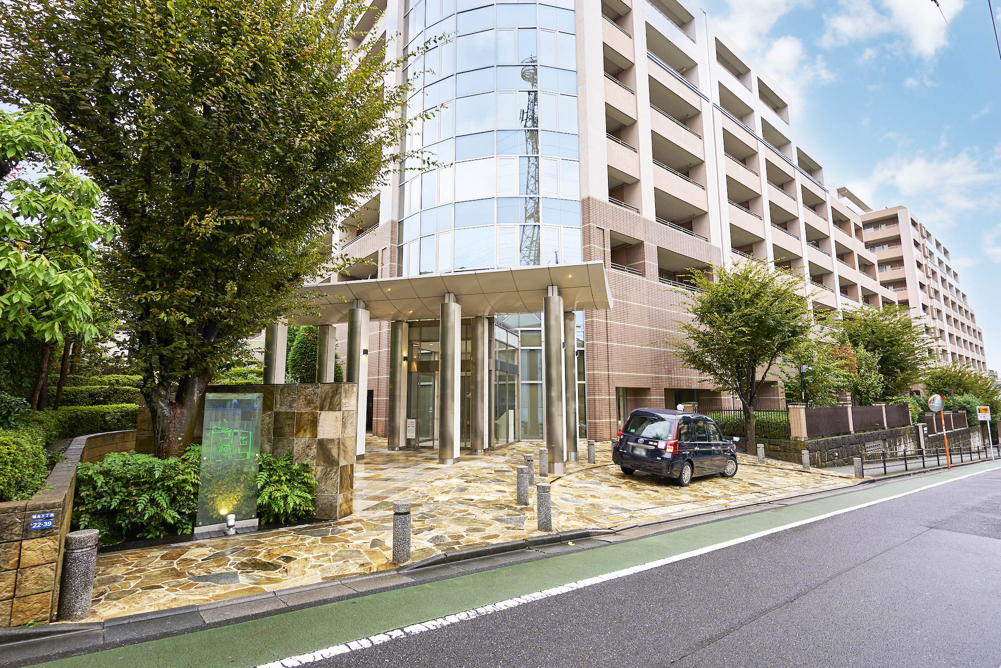 西から東へ、そして南西から北東へとなだらかに傾斜する起伏に富んだ地勢を意識し、トップに向かって山並みのようなスカイラインを描く美しい2つの住棟がデザインされています。アウトフレームの躯体構造により、骨太の柱が連なり、朝に、夕に、彫りの深い陰影を創出。地上13階・14階建てのフォルムは、中低層の家々が並び立つ街に雄壮な風景を出現させます。南東角のメインエントランス部には、R形状のガラスカーテンウォールを採用するなど、地域の街並み景観に豊かで洗練された印象をもたらす外観デザインです。