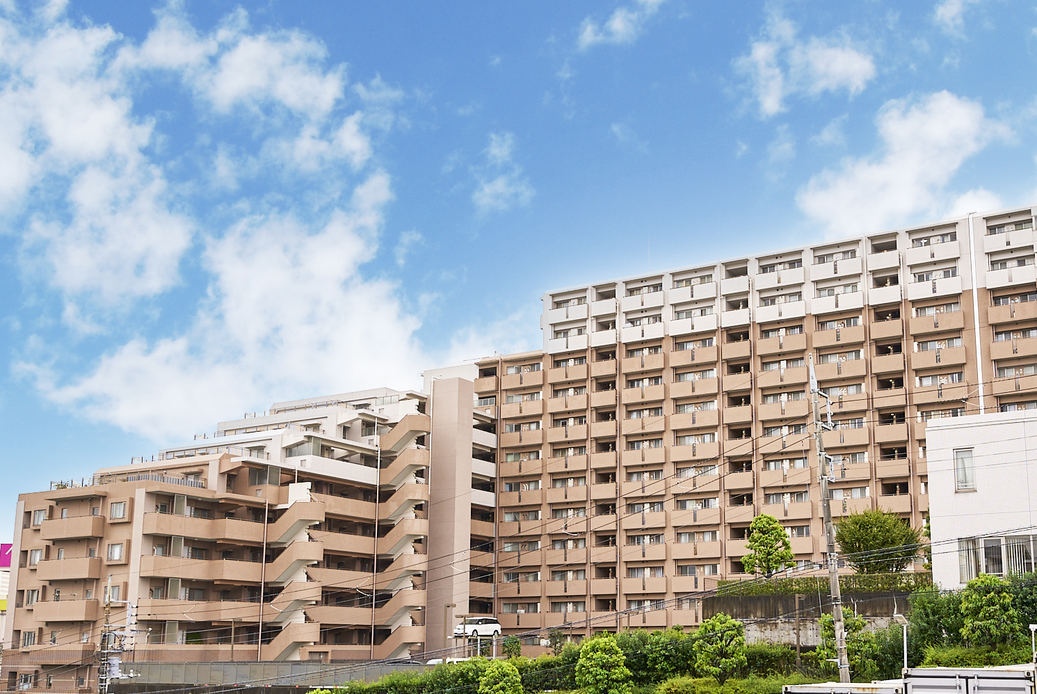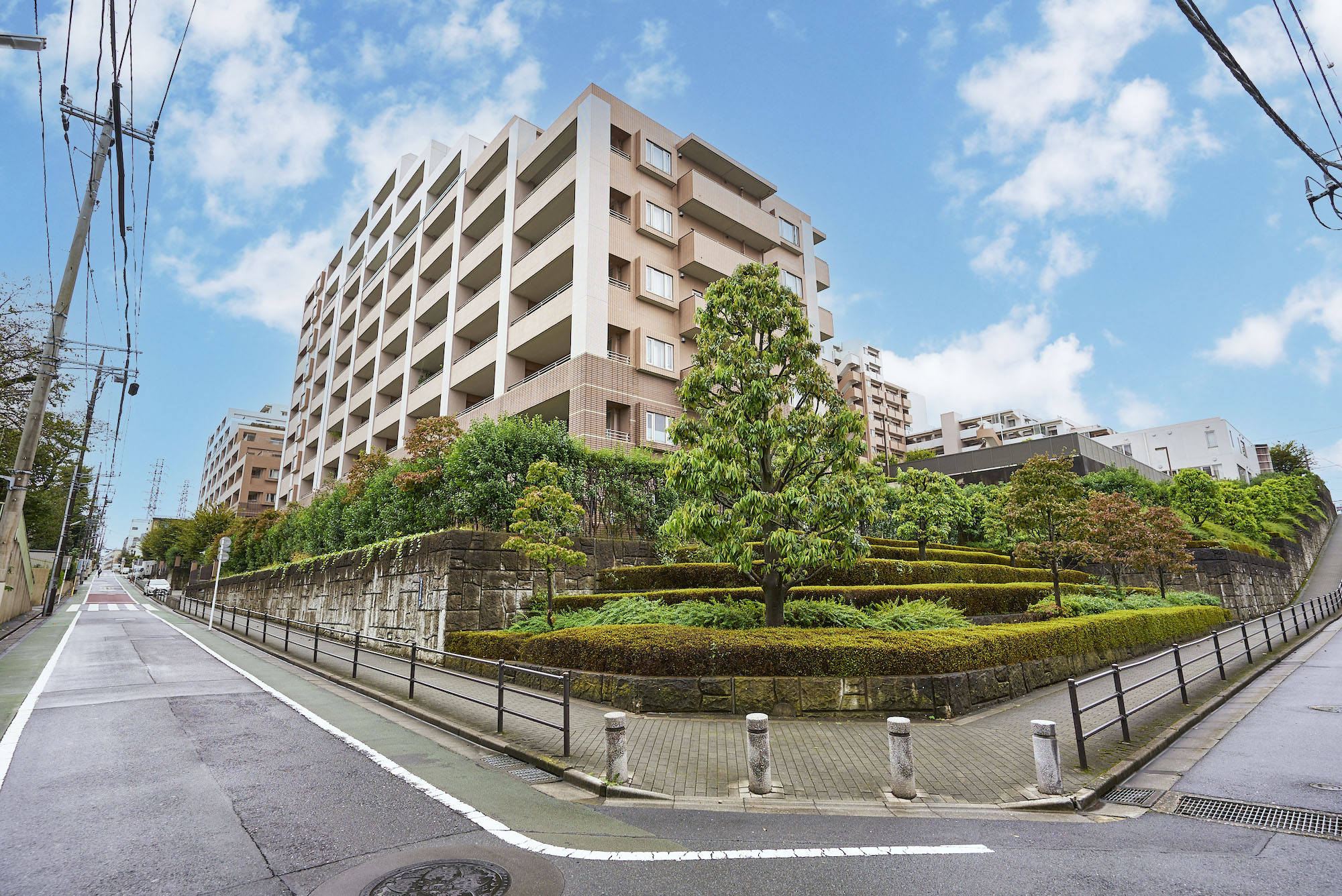 西から東へ、そして南西から北東へとなだらかに傾斜する起伏に富んだ地勢を意識し、トップに向かって山並みのようなスカイラインを描く美しい2つの住棟がデザインされています。アウトフレームの躯体構造により、骨太の柱が連なり、朝に、夕に、彫りの深い陰影を創出。地上13階・14階建てのフォルムは、中低層の家々が並び立つ街に雄壮な風景を出現させます。南東角のメインエントランス部には、R形状のガラスカーテンウォールを採用するなど、地域の街並み景観に豊かで洗練された印象をもたらす外観デザインです。
