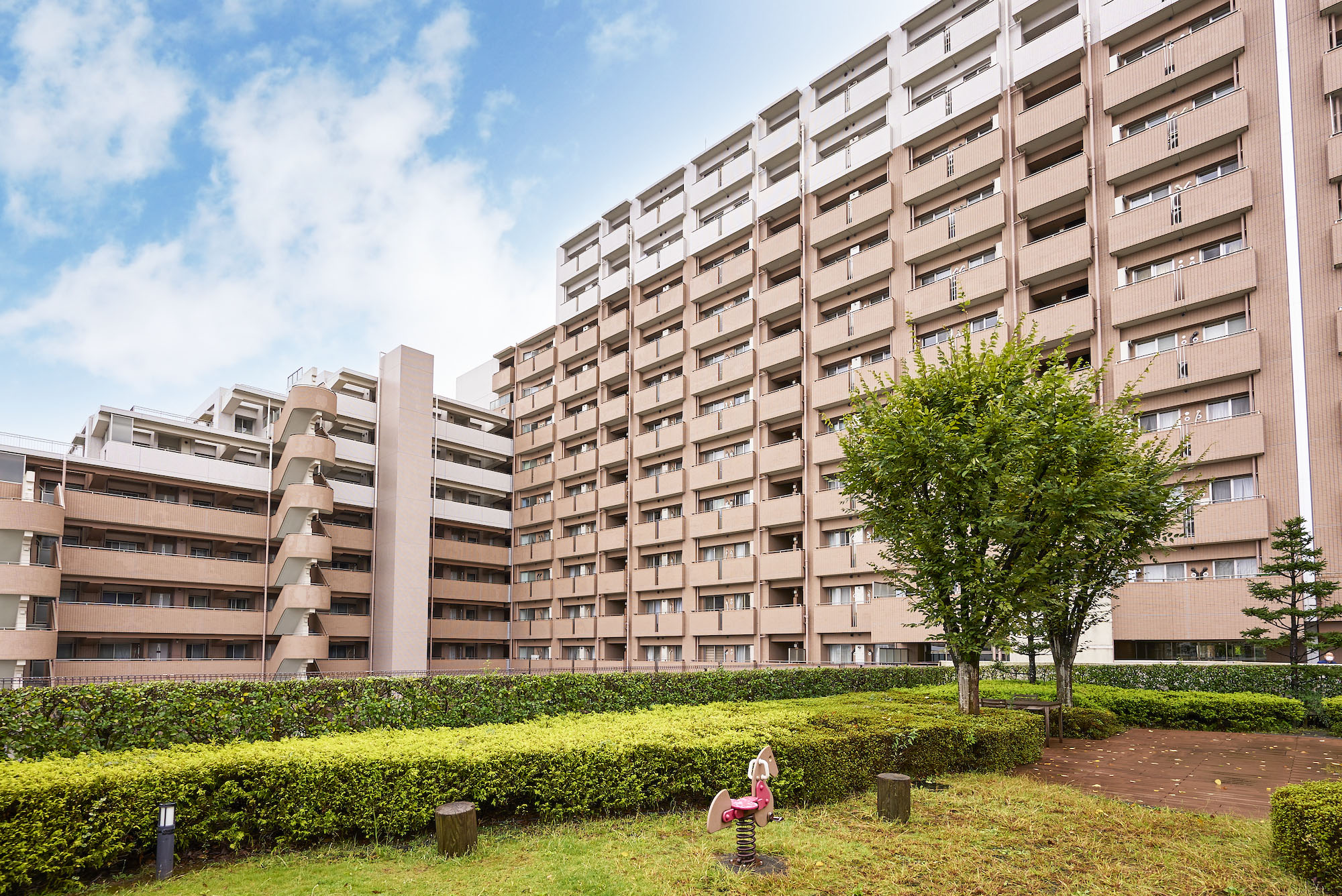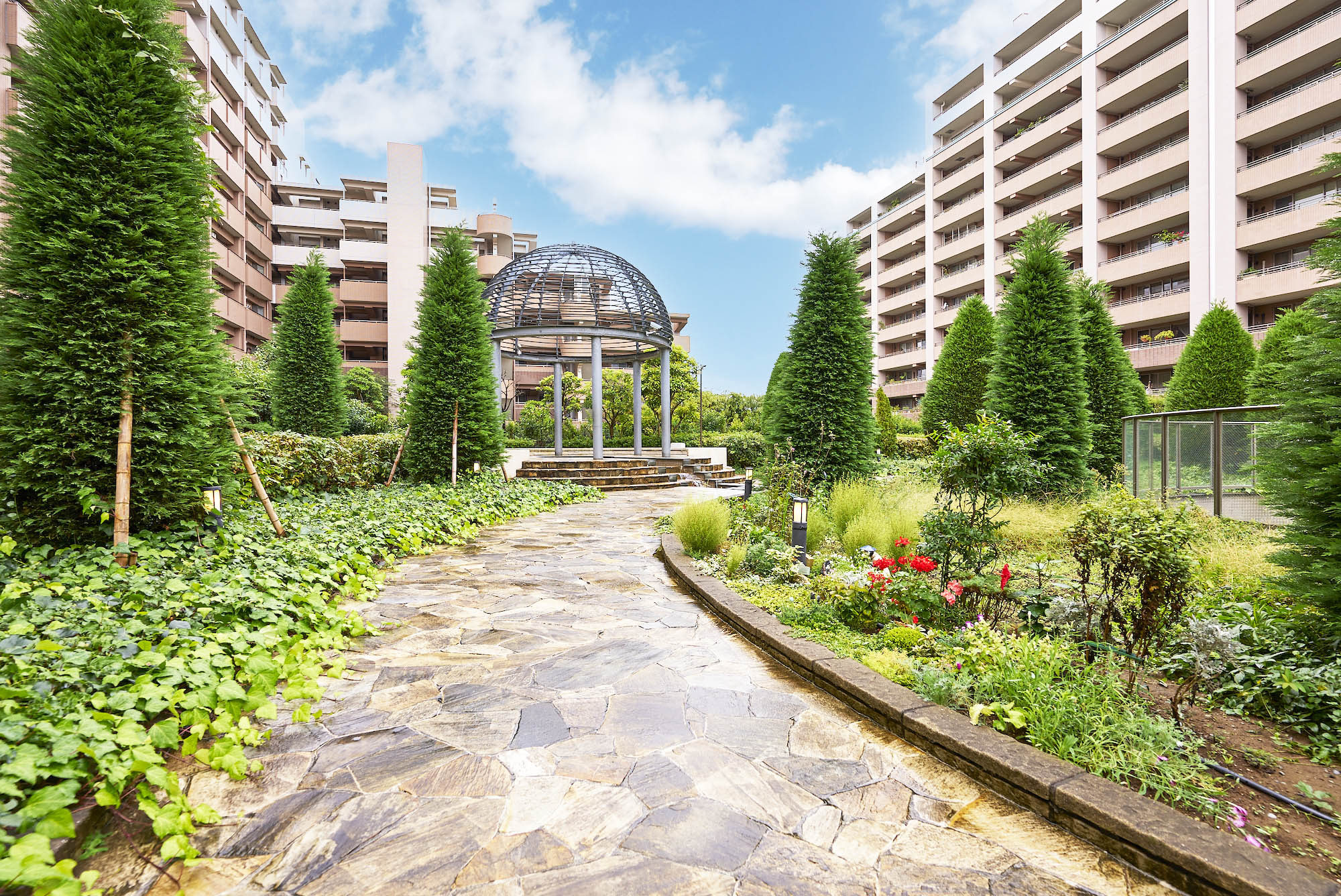 また、広大な敷地には、ゆったりと住棟が配置され、さらに駐車場の上部を屋上庭園として活用することによって約1万㎡にも及ぶオープンスペースが創出されています。ヨーロッパの伝統的な風景式庭園をモチーフに、シンメトリーな美しさを見せる滝や幾何学的に配された樹木など、水と緑と建築が一体となった様式美の香るランドスケープです。