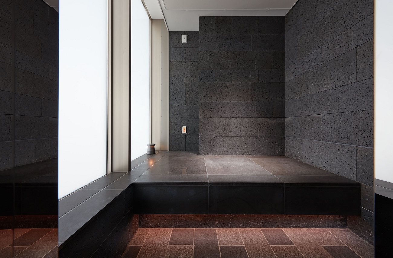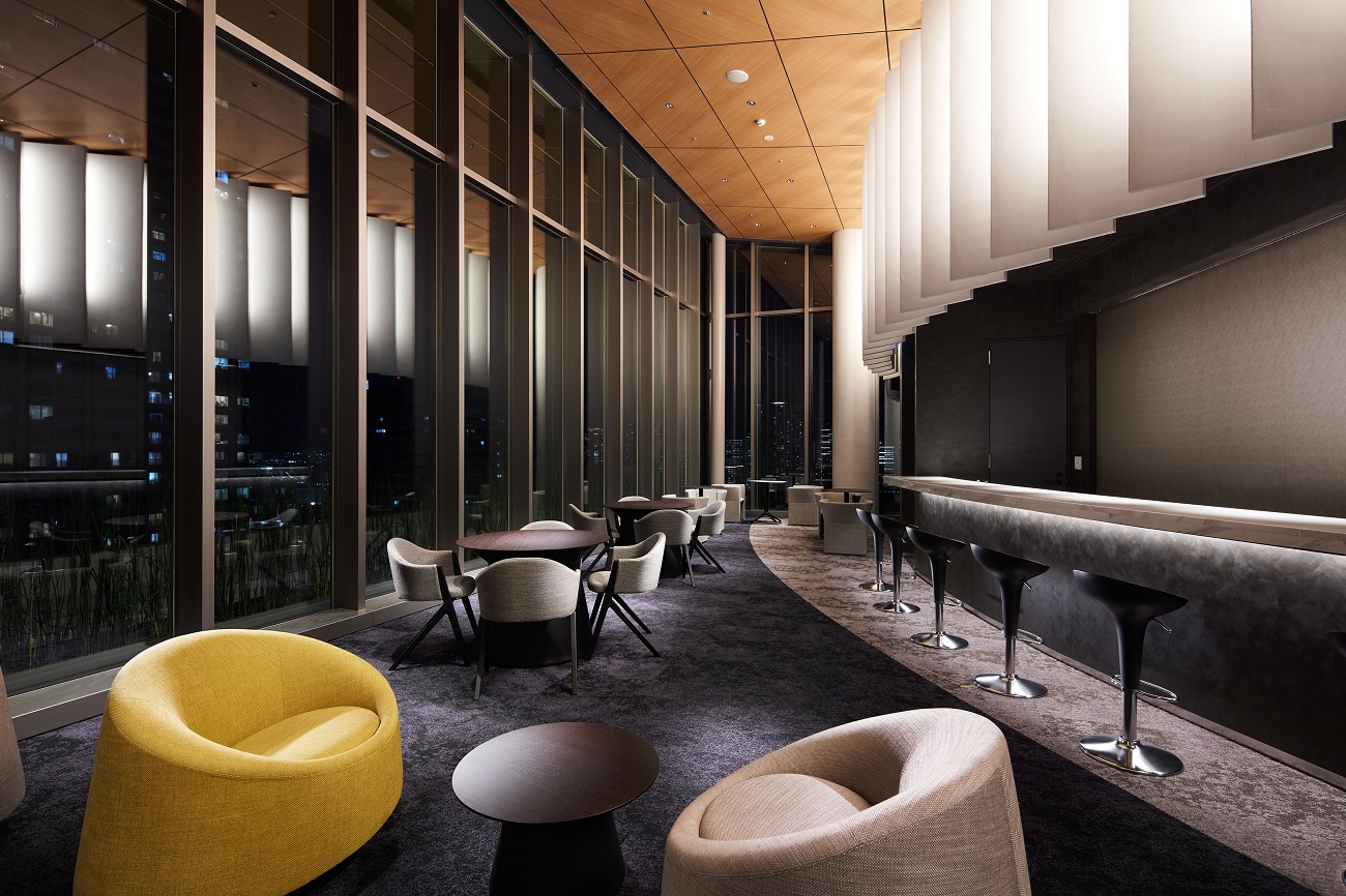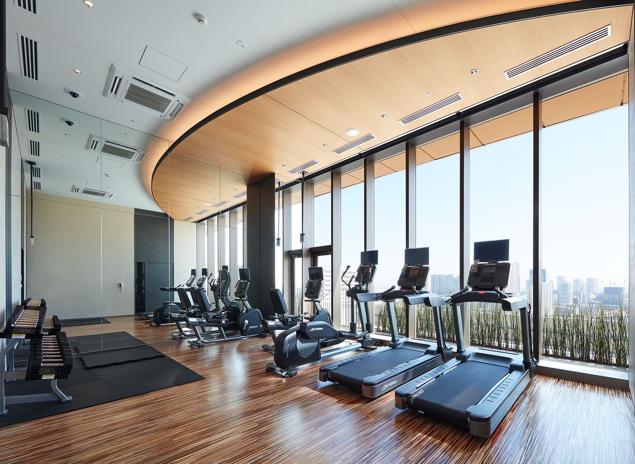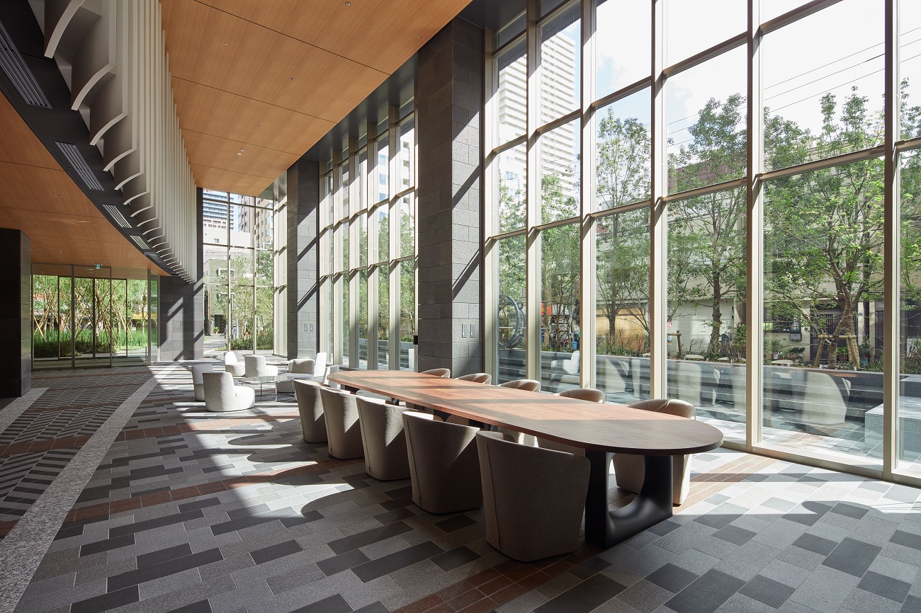 共用スペース 都心の日常を上質に潤す場所 ガラスウォールの先に水盤と緑を望む、2層吹き抜けのラウンジで、語らいや読書のひとときを愉しむ。上質と開放感を併せ持つ日常が、外から内へ、内から外へ、気持ちをやわらかに切り替える。 スカイラウンジ ラウンジ フィットネススタジオ 岩盤浴 ゴルフレンジ