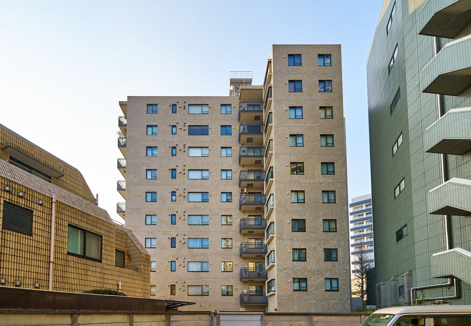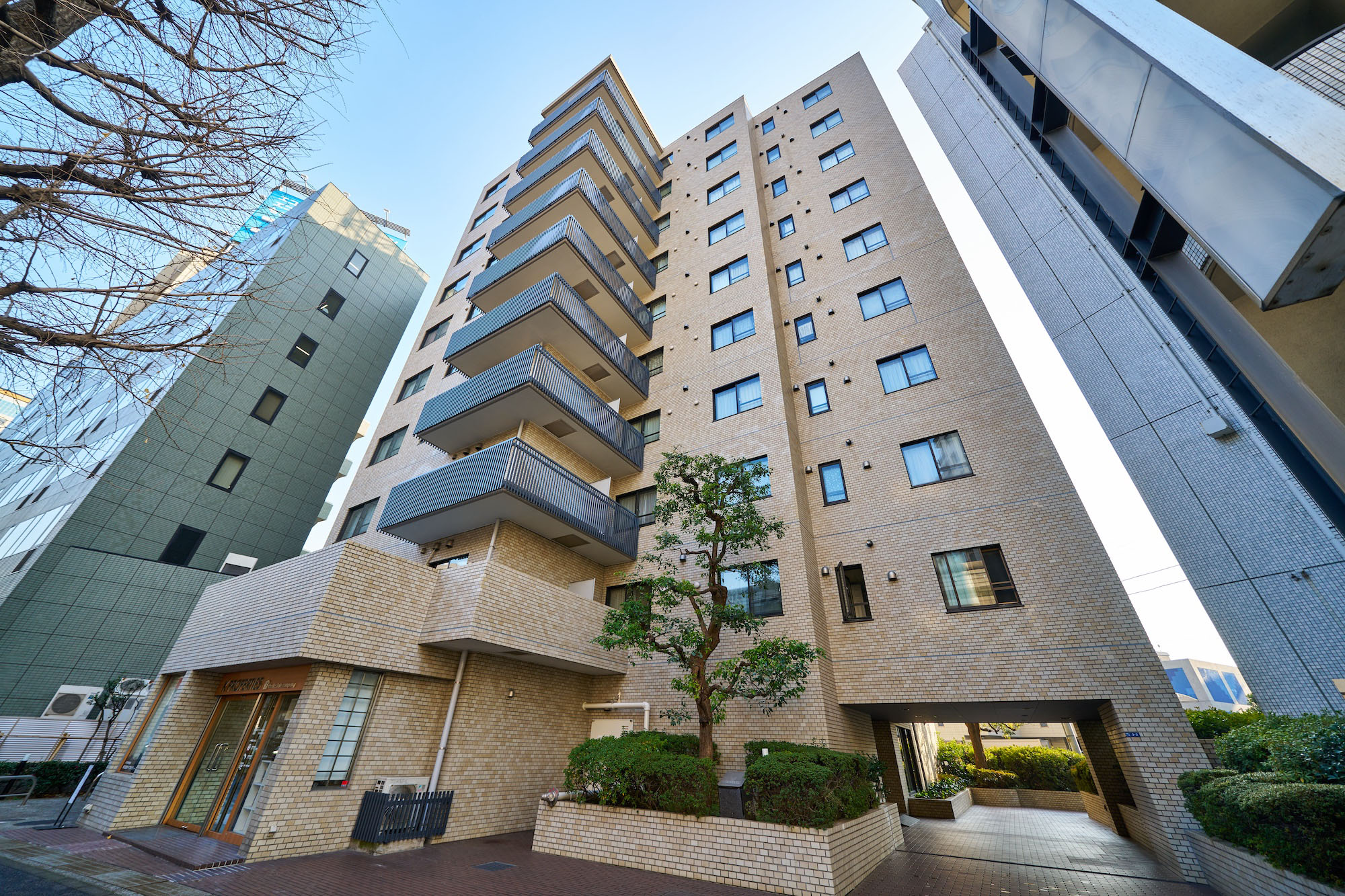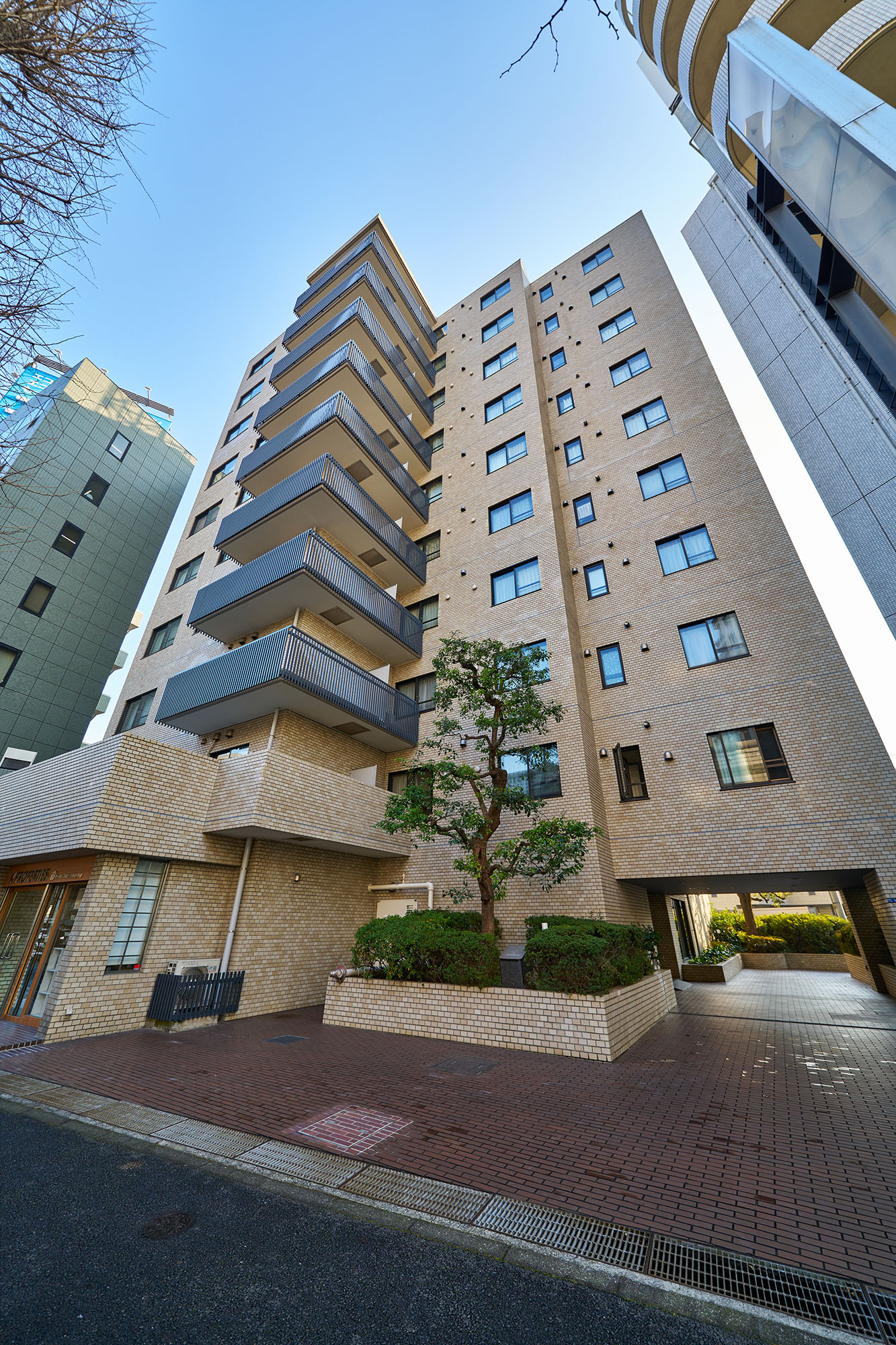 明るいべージュ色の総タイル貼り、10階建の変化に富んだ外観は、重厚さと洗練された趣きを感じさせます。エントランスアプローチには、タイルを敷き込み、豊かな植栽が施され、なごやかな表情を創出。優しい気品につつまれた、南青山にふさわしい佇まいです。