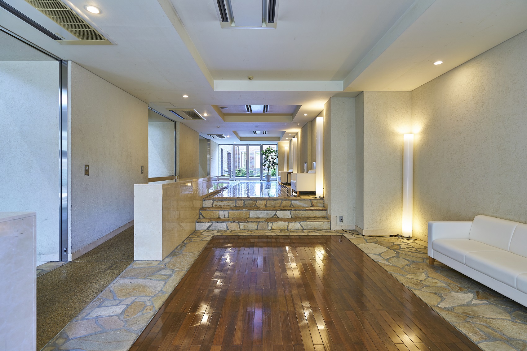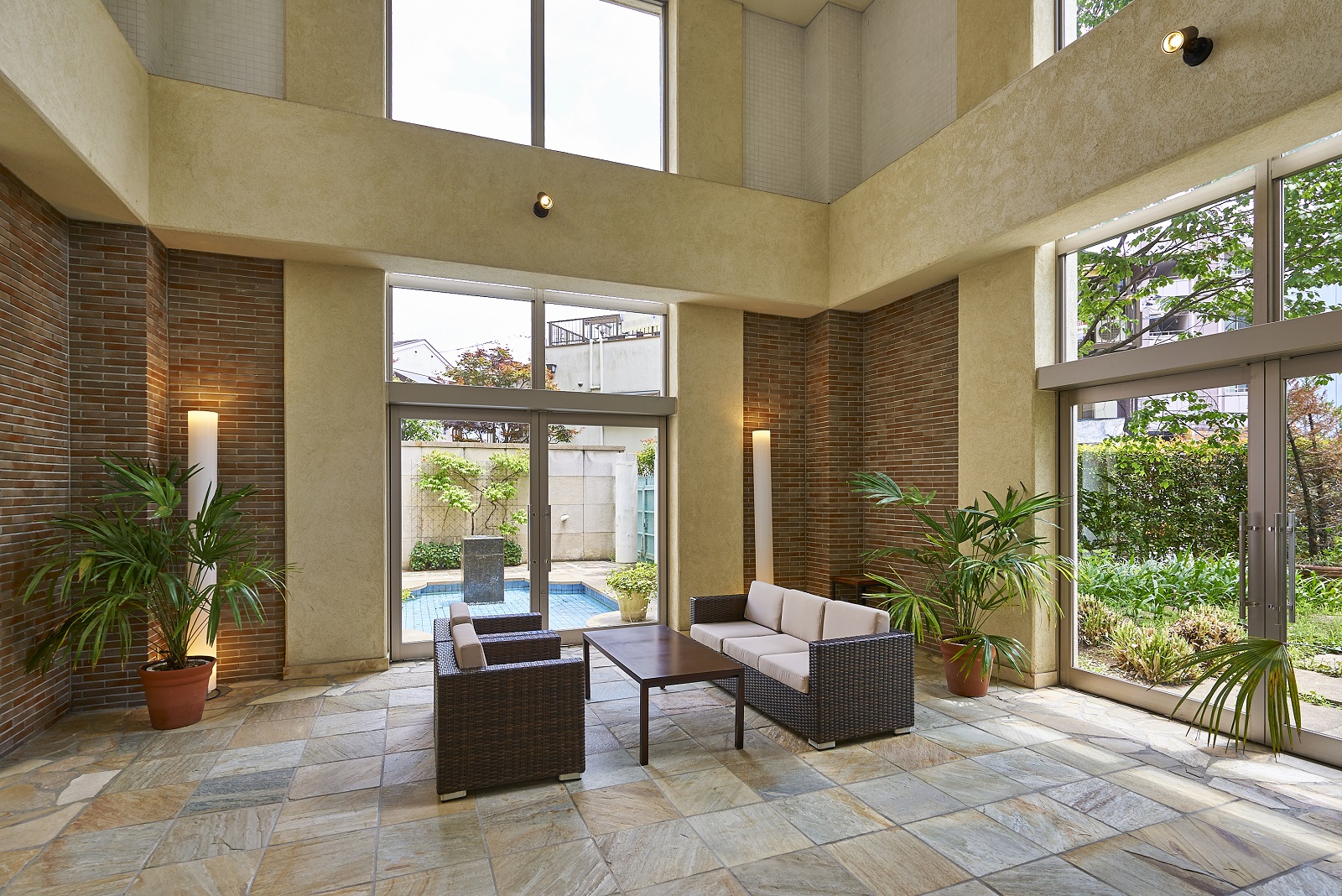 中庭から爽やかな自然光が差し込む2層吹き抜けの大空間。フロントサービスのカウンターがあり、共用施設の予約はもちろん、クリーニングサービス、伝言預かり、宅急便や交通チケットの手配といった、ホテルライクなサービスが用意されています。
