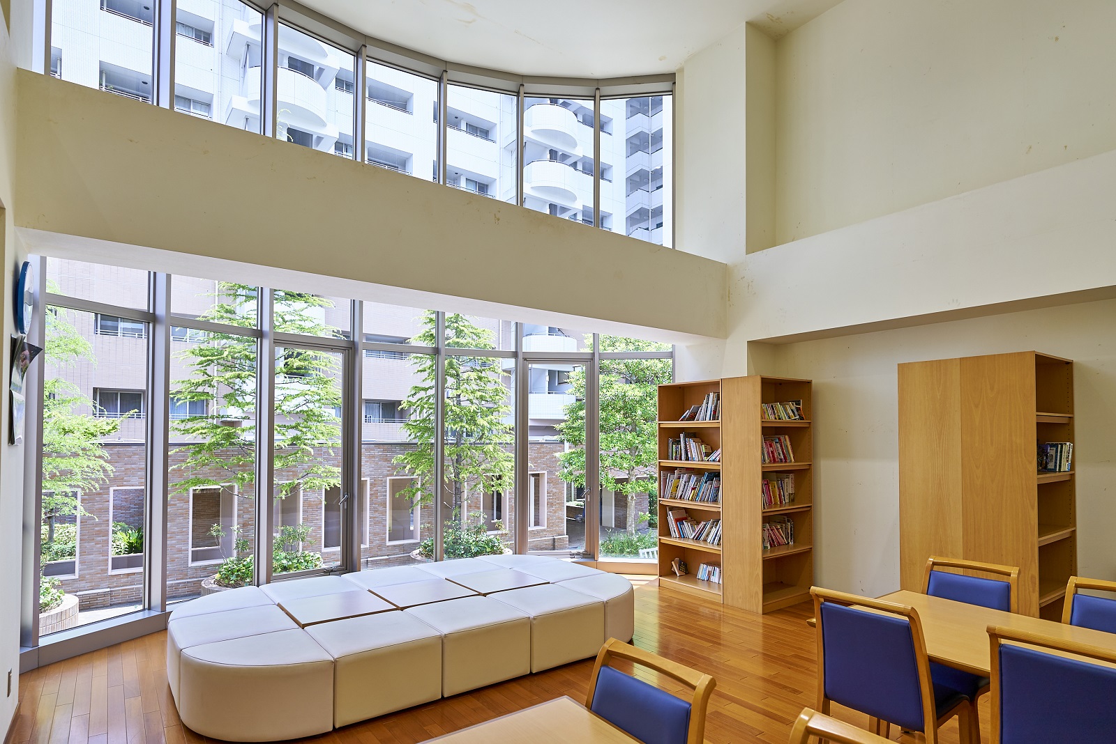 スタディルームや閲覧室として気軽に利用できるスペース。やわらかな陽射しが心地よい、2層吹き抜けの空間です。
