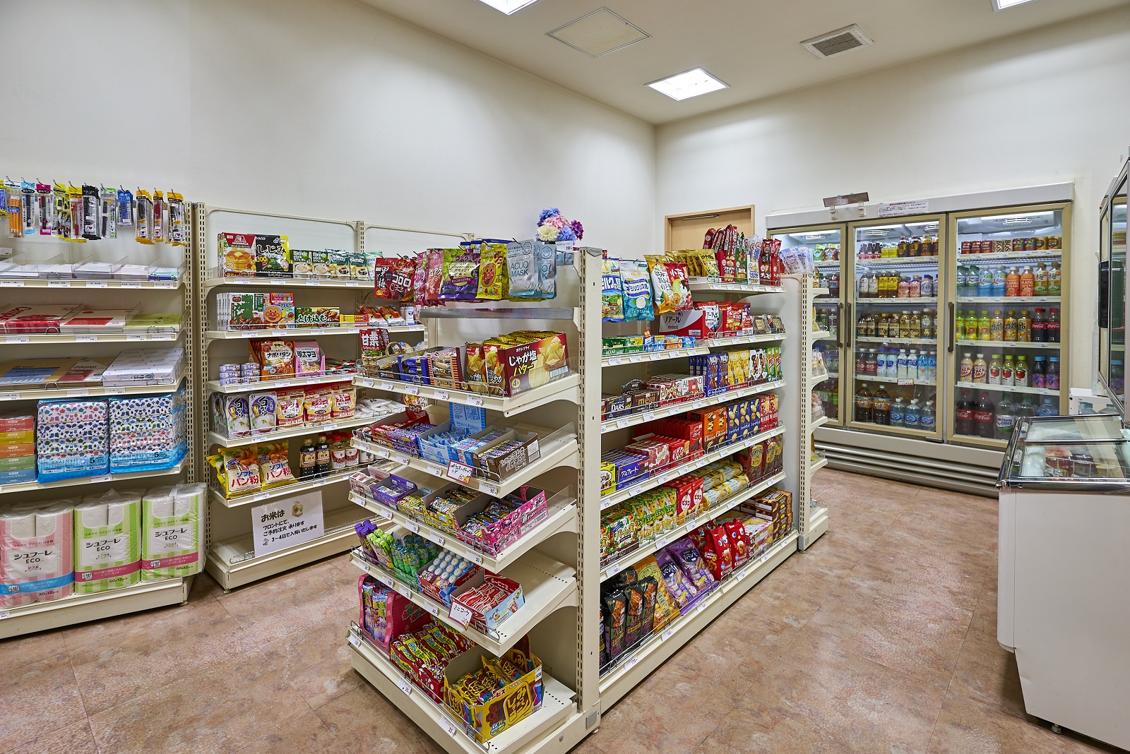 フロントの奥には、便利なミニコンビニが設けられており、日常生活に欠かせない必需品が揃っています。雨の日などでも、気軽にちょっとした買い物を済ますことができて便利です。