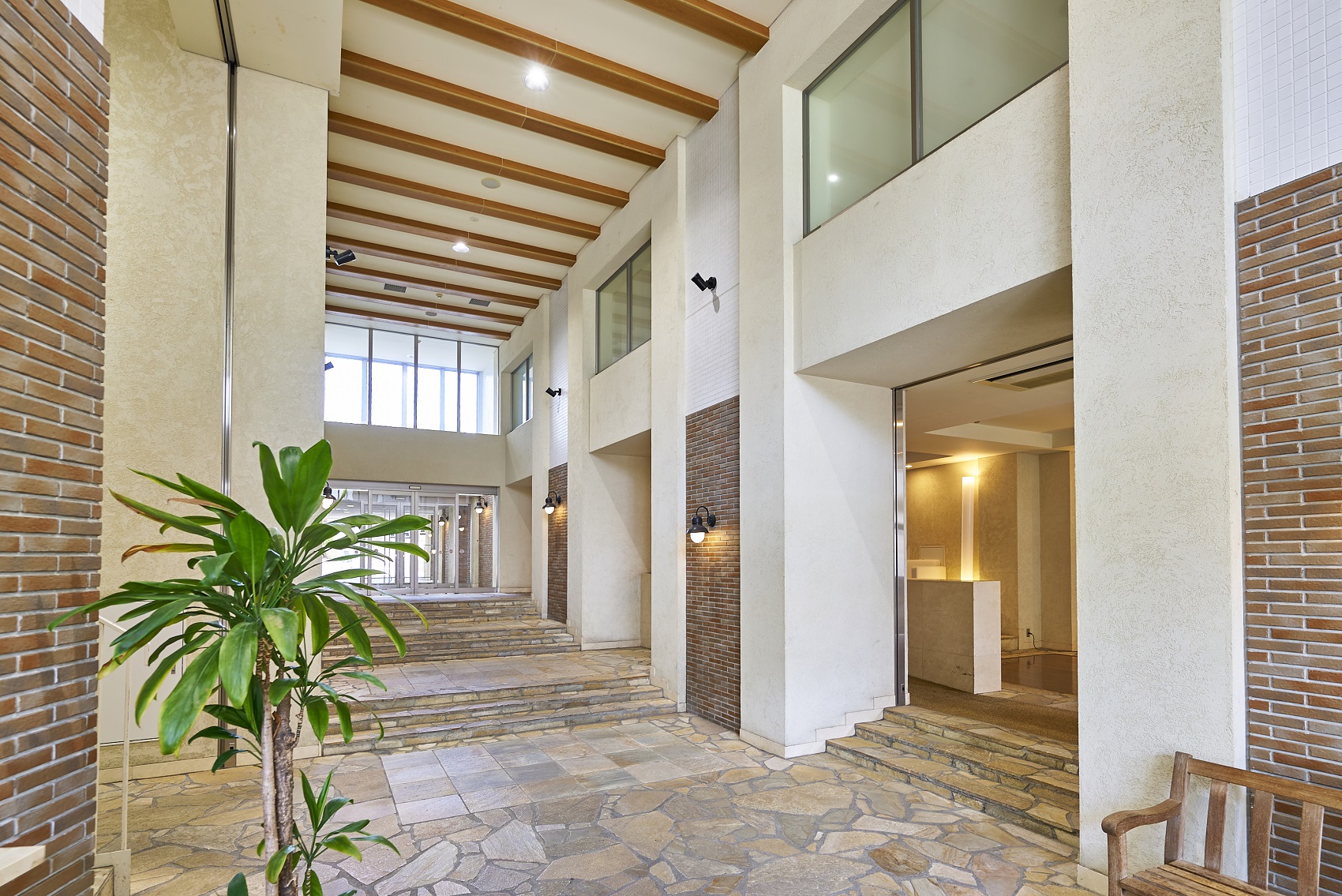 メインエントランスを進むと、右手にあるのはリゾート感覚いっぱいのラウンジ空間。2層吹き抜けのダイナミックな大空間を、ガラス窓からの光が満たしています。