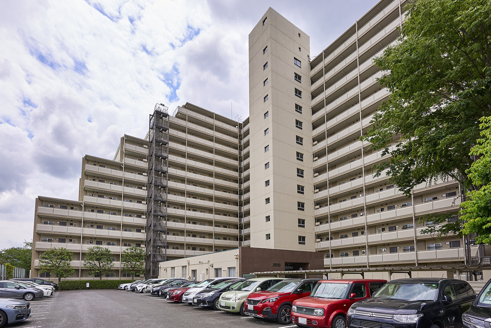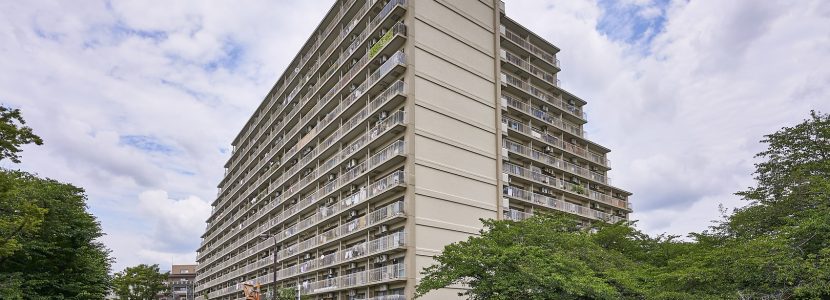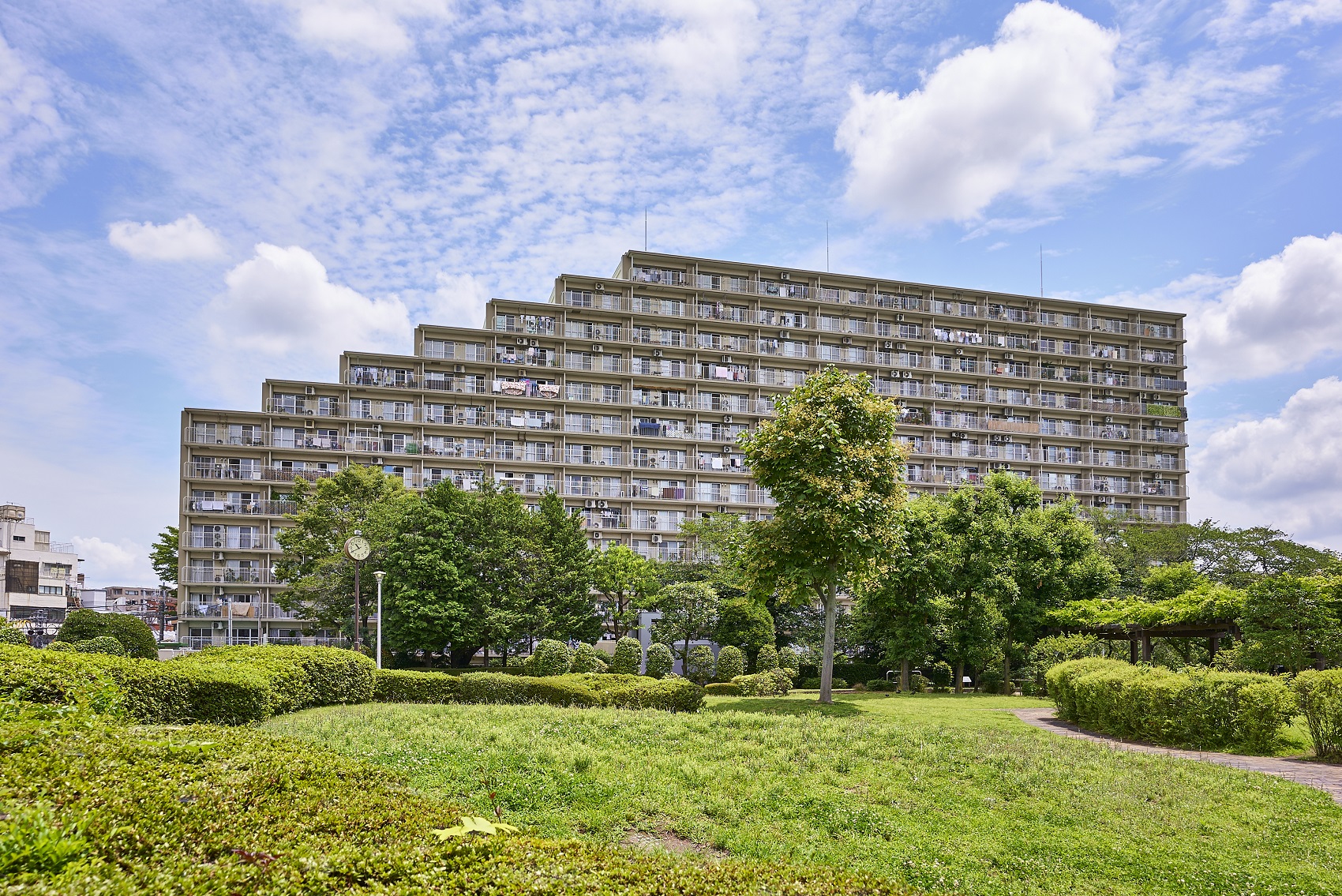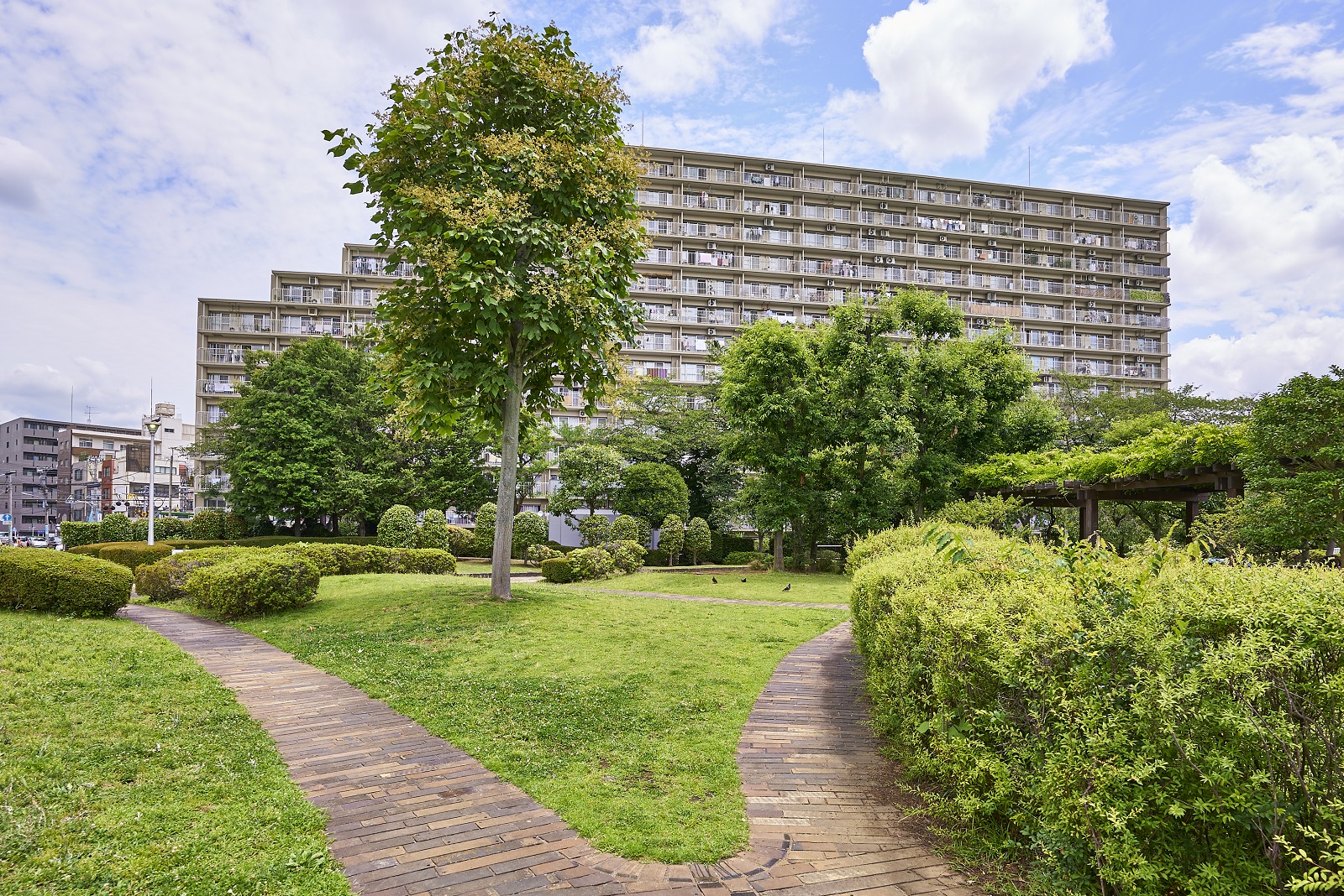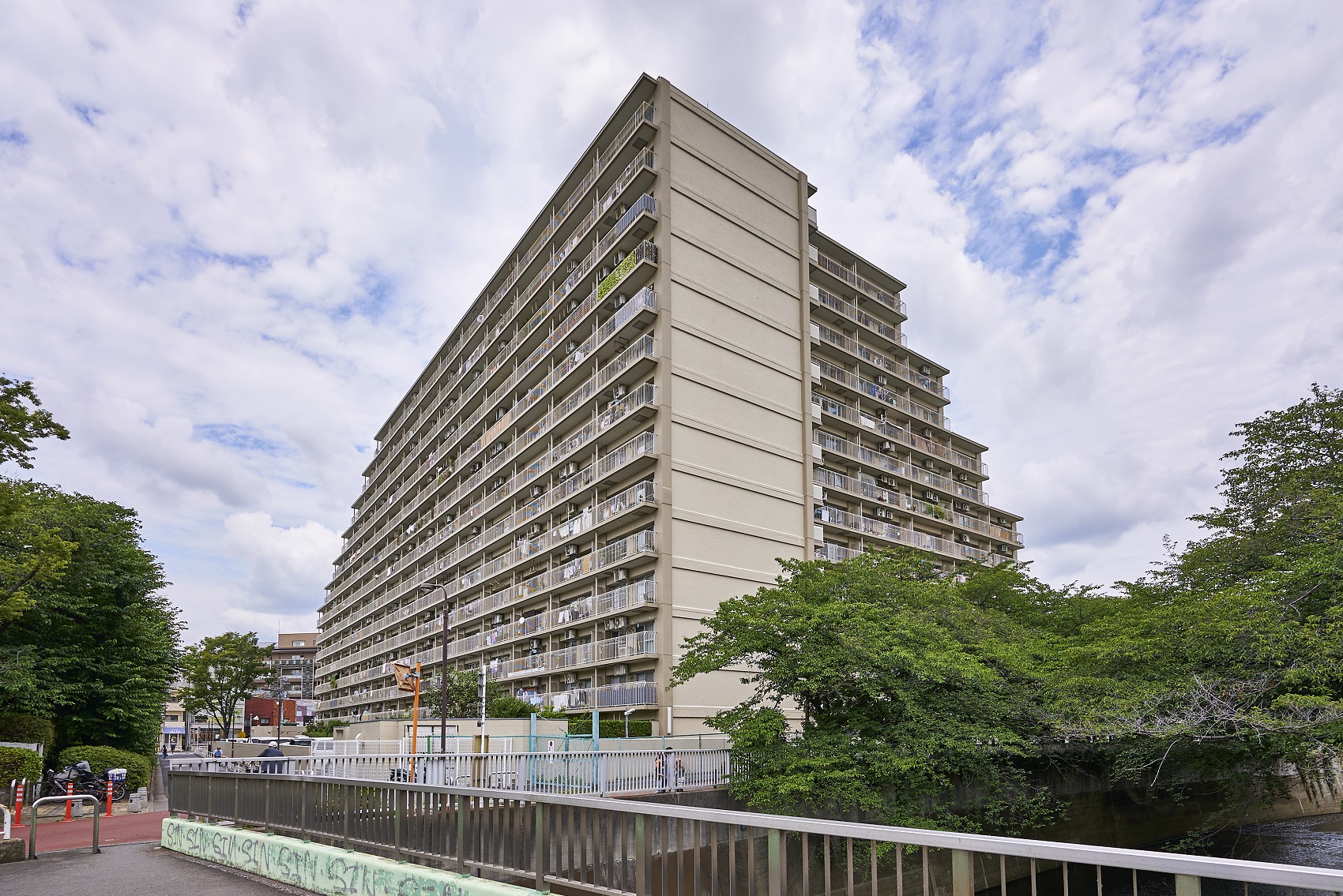 下落合の駅前に広がる6000㎡超の敷地に、約64%の空地率をもった都心では数少ないマンション。敷地の南西側には広大な区立公園、東側には神田川が流れているため、周囲の建物との距離が保たれ遮るものがなく、豊富な陽光と爽やかな風を採り入れることができます。街の風景に溶け込む、ナチュラルカラーでシンプルな外観です。