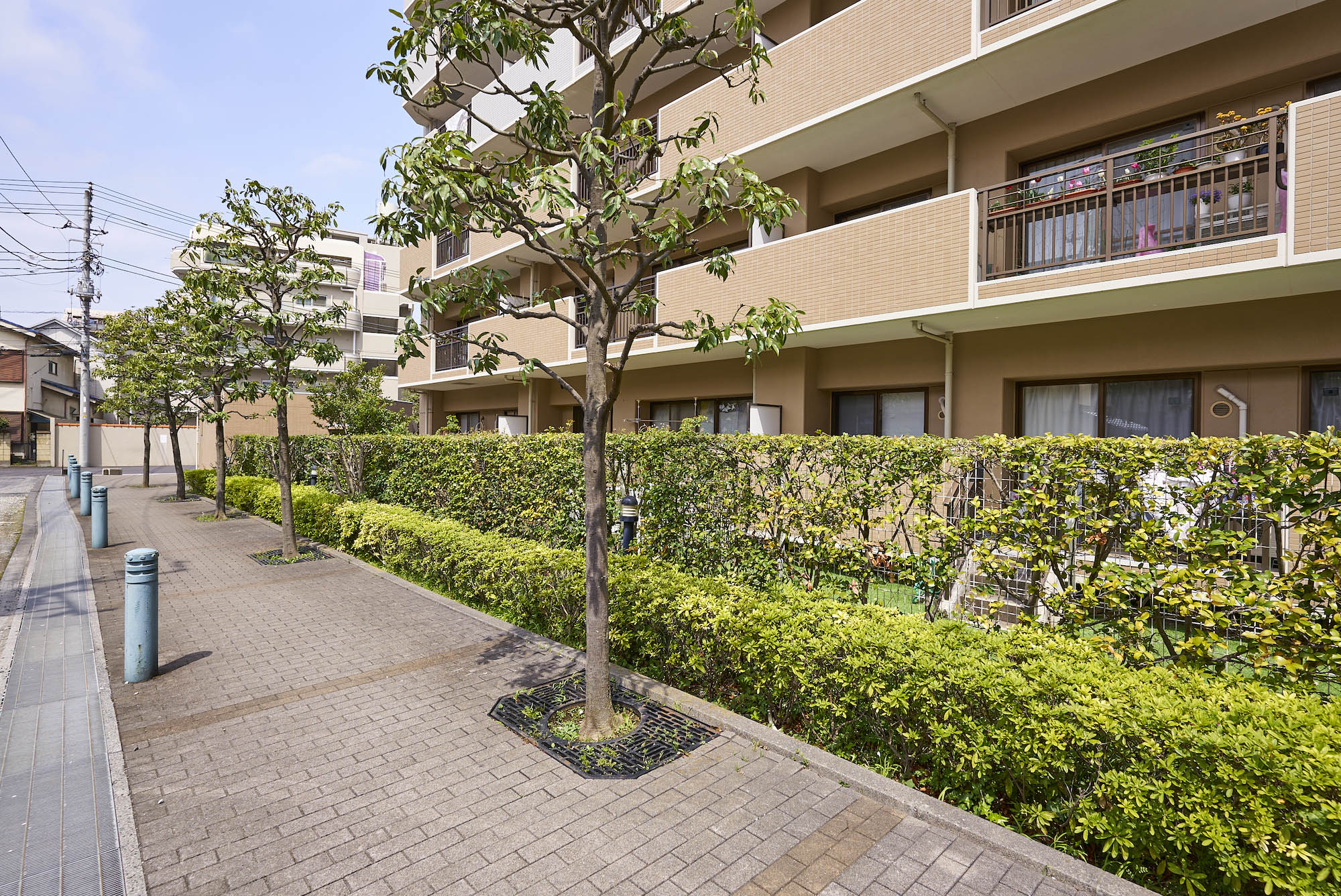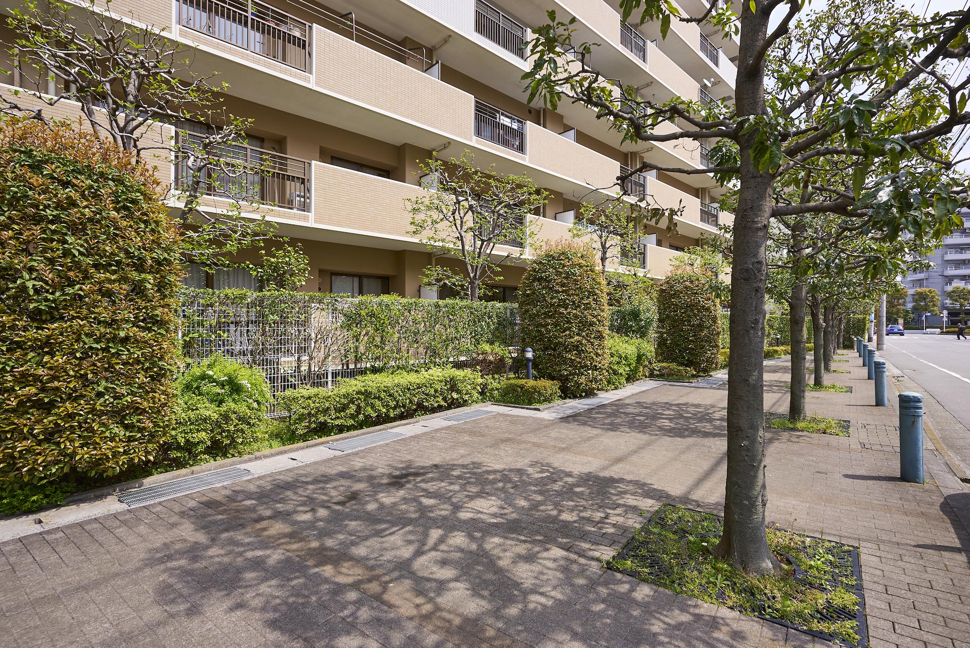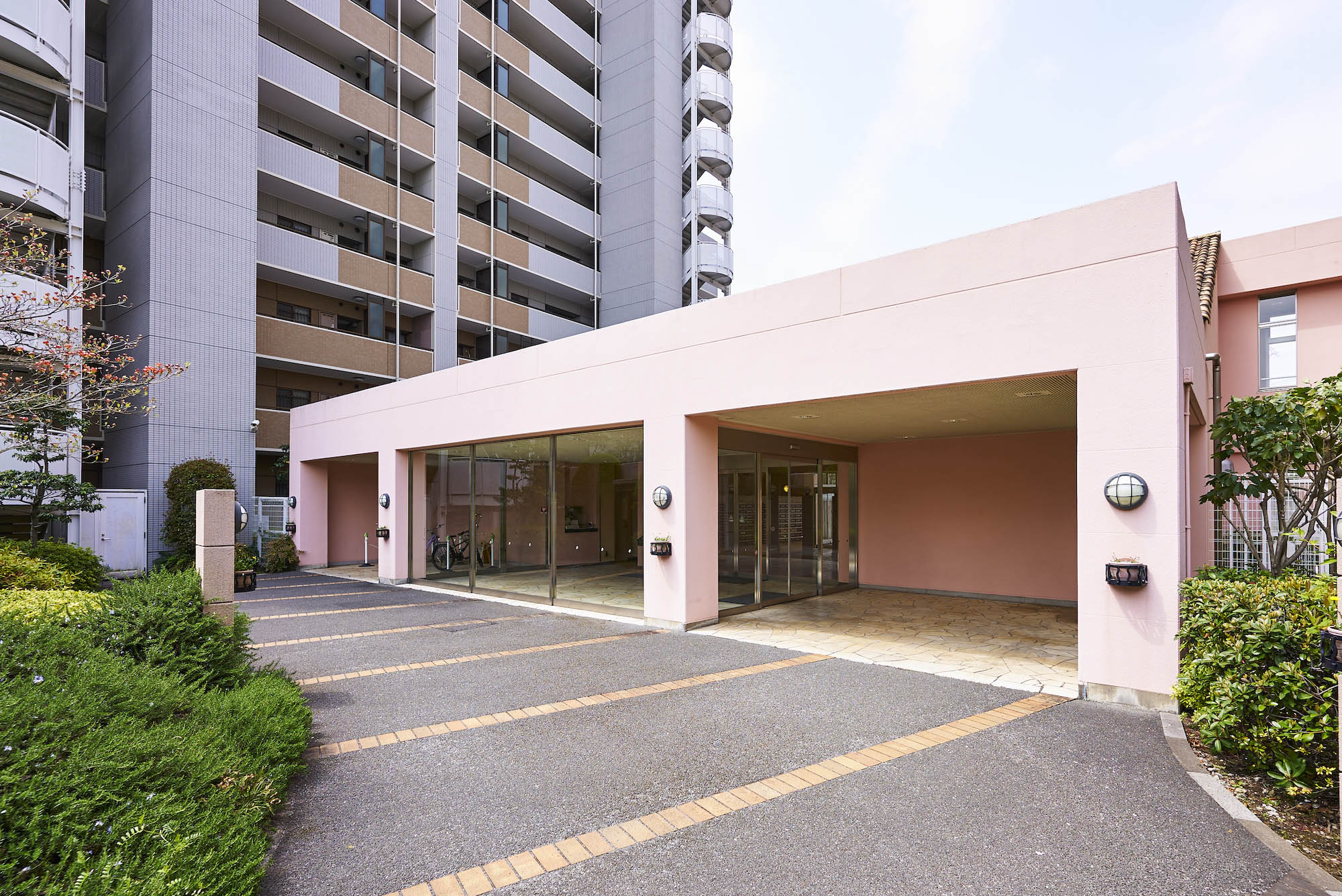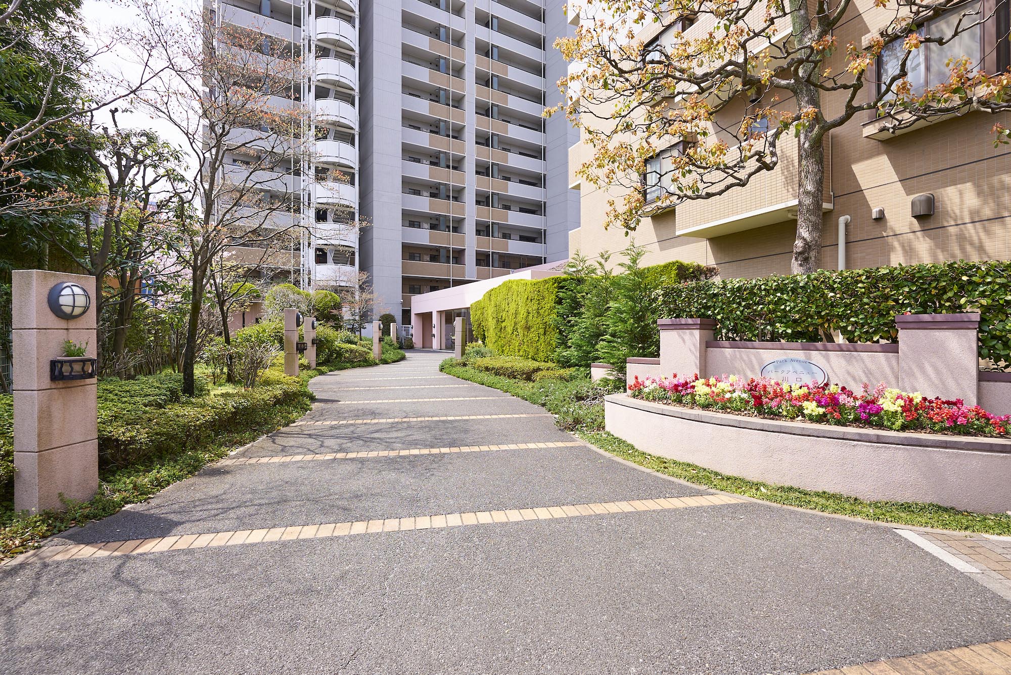 「パークアベニュー川口」は、駅前から続く川口西公園に隣接した、全戸南向き、総戸数177戸のビッグコミュニティです。約5,500㎡の広い敷地には、アベニューサイド棟とパークサイド棟の2つの住棟を配し、各住戸への採光性と通風性にすぐれた心地よいレイアウトを実現。公園の豊かな自然に加え、オープンスペースには季節を感じさせる植栽が豊富に施されています。住まいの顔として、エントランスは洗練された趣を感じさせるデザインに。屋根にスペイン瓦を用いるなど、南欧風の明るく心地よい意匠が施されています。