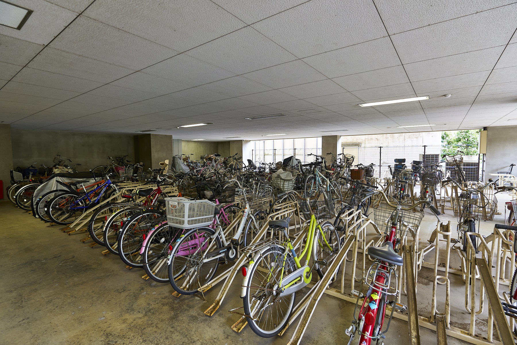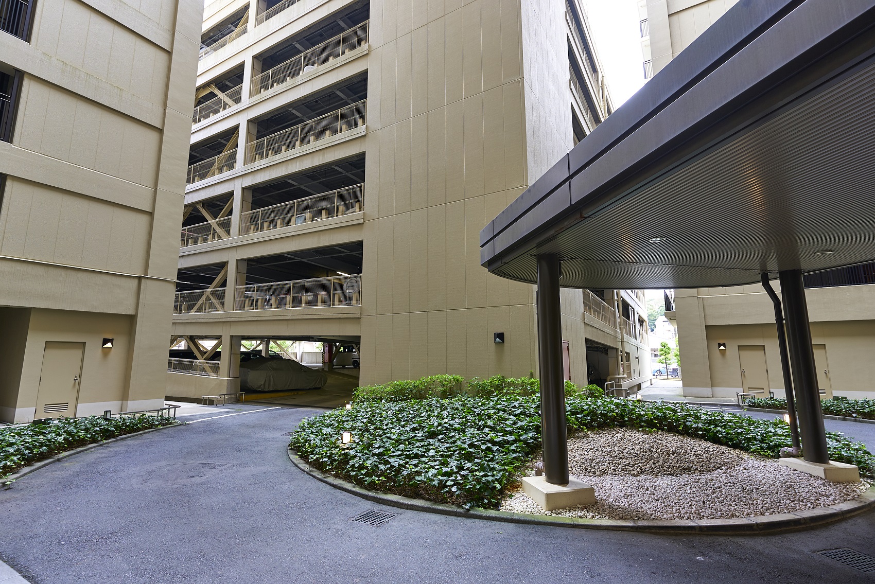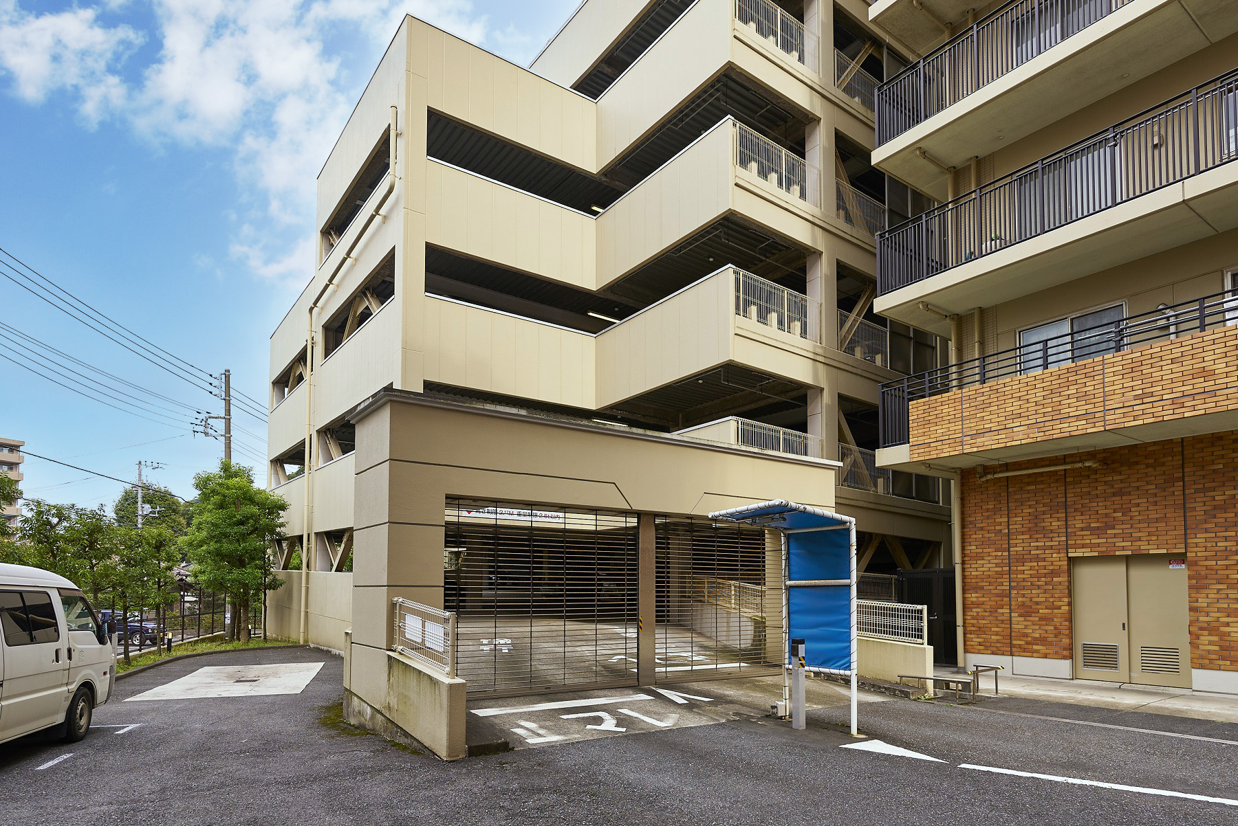 201台を収容できるエレベーター付地上6階建の自走式駐車場棟を設置。RVやワンボックスなども駐車可能。歩車道分離で敷地内歩行者の安全を守り、シャッターゲートとITVカメラで防犯性も確保。14台分のバイク置場もあります。