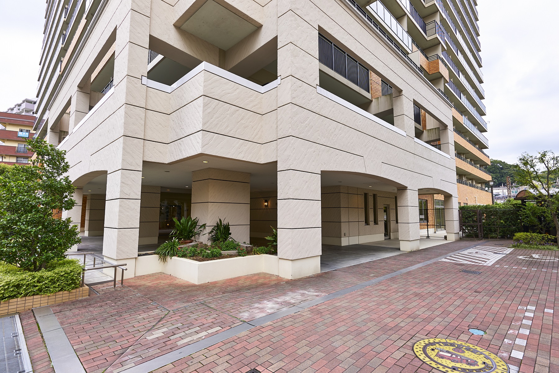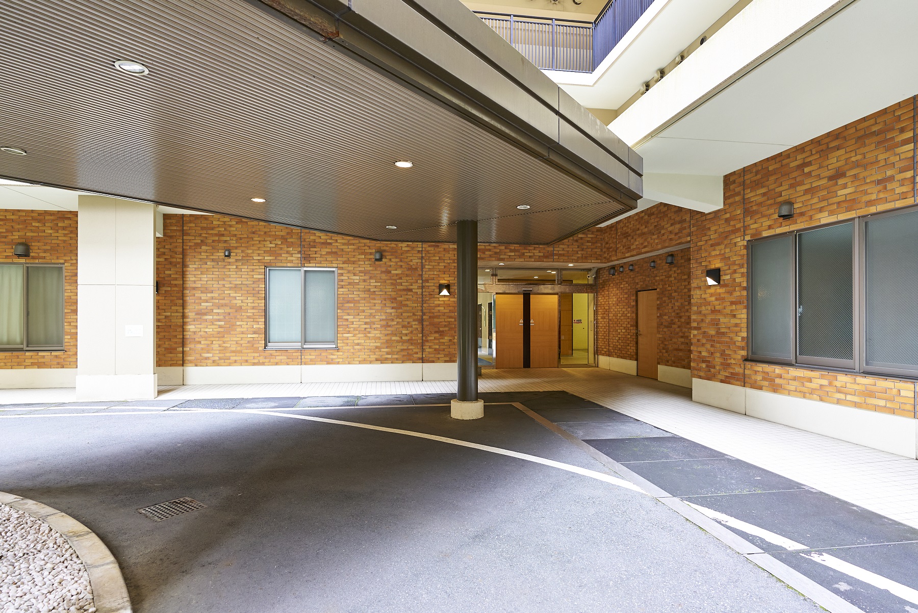 買い物帰りなど荷物が多い時にも便利に利用できる車寄せ。大きなキャノピー、2丁掛けタイルの外壁、そして木目調の開き扉など、メインエントランス同様の高級感あふれる空間です。