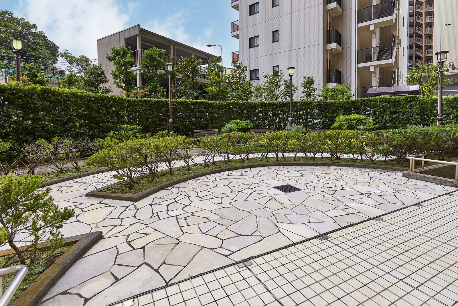 ラウンジの前には住まう人のための安らぎの空間、ポケットパークが広がっています。遊歩道側の樹木は高木で、手前側の樹木は低木で美しく刈り込み、半円形状に植栽することにより目に映る緑の量を増やし、奥行きのある空間を演出しています。