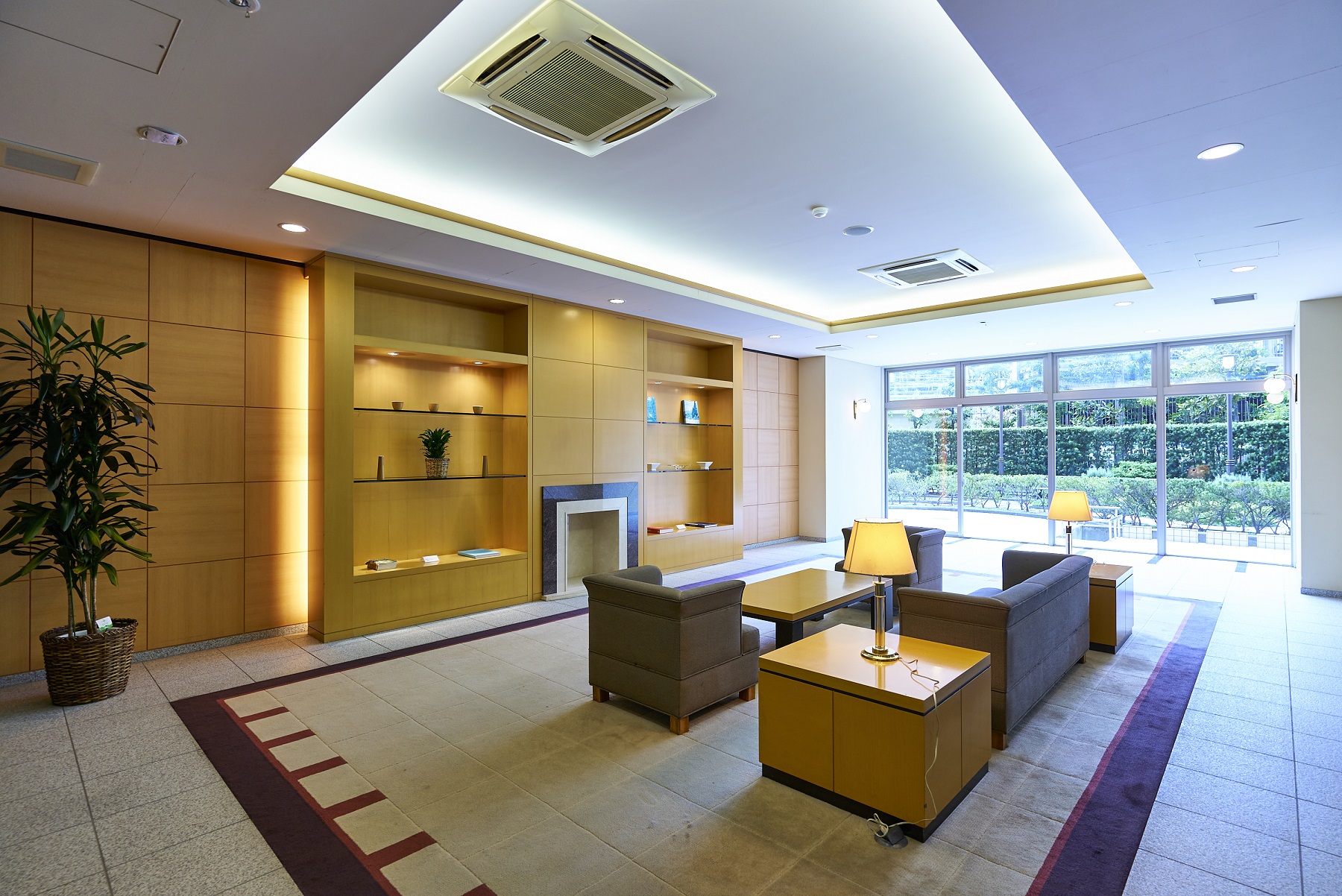 「ポケットパーク」の豊かな濃い緑を望むくつろぎの空間。木目調にしつらえた壁の中央にはマントルピース(暖炉)を造り付け、あたたかな雰囲気を演出しています。
