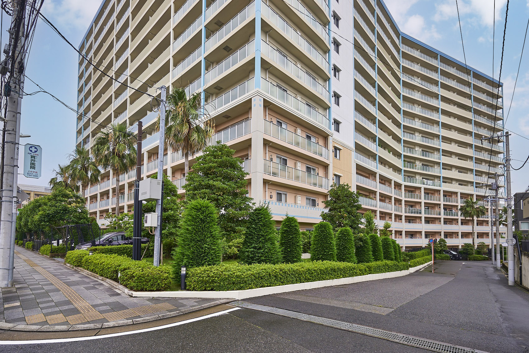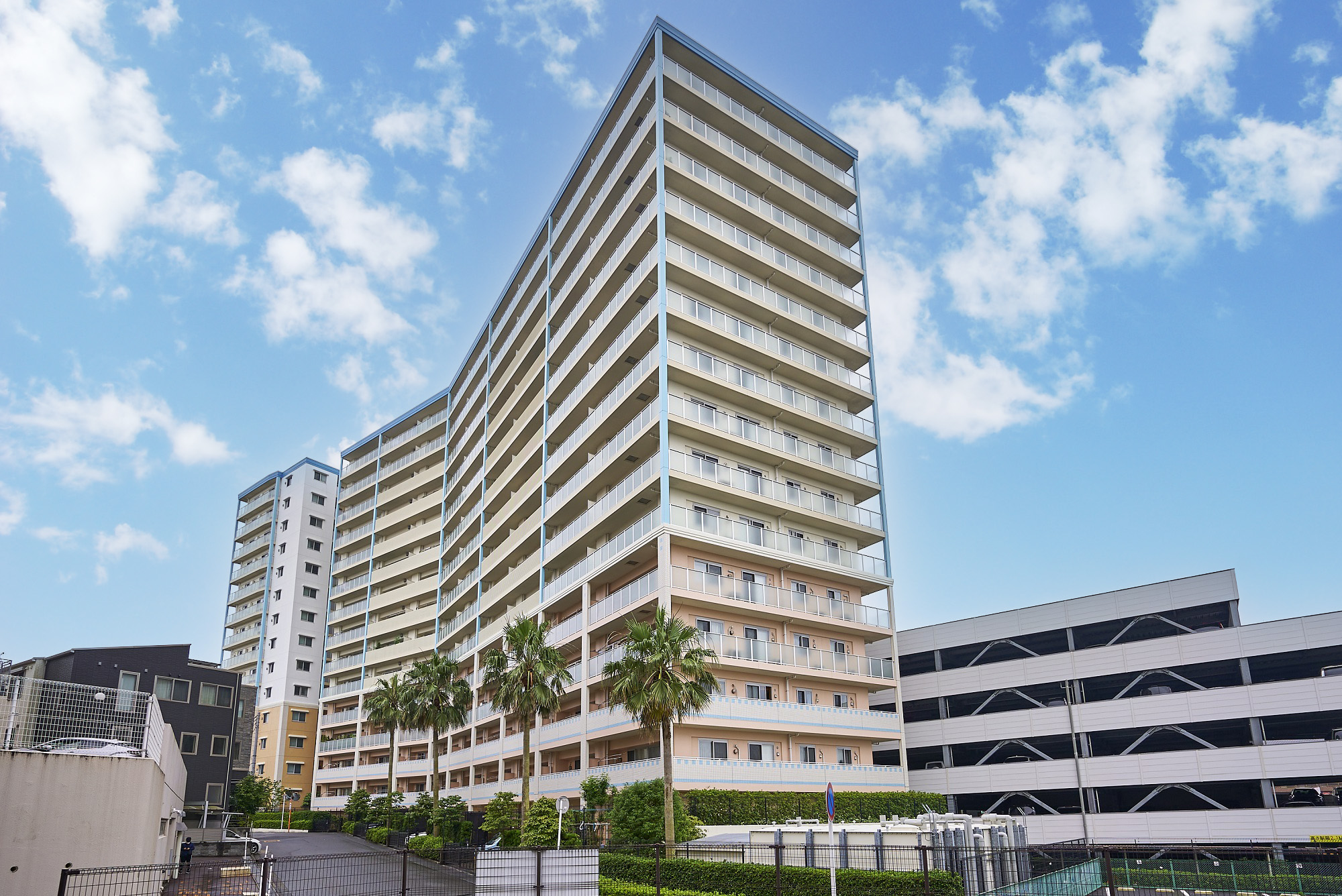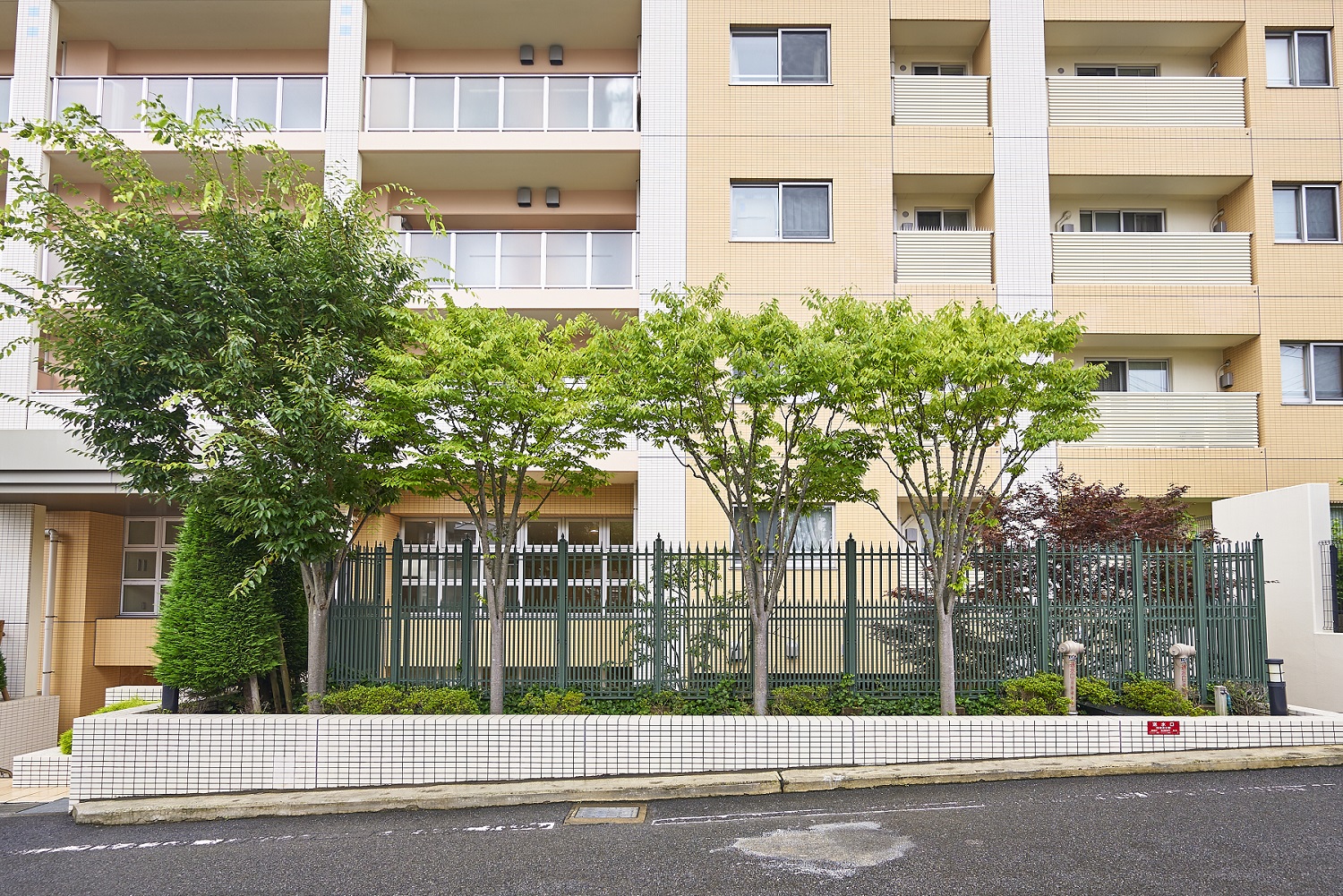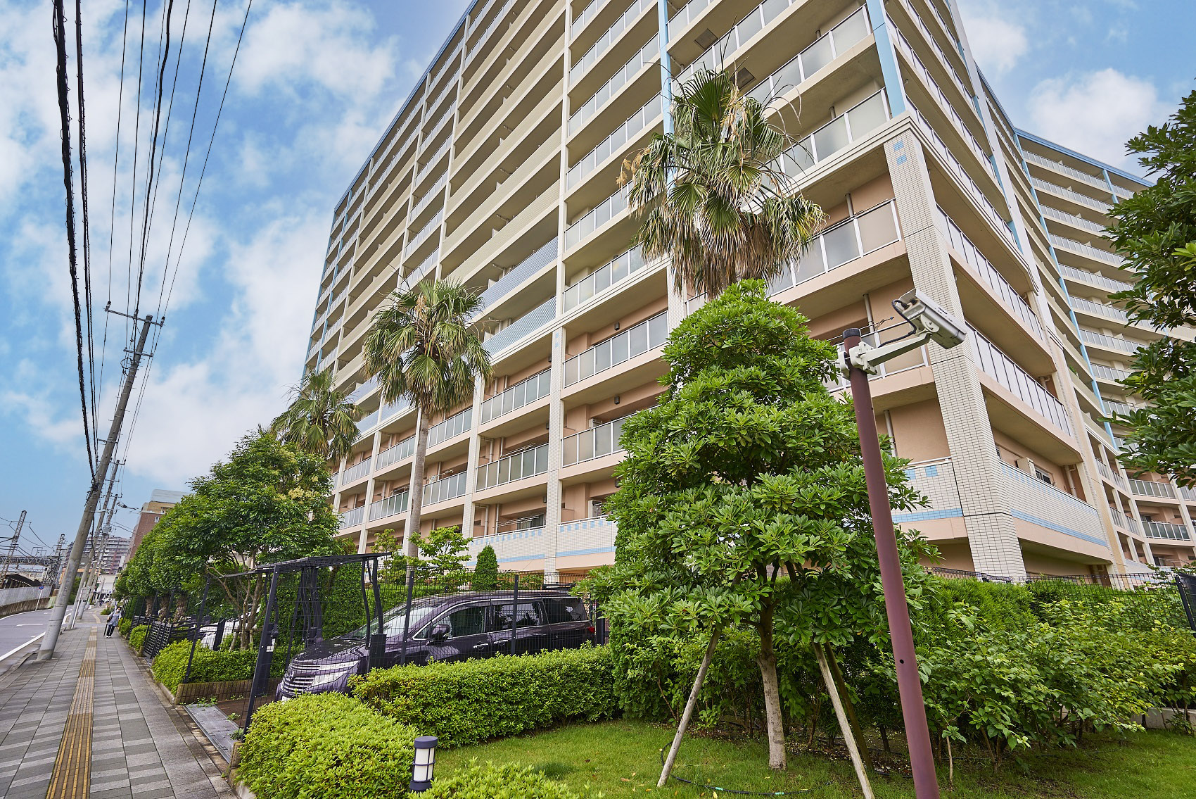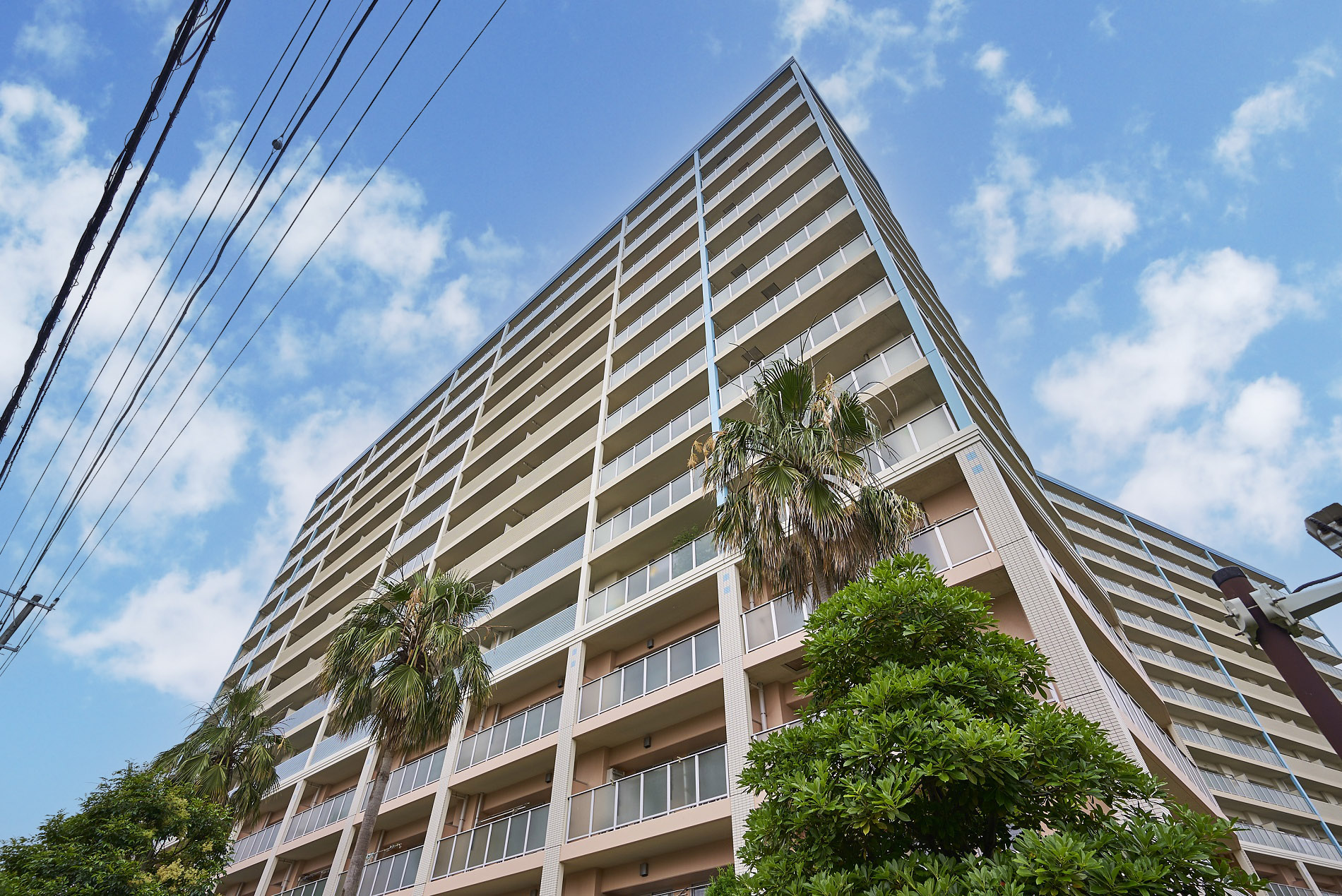 外観デザインのコンセプトは、アメリカン・アールデコ。外壁は白を基調とし、パステルブルーやパステルイエローのアクセントカラーを採り入れ、明るく柔らかな印象で建物の圧迫感を軽減しています。外構部にはパームツリーを主役に、鏑木やハナミズキが並木状に植え込まれており、リゾート感を演出しながら、街並みに緑の潤いを提供しています。