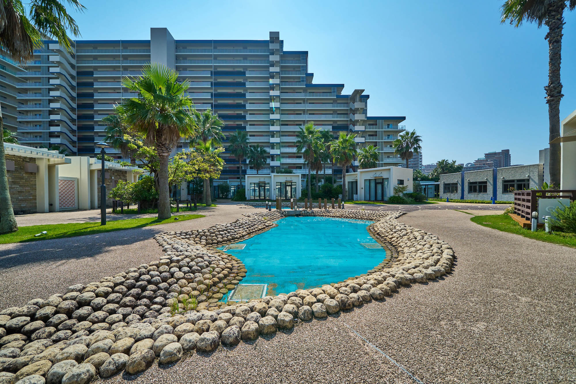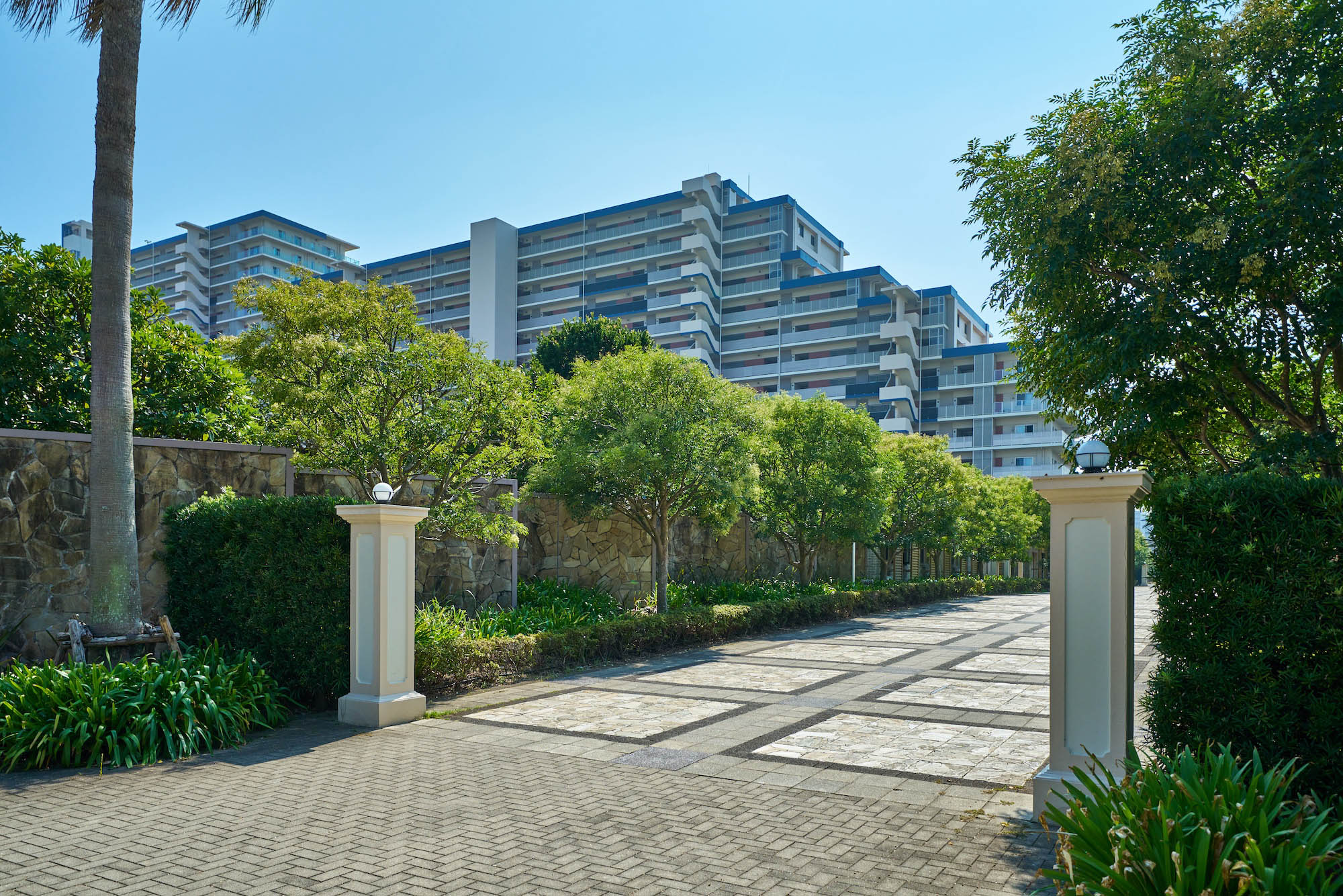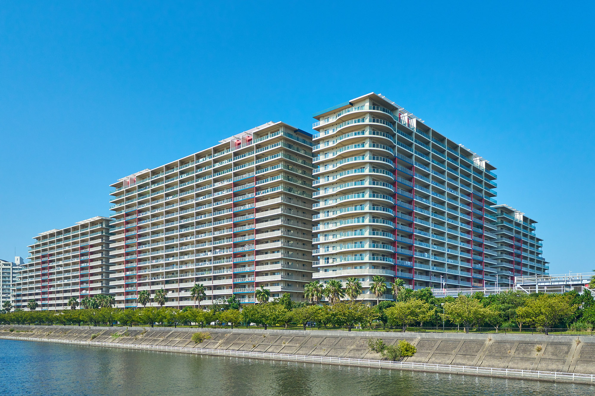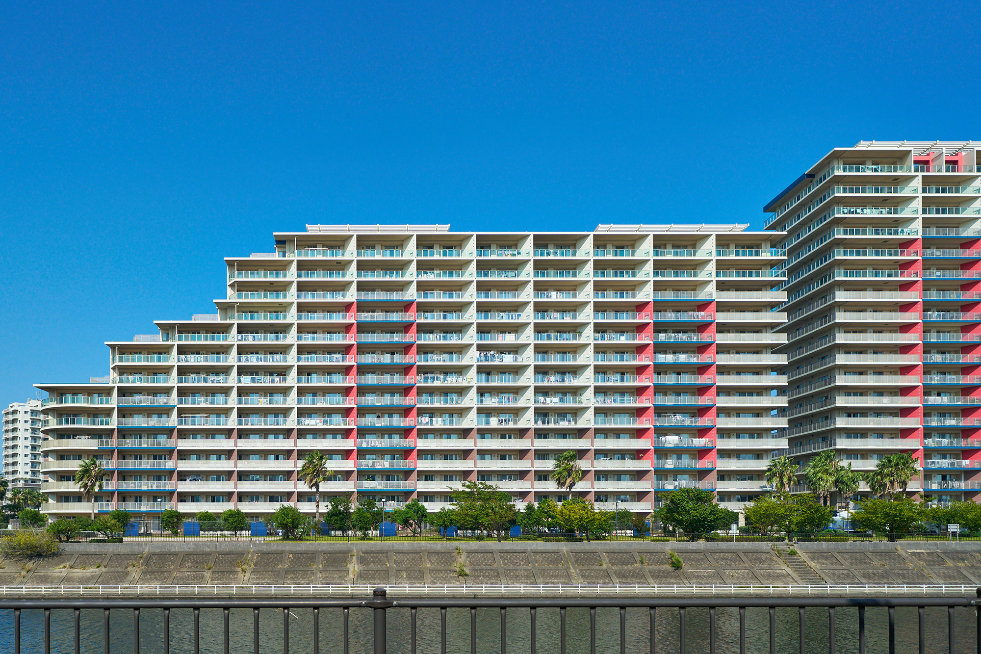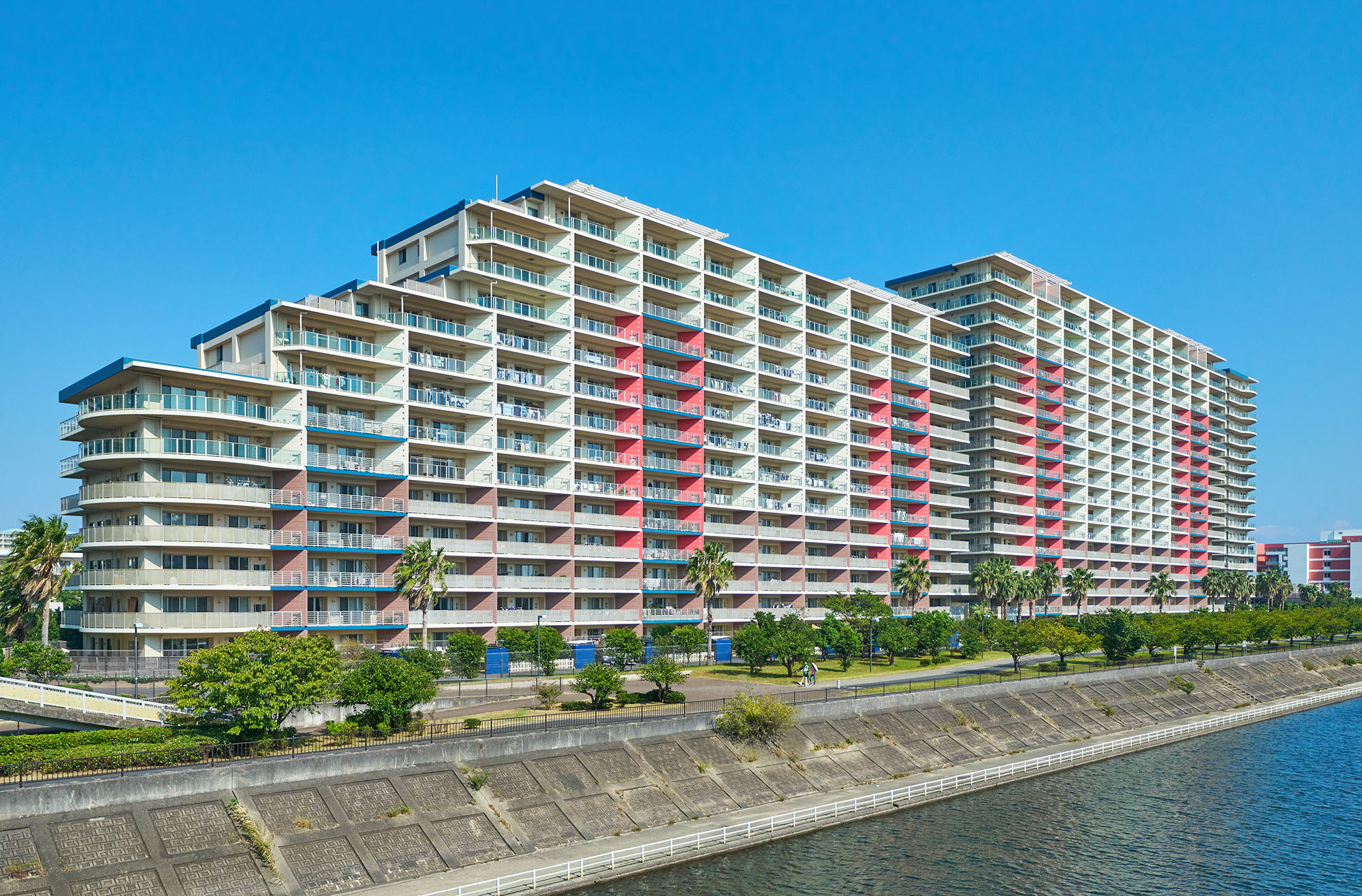 海の近くをイメージさせる「ターコイズブルー」、サンゴに由来する「コーラルピンク」、貝ガラに由来する「シーシェルホワイト」、そしてトロピカルなヤシの幹を思わせる「ダークナッツブラウン」、南国の心地よい気候を思わせる「ウォームコンフォートレッド」。「パークシティグランデ 新浦安」の外観デザインは、これらの色彩を基調として、満ち足りたライフステージにふさわしい表情を演出しています。また、バルコニーの開放性を創出するガラス手摺や、角住戸に用いたラウンドバルコニー、最上階におけるパーゴラ屋根など、オープンエアーを感じる工夫とともに、外観のアクセントとなる視覚的な要素もプラス。さらに中住戸のバルコニーに用いられた「ブライトウォール(ナナメの隔て板)」は、外観のアクセントはもちろん、南の陽を入りやすくするほか、オーシャンビューの確保など、さまざまな効果をもたらします。街並みと美しく調和しながらも、個性豊かな表情が印象的な、リゾートフルな佇まいです。