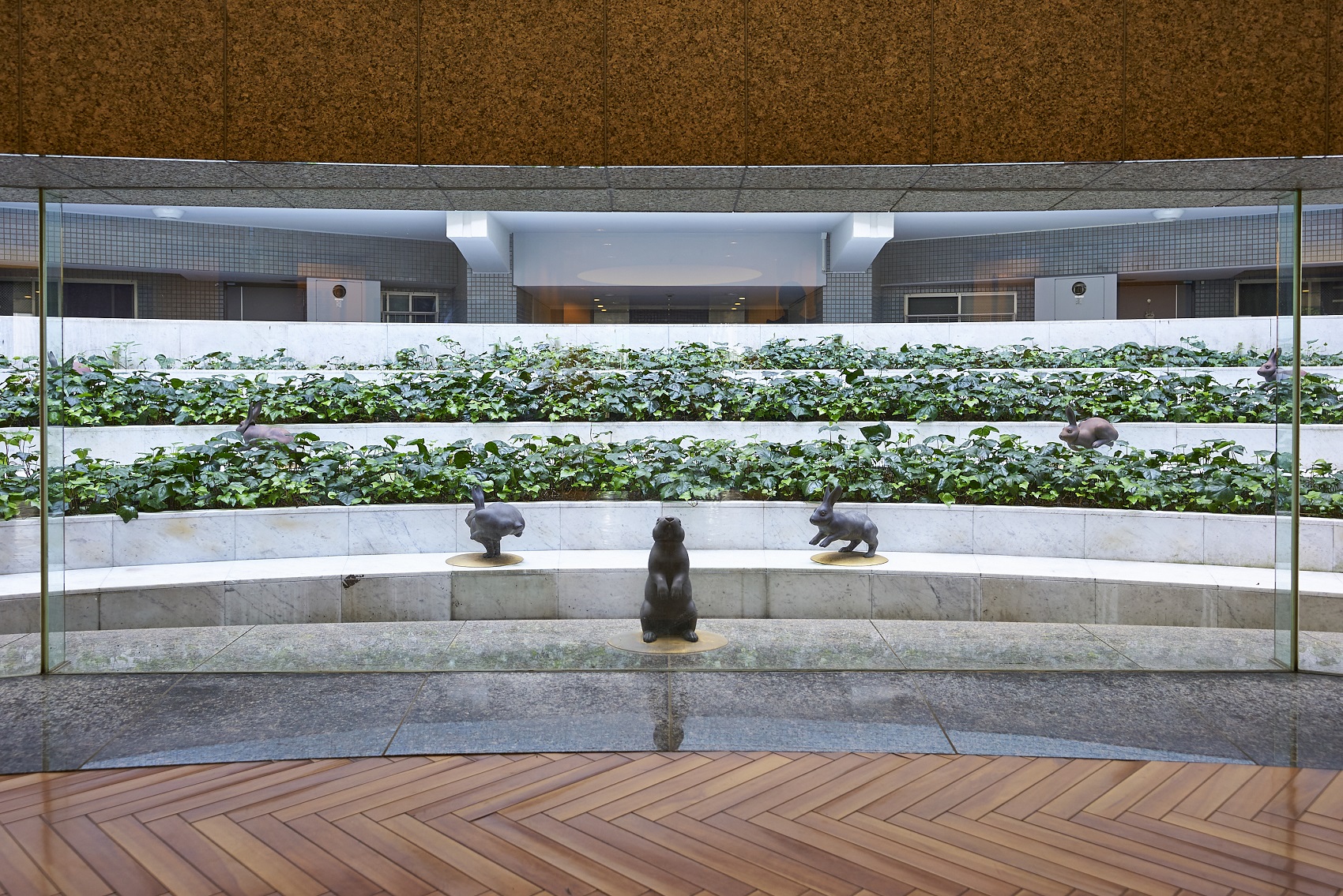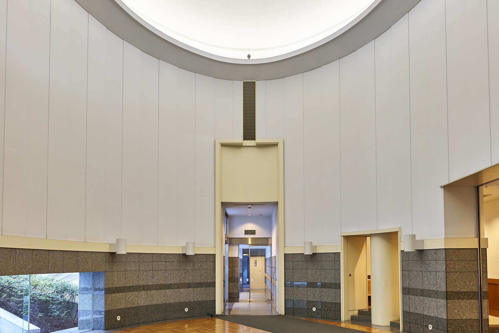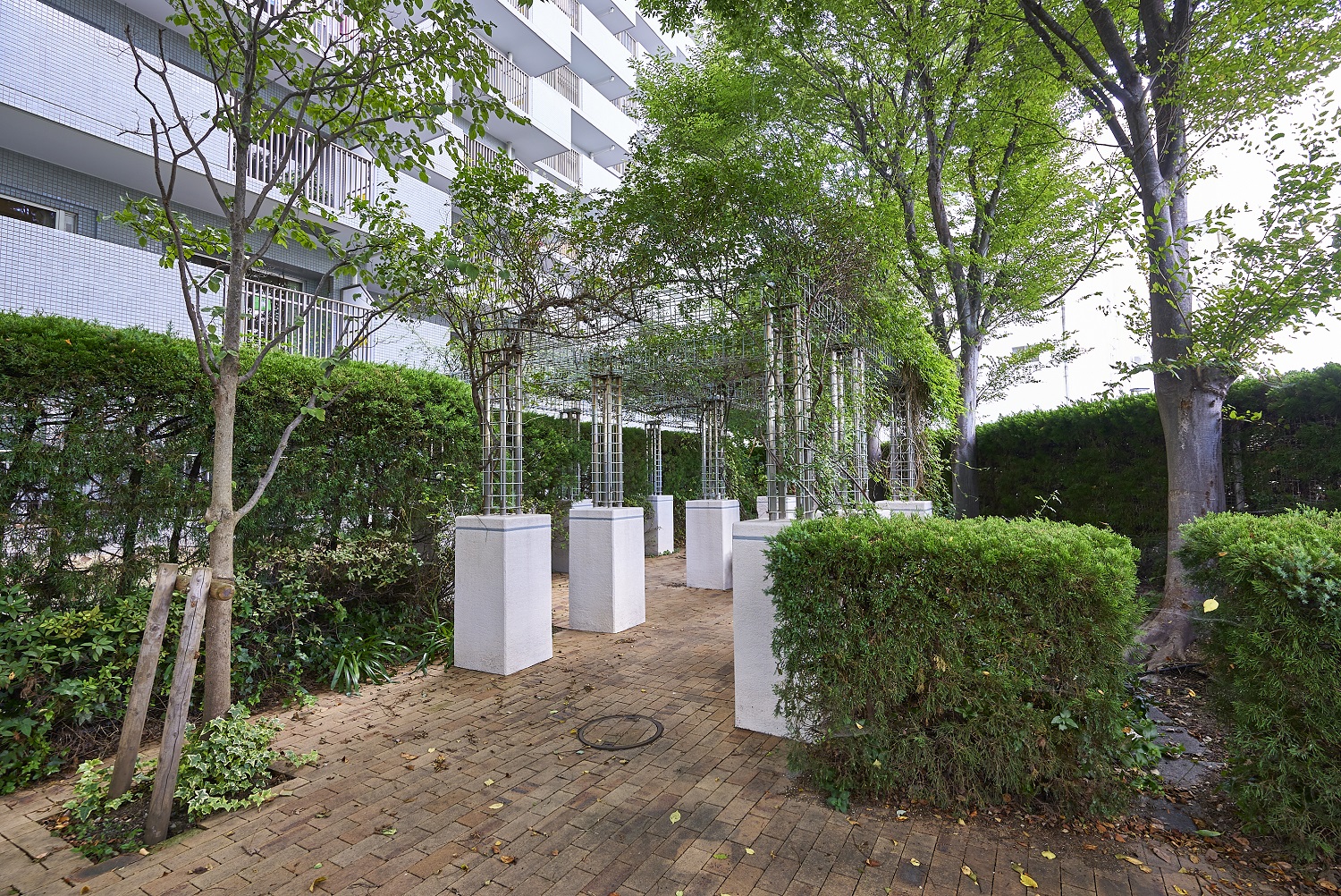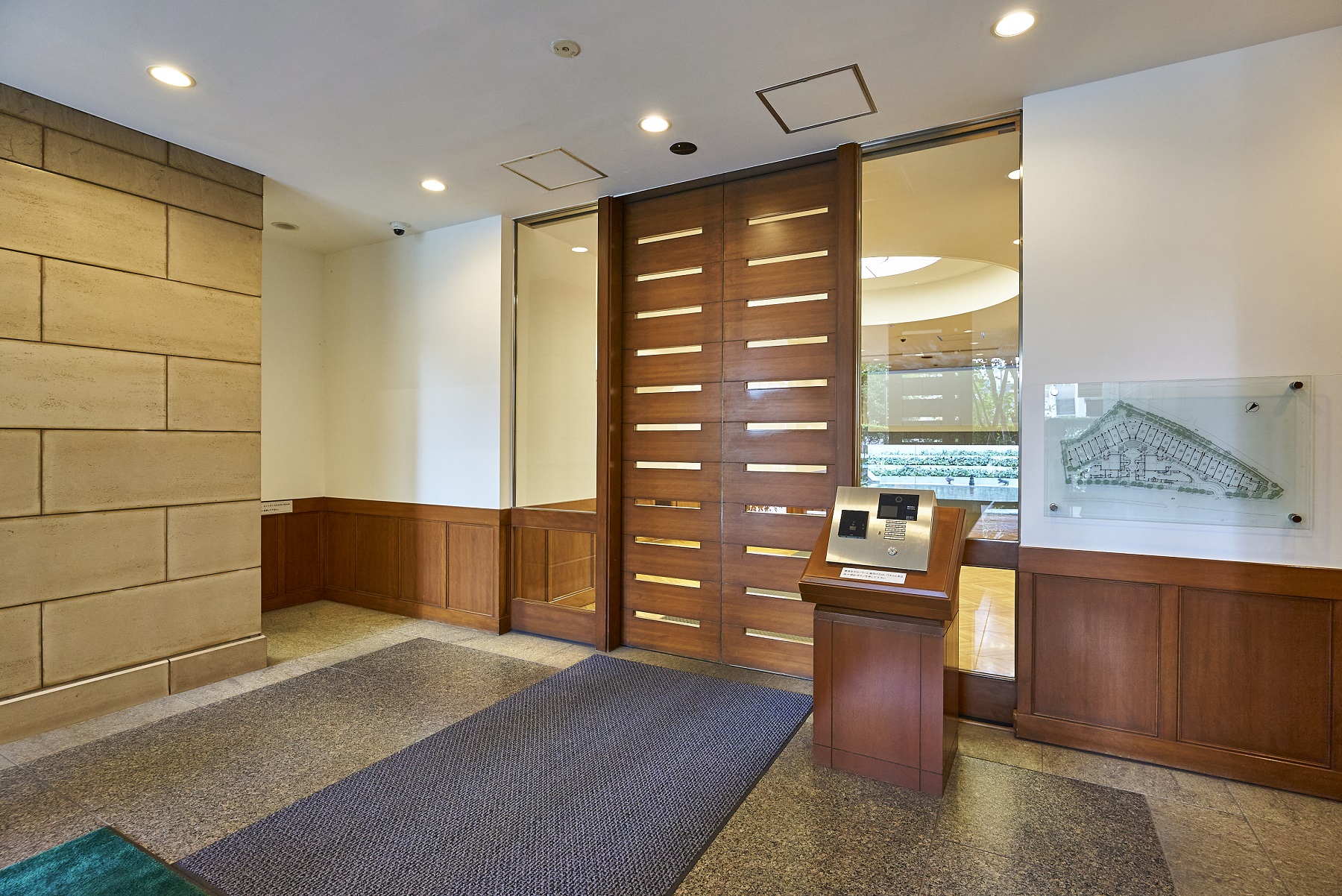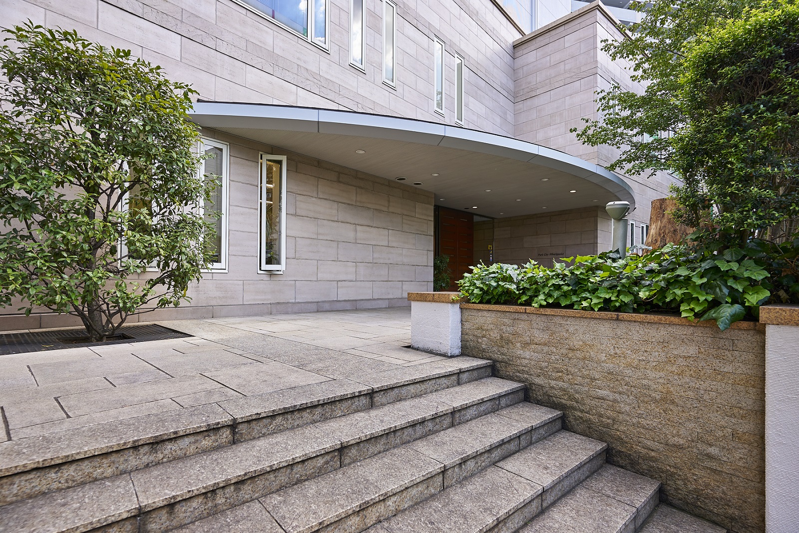 ゆるいカーブの大きな庇に、横スリットの入った二枚扉のエントランスを抜けると、円形のエントランスホール、さらにその奥には高い丸天井の楕円の広間「オーバル・ラウンジ」が広がります。正面には白い石と緑のアイビーを階段状にしつらえた中庭「ライトコート」、両脇の奥まった位置には一段高くなった「ゲスト・アルコープ」が配されています。ただ通り過ぎるだけでなく中庭を眺めながらゆったりとくつろげる空間です。他にも、集会室としても利用されるキッズルームや、緑溢れるトット・ロット、ローズ・パビリオンなどの共用スペースが設けられています。