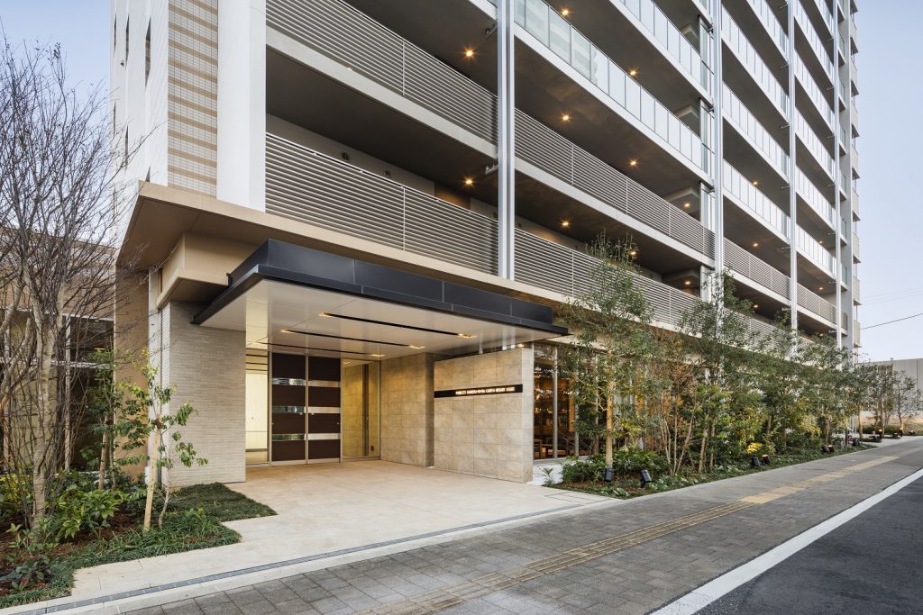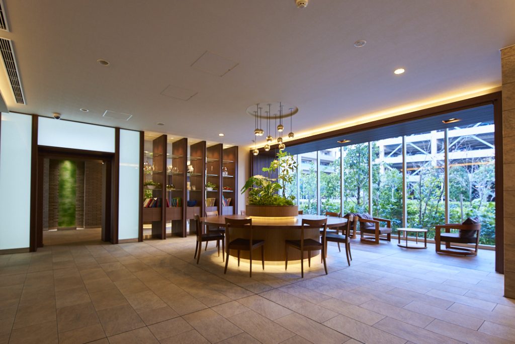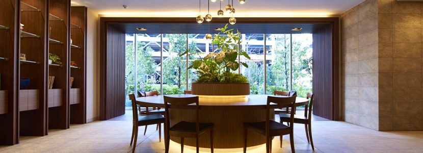 共用スペース 一人ひとりのサードプレイスに。 緑に包まれたエントランスアプローチから入ると、穏やかな空気に満たされたフレックスホールがあります。自宅でもない、会社でもない、自らを開放できるサードプレイスとして、自由にご利用いただける空間。心地よく、自分らしく過ごせる場所になります。 エントランスアプローチ フレックスホール