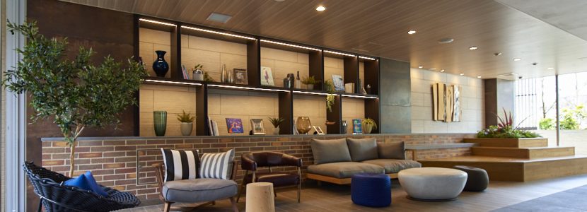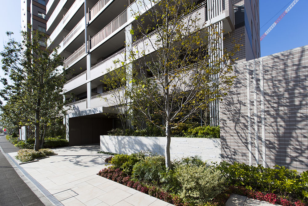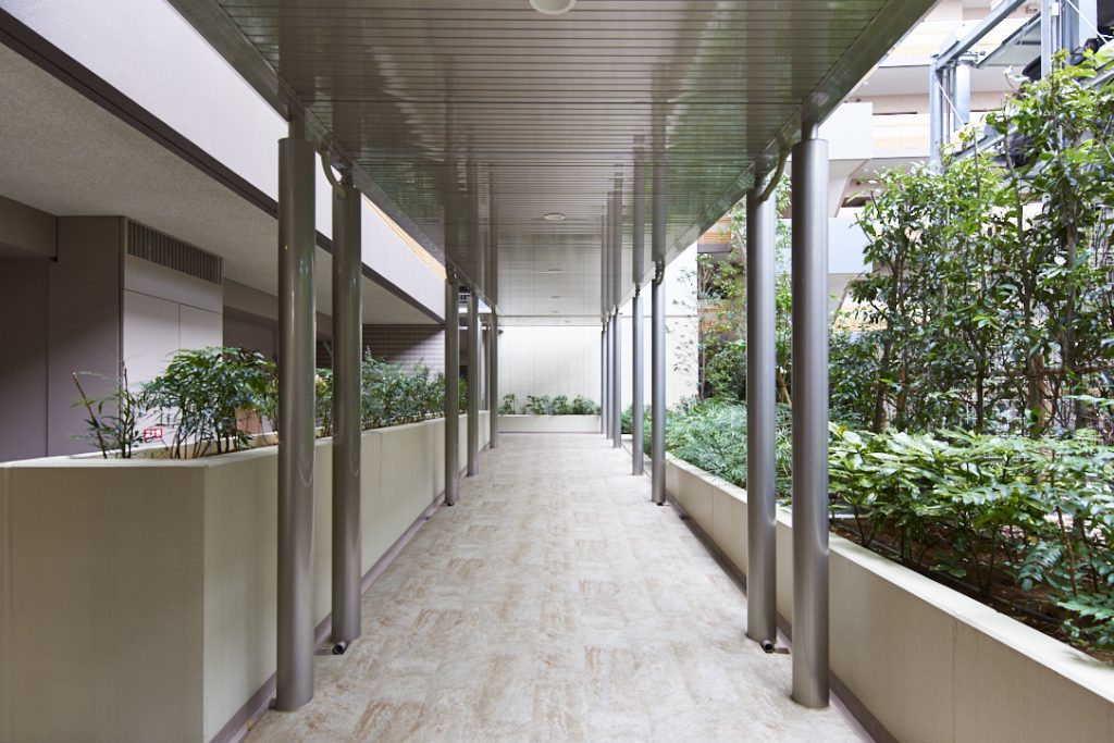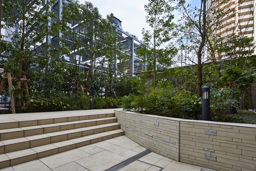 都市と自然が豊かに調和した柏の葉の街並みにふさわしく、建築意匠にこだわり、緑を創出した共用スペース。