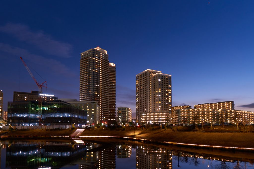外装は「大地の色彩(アースカラー)」と「空の色彩(ブルー・ホワイト)」との対比を用い、「大地から空へとつながるタワー」としてデザインしています。低層階から頭頂部へと段階的にセットバックしたツインタワー中央のコーナーバルコニーは、タワーのシルエットにリズム を創出。グリーンアクシスに対してシンメトリーにそびえながら、未来の街のゲートとしての存在感を生み出してゆきます。
