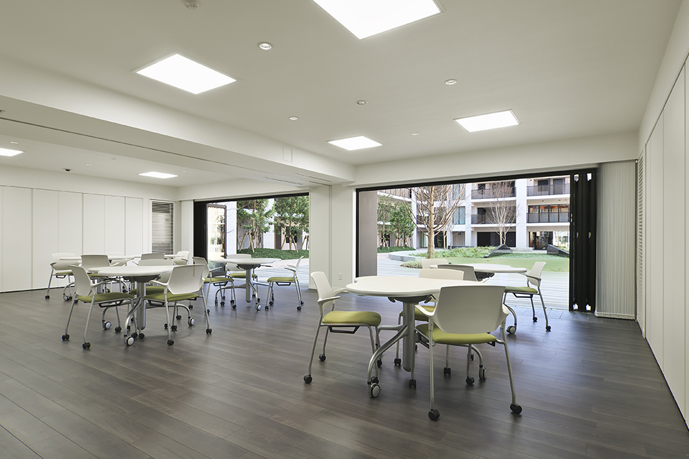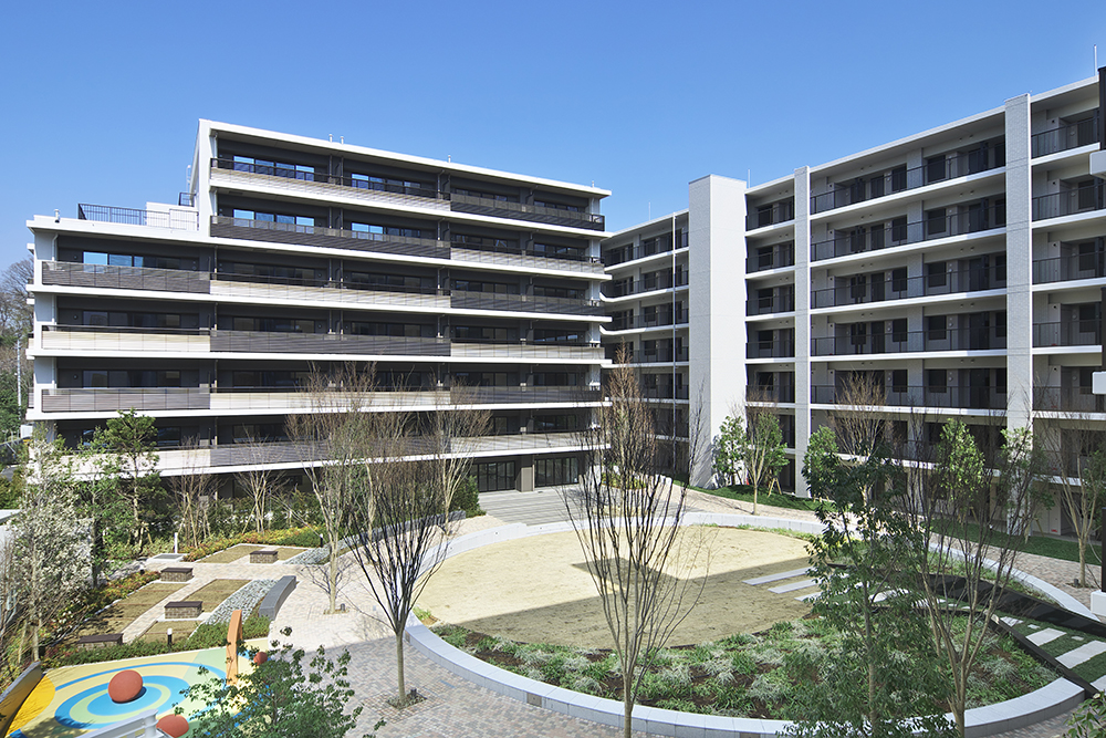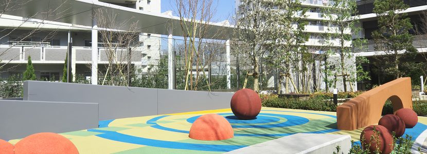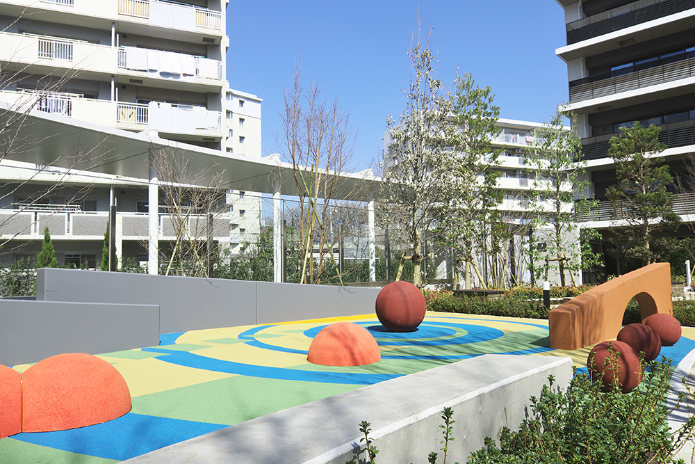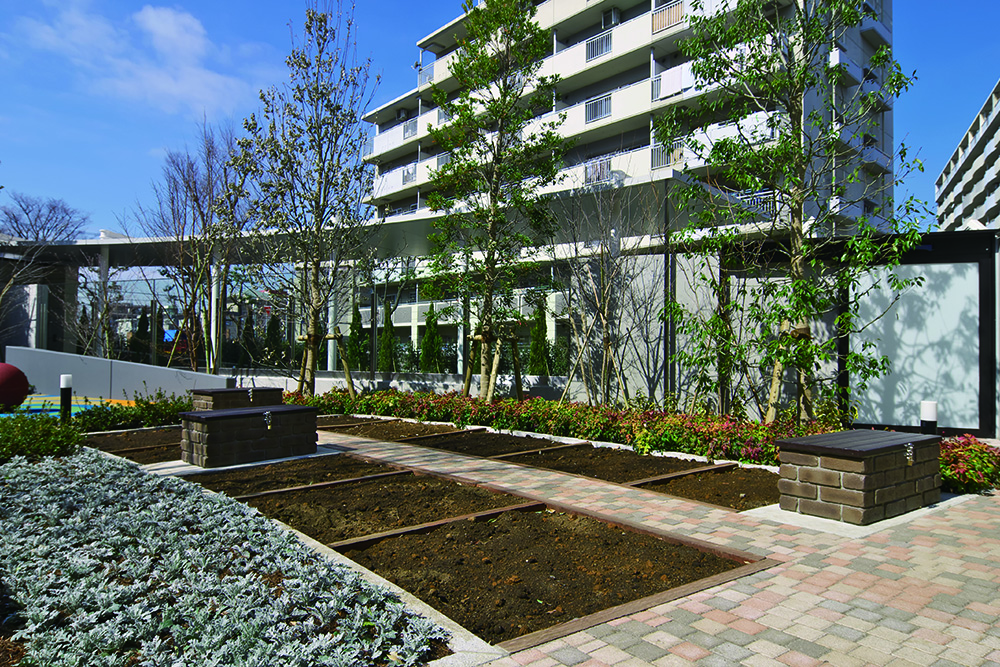住まいの中にあるリビングだけでなく、住まう人全員が使う共用スペースも、多目的に使える空間も、 そのすべてをリビングのようにくつろげる場所にしてみたい。そんな考え方から「All Living」という発想が生まれました。4つの棟の中心に位置するリビングサークルは、この街の広場です。家庭菜園やプレイパーク、休憩用ベンチなど、工夫とアイデアを盛り込んだスペースを設置。住まう人たちが自然に集まり、セキュリティ内で安心して過ごせる「大きなリビング」です。