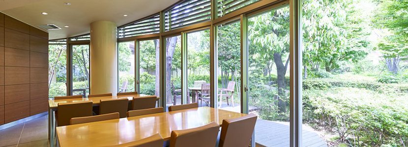 水面のきらめく水辺や、凛とした木立を望む、開放感ある空間です。