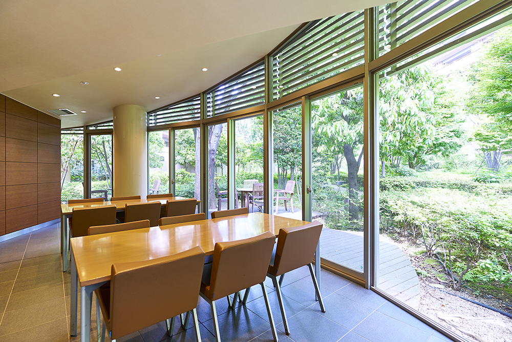 親子や隣人同士のふれあいの場として、お客様をもてなす場として、そしてプライベートのやすらぎの場として、パークシティ武蔵野桜堤では、多彩な共用施設が用意されています。清らかな水景を描く「武蔵野の水辺」に隣接し、グランドエントランスを入り口とした「ガーデンハウス」は、コンシェルジュカウンターや管理員室等を揃えた、コミュニティの中心となる共用棟です。