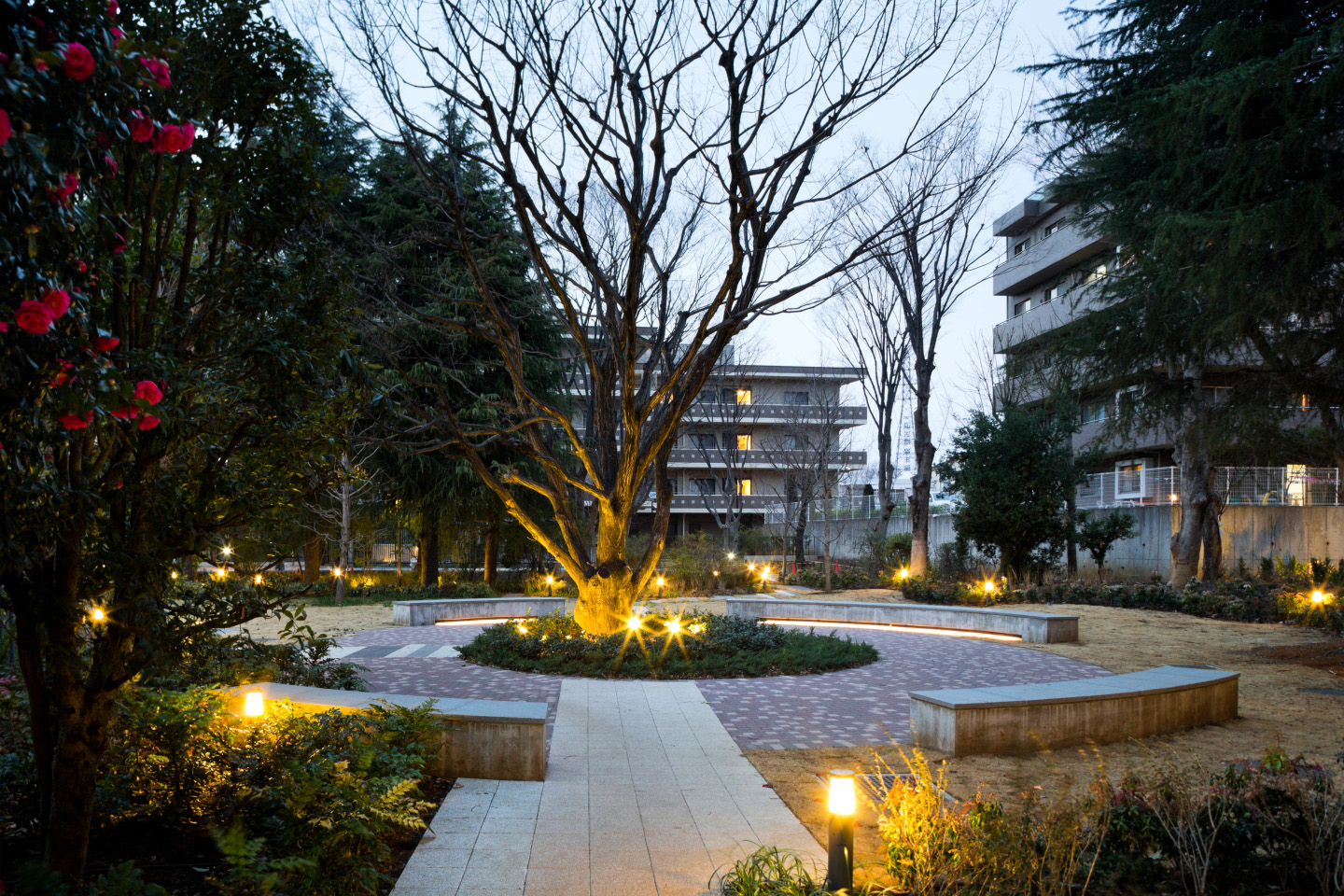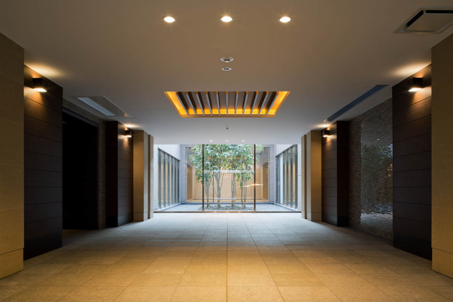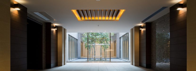 共用部は、回廊をイメージした長い動線プランに特長があります。パブリックとプライベートの中間に長さを持たせることで、帰宅する人の心を落ち着かせ、歩く度に、また曲がる度に異なるシーンに出会えるデザインになっています。水景や光の庭、屋外の植栽は、自然光や照明が時間帯毎に異なる表情をもたらし、暮らしの愉しみを演出しています。