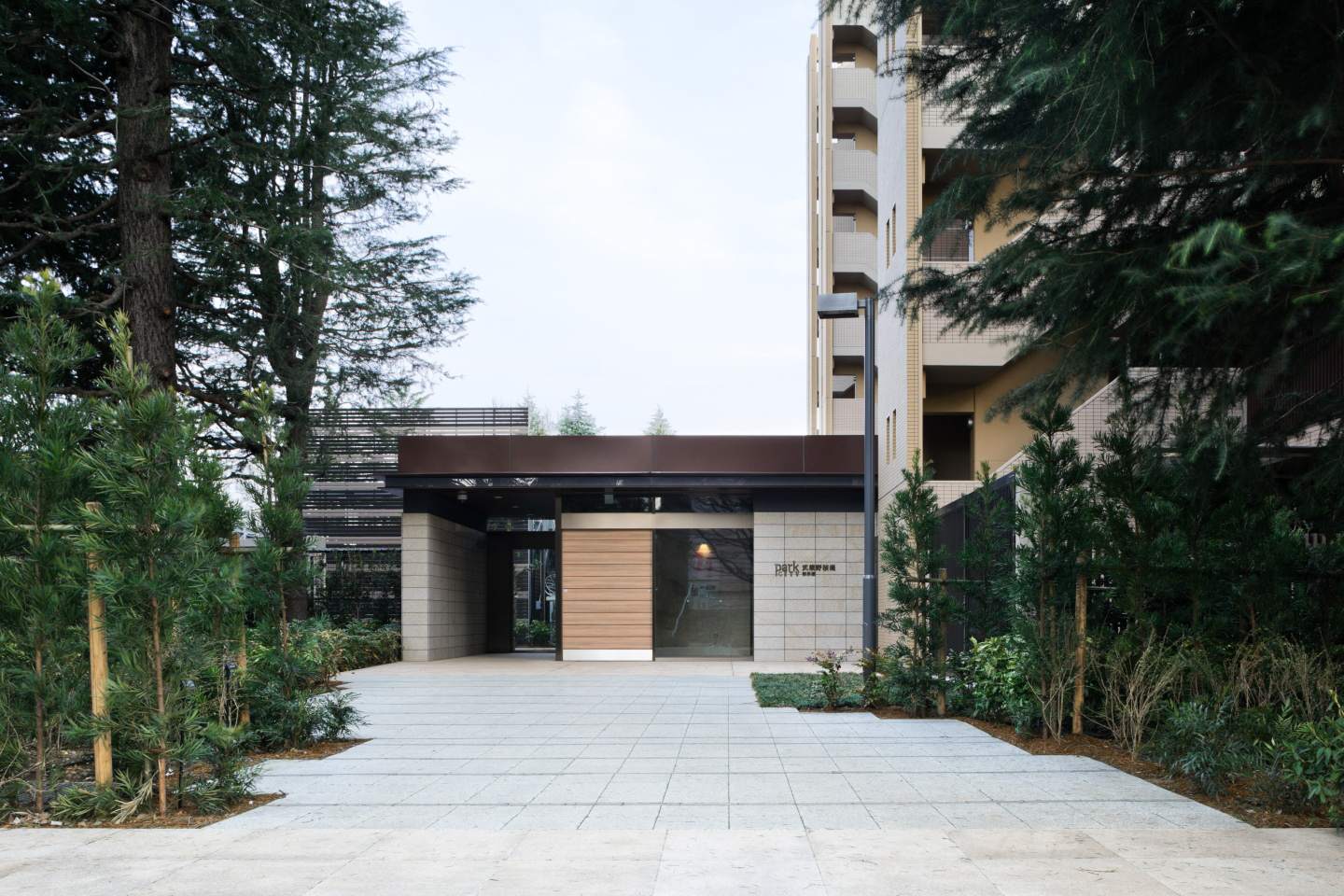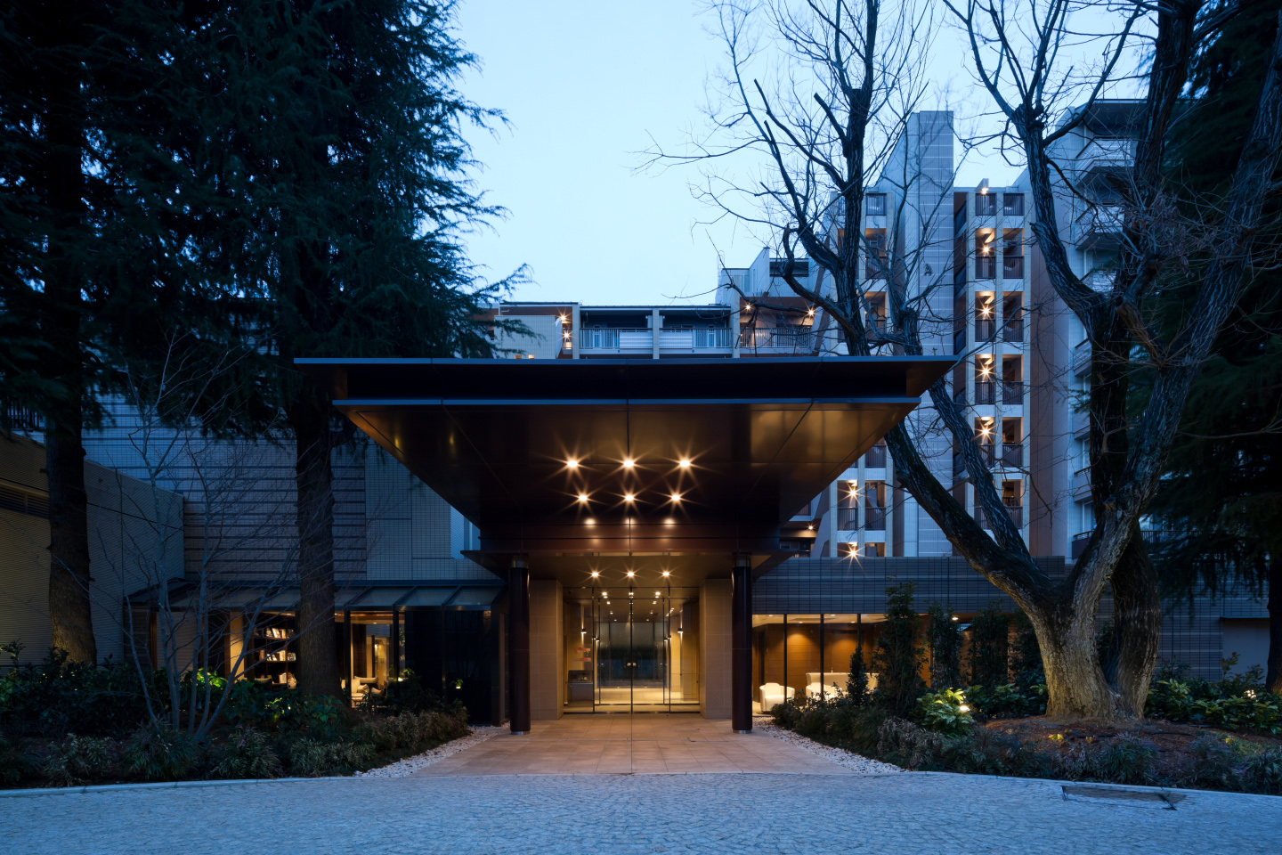 堂々と伸びる大きな庇の左右には既存樹の木立を中心とした植栽帯が配置され、鱗貼りの錆御影石による楕円状の車寄せスペースとなっています。