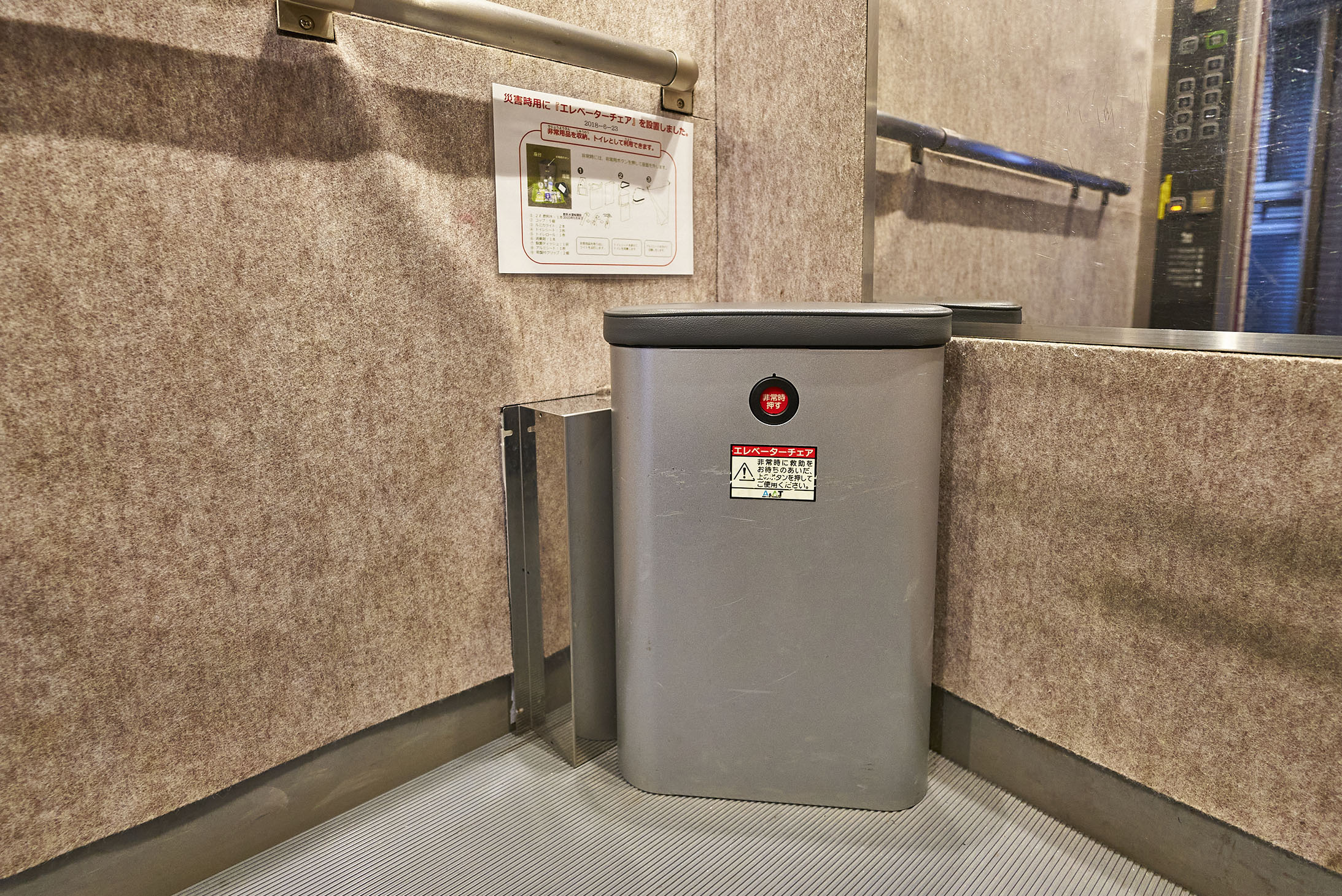 エレベーター内には防災用チェアが設置されています。
