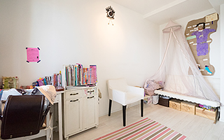 お姫様テイストの天蓋や、かわいらしい小物がレイアウトされた子ども部屋。この部屋に限らず収納を重視されている奥様だが、すっきりと片付いたこの部屋は壁面に収納が2つあり、散らかりがちな子ども服や荷物も十分に入るため、奥様も満足しているそう。おもちゃなどはご主人のお店で取り扱うワインの木箱に入れて、ソファの下に。ナチュラルな風合いがインテリアの雰囲気に馴染んでいる。