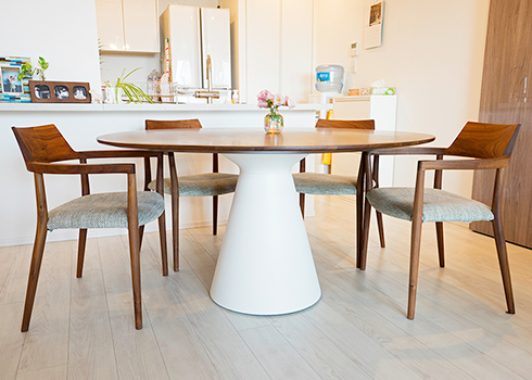 脚が1本の丸テーブルは座る位置も自由。ふだんは4脚の椅子を出しているが、来客時などは8人まで一緒に囲める。