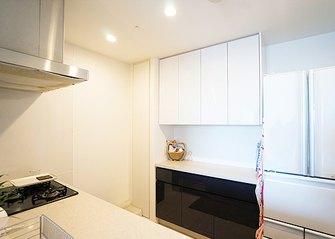 壁面収納などを活用して整理整頓し、家電や小物を表から見えるところに置かない、シンプルな暮らし方にこだわっているMさんご一家。間取りも敢えて2LDKとして空間をゆったり使っている。そこには家族3人の時間を大切にし、リビングダイニングを最大限にくつろげる空間にしたいという奥様の強い思いがあった。