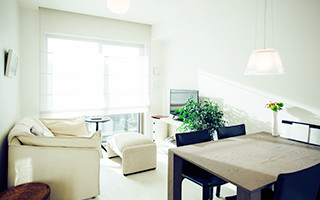 リビングダイニングを広くとった2LDKの間取り。家具やインテリアを演出するための小物は厳選され、極めてすっきりした空間を実現している。