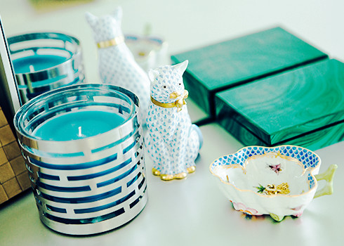 プロ級の整理収納テクニックをお持ちの奥様。壁面収納は夫婦の場所を左右に分けて、お互いのものをそれぞれ管理している。収納スペース内はものの置き場所を決め、細かい文具の位置なども一目でわかるよう工夫。だが、すべて隠してしまうわけではなく、旅行のお土産やコレクションのグラス、マンション内のご友人が作ってくれたドライハーブのガーランドなど、飾る楽しみも忘れてはいない。