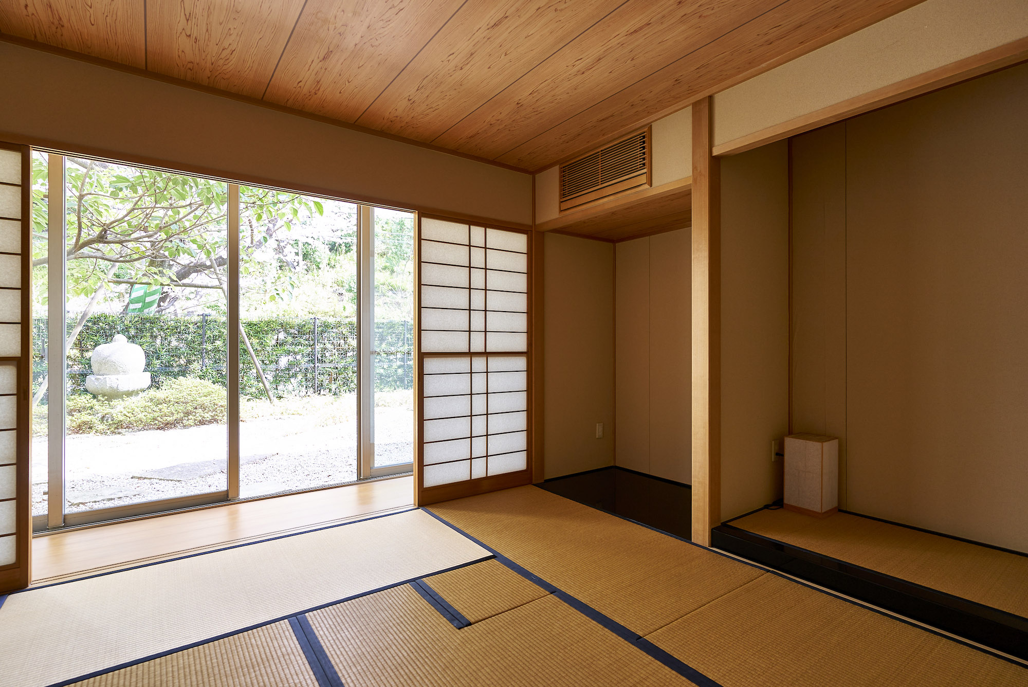 石を敷き詰めた玄関土間、三畳の水屋、炉を切った和室など、日本建築の伝統をいかした様式。お稽古などに使用できます。