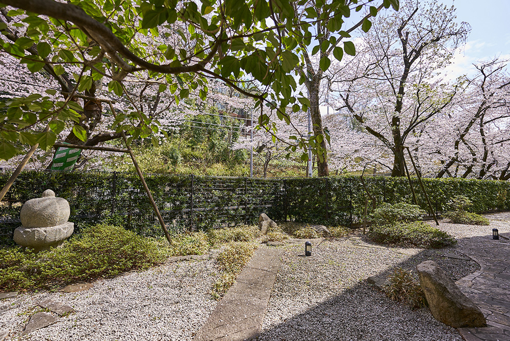 敷地内には本格的なイングリッシュガーデン「フラワー・ガーデン」をはじめ、「石草の庭」や「林泉の庭」など豊かな緑が重なる庭園が配され、「流桜の庭」は春になると美しい桜の景色が広がります。眺めて愉しく、たたずんで心地よい空間が、丹念につくり込まれています。