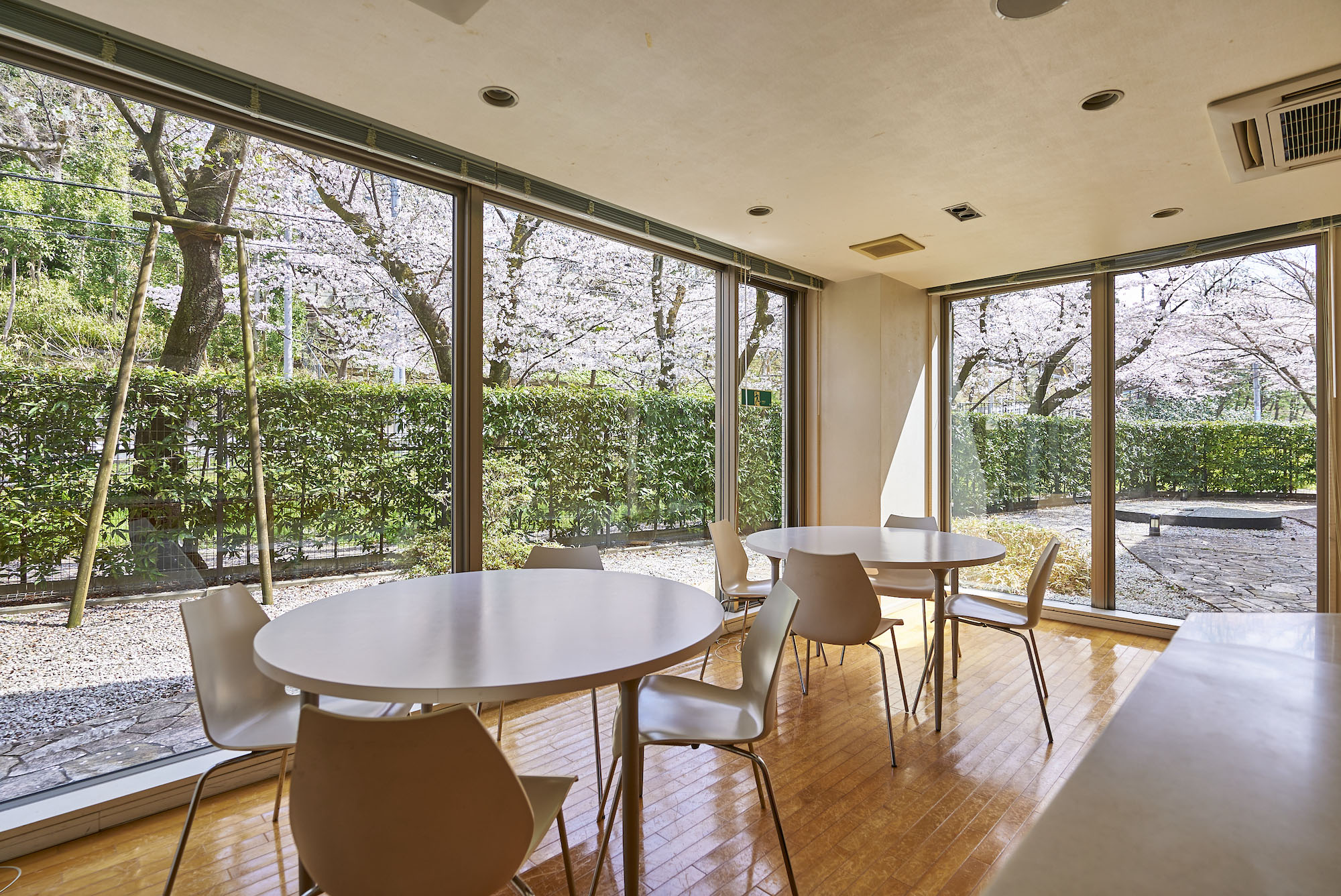大きなガラスウォールから緑を望む遊び部屋。大勢が集う集会室としても利用できます。