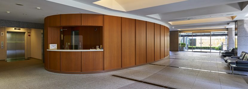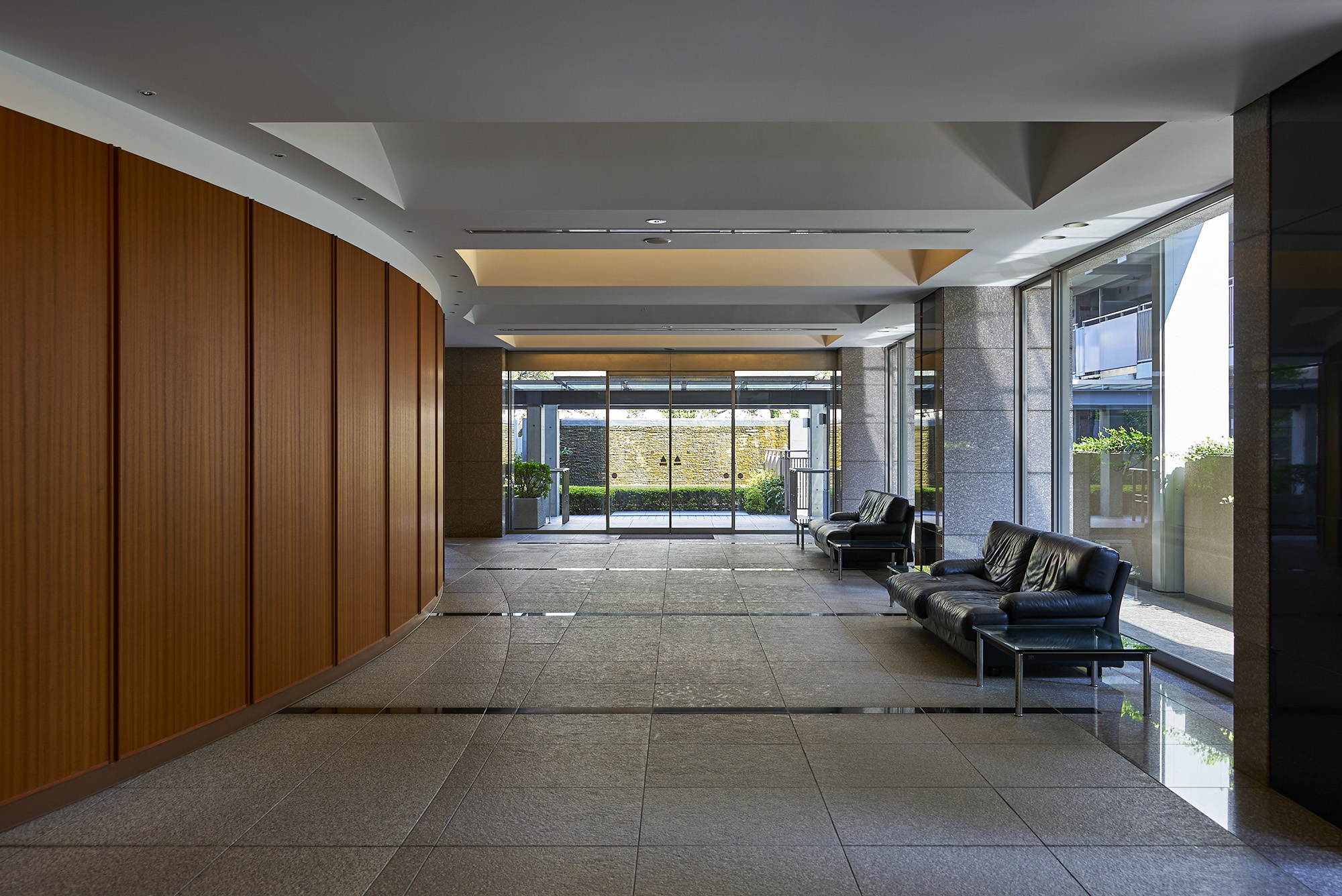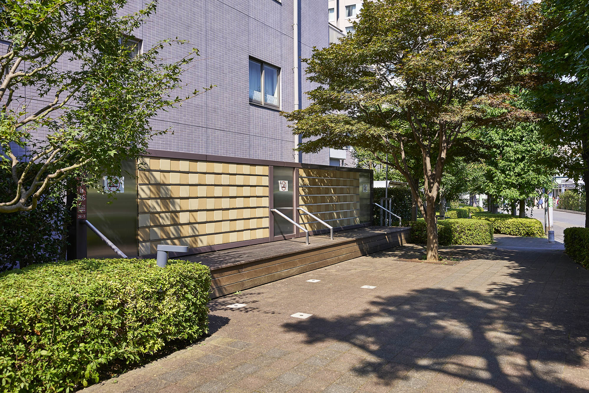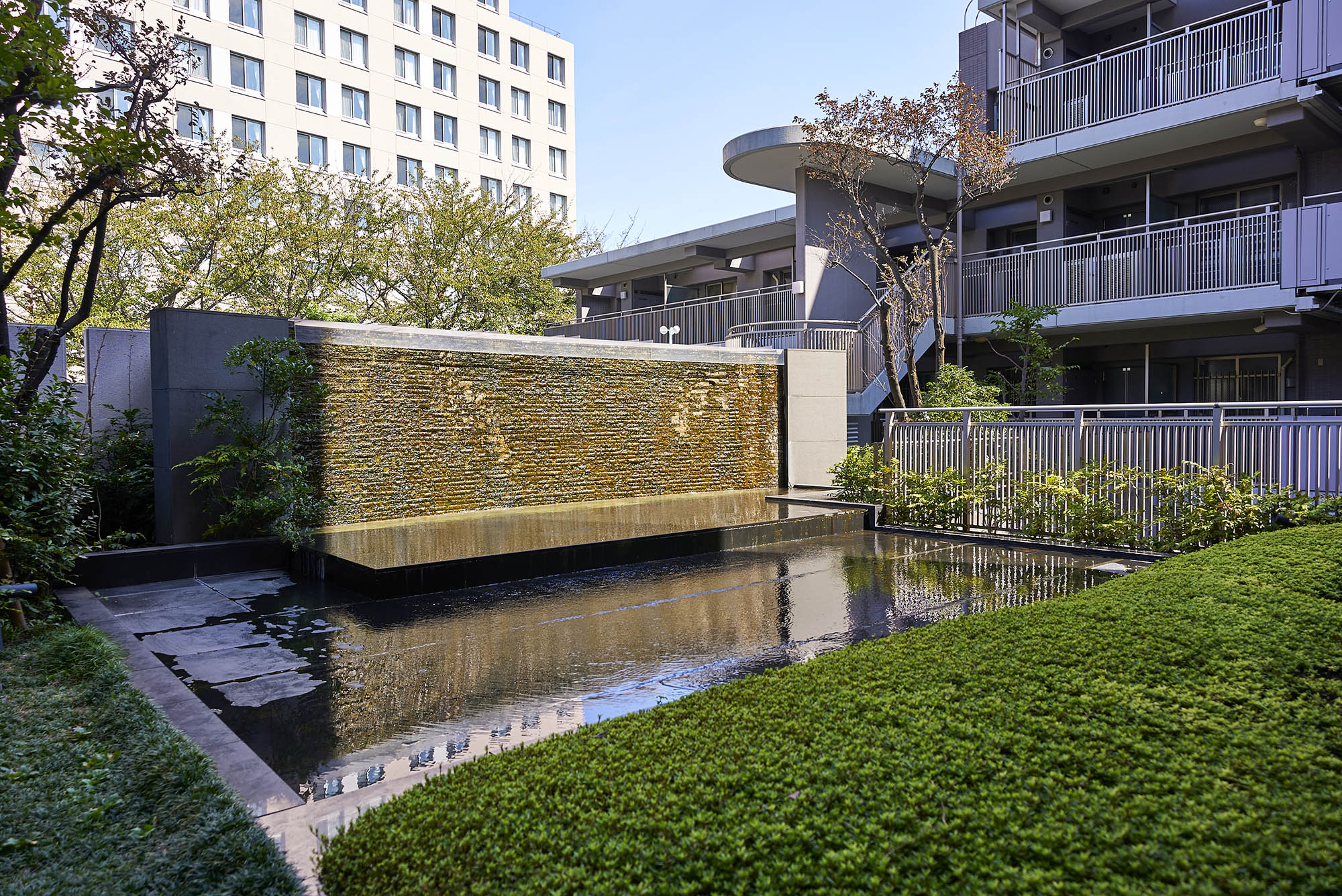 公開空地としての機能を持つセミプライベートな空間。春になるとソメイヨシノが咲き誇ります。
