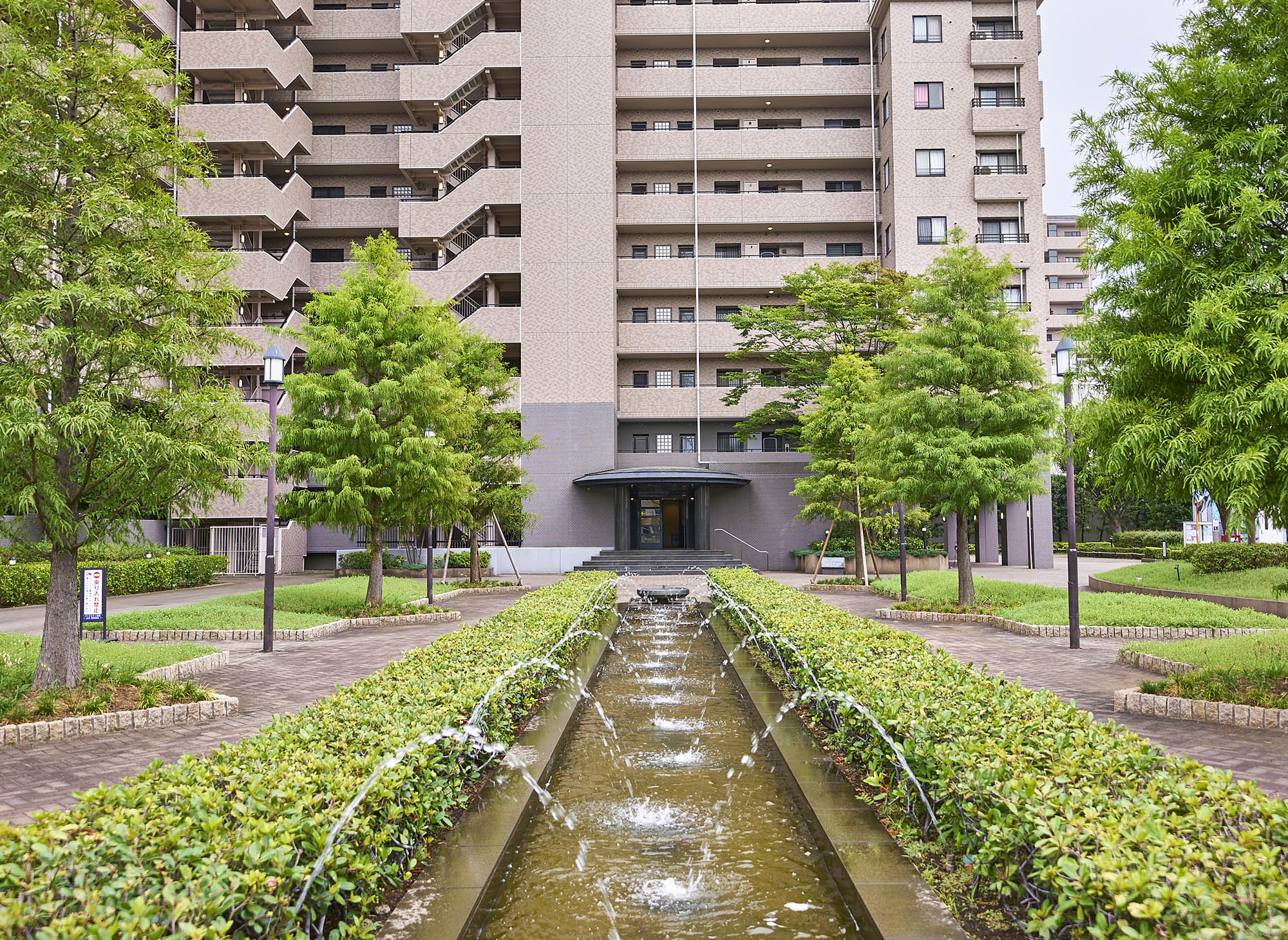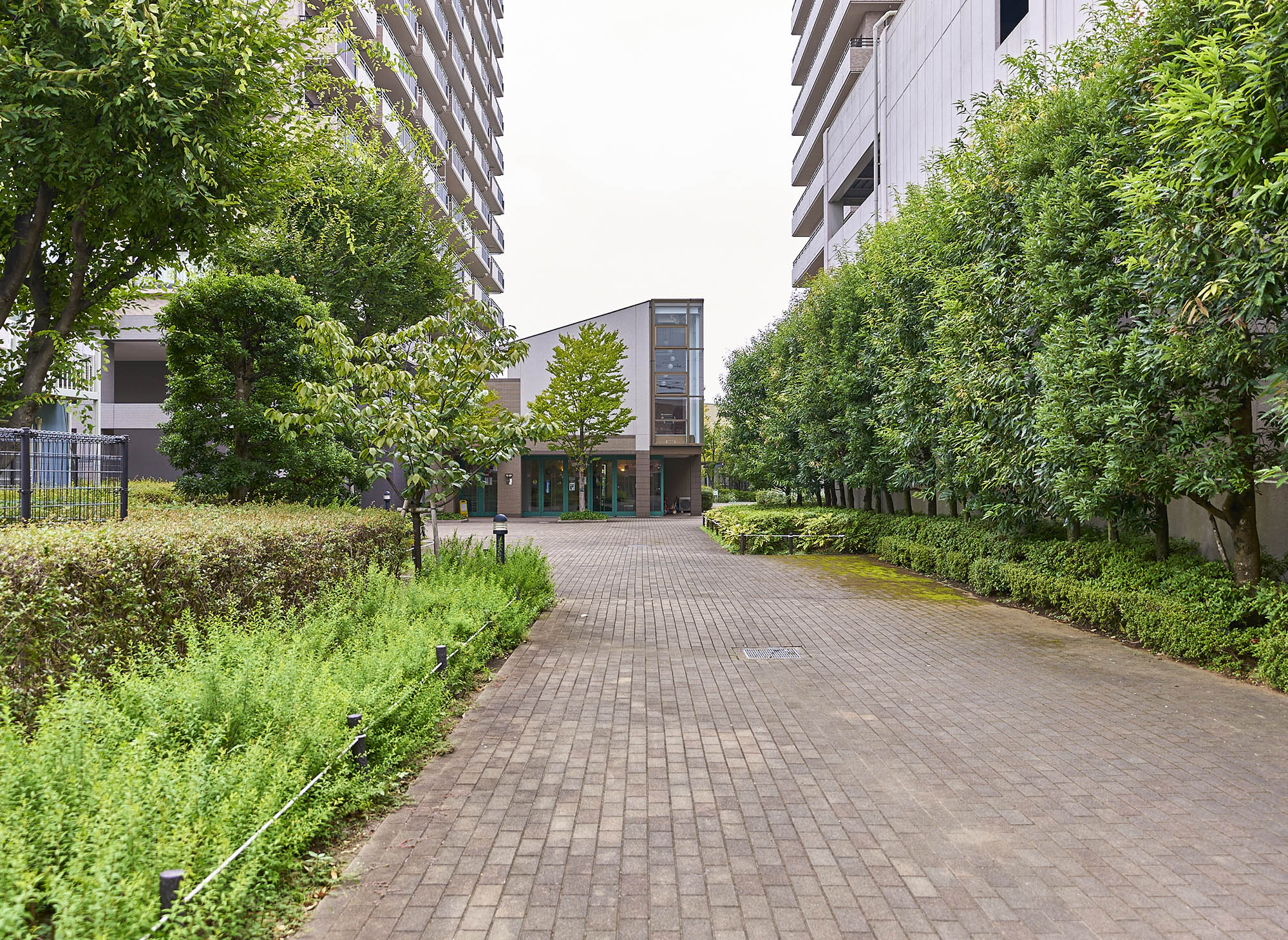 低層部は落ち着いたグレー系のアクセントタイル、中層・高層部には暖かみのあるブラウン系の二丁掛タイルが施され、住まいとしての品格を感じさせるデザインです。バルコニーの手摺には、外観にシャープな雰囲気を生み出す3本手摺を使用。屋上は勾配屋根の美観とルーフバルコニーを兼ね備えたゲーブル屋根なっており、建物に風格を添えています。敷地内は約65%の空地が設けられており、多彩な植栽やインターロッキングなどが施され、日々の暮らしの中で自然の存在が感じられるような、緑に包まれた街をつくりあげています。