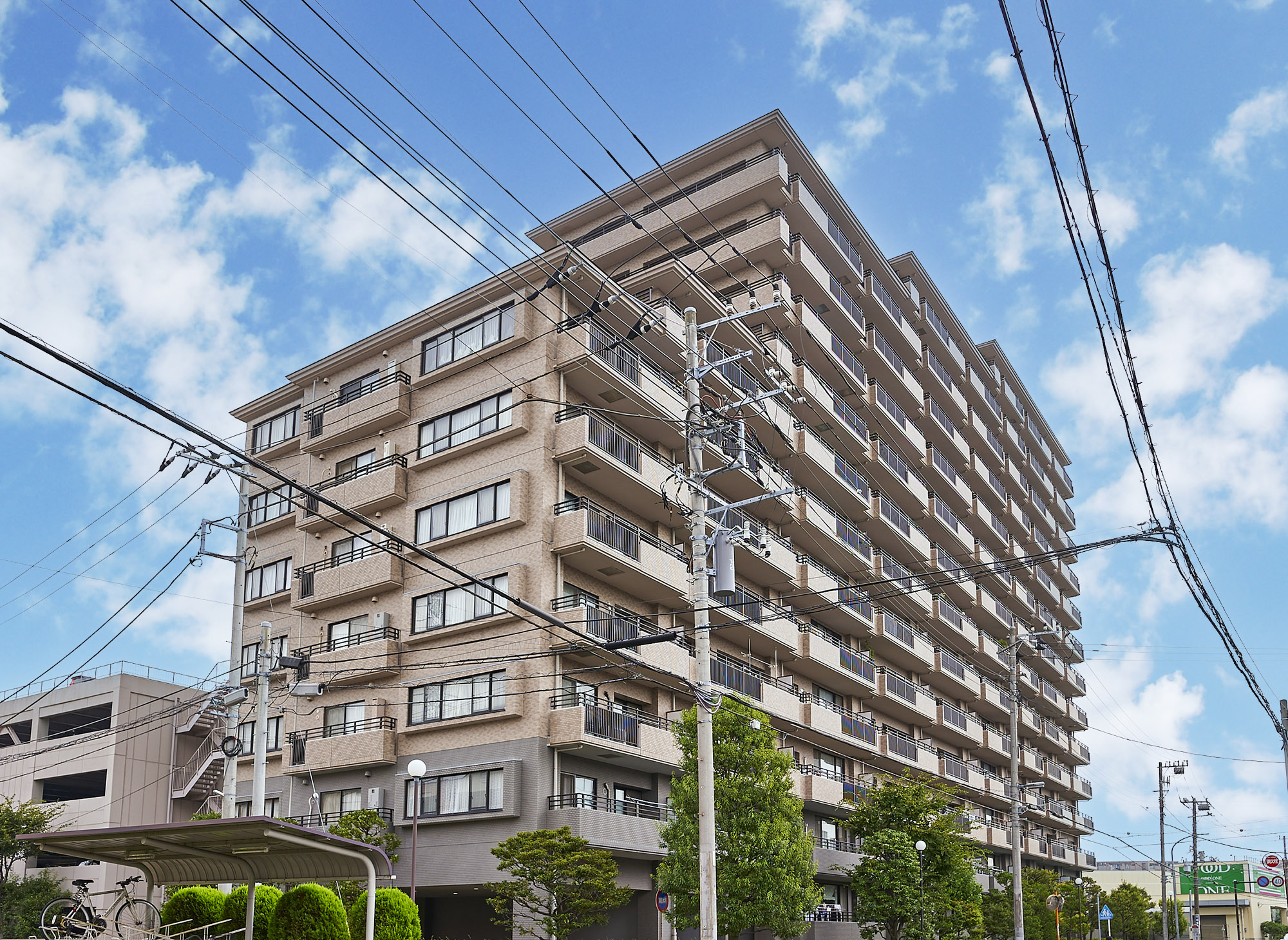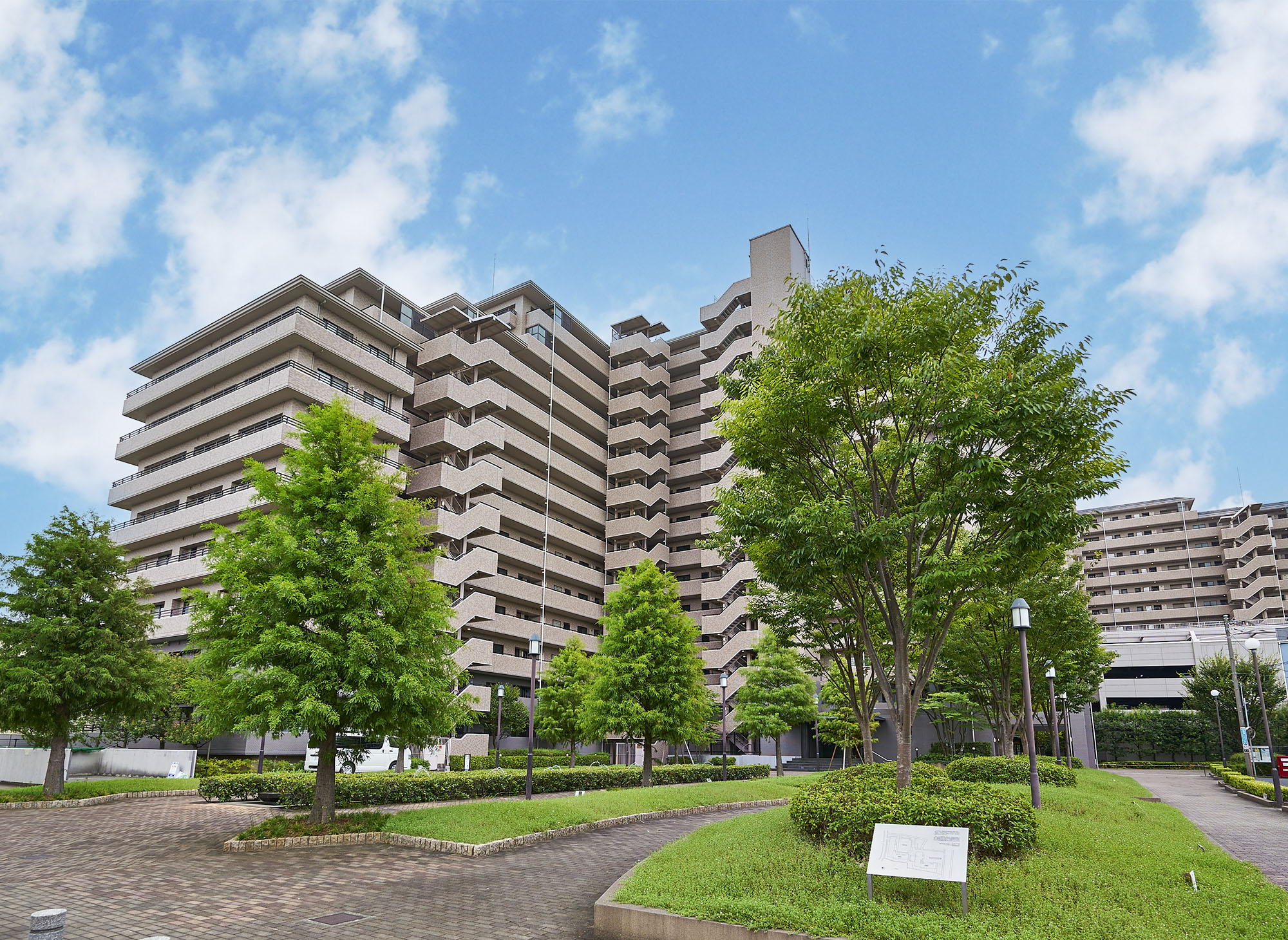 低層部は落ち着いたグレー系のアクセントタイル、中層・高層部には暖かみのあるブラウン系の二丁掛タイルが施され、住まいとしての品格を感じさせるデザインです。バルコニーの手摺には、外観にシャープな雰囲気を生み出す3本手摺を使用。屋上は勾配屋根の美観とルーフバルコニーを兼ね備えたゲーブル屋根なっており、建物に風格を添えています。敷地内は約65%の空地が設けられており、多彩な植栽やインターロッキングなどが施され、日々の暮らしの中で自然の存在が感じられるような、緑に包まれた街をつくりあげています。