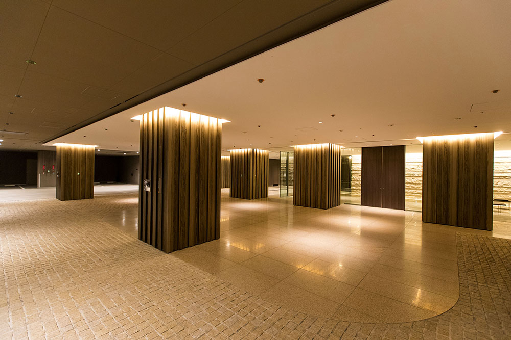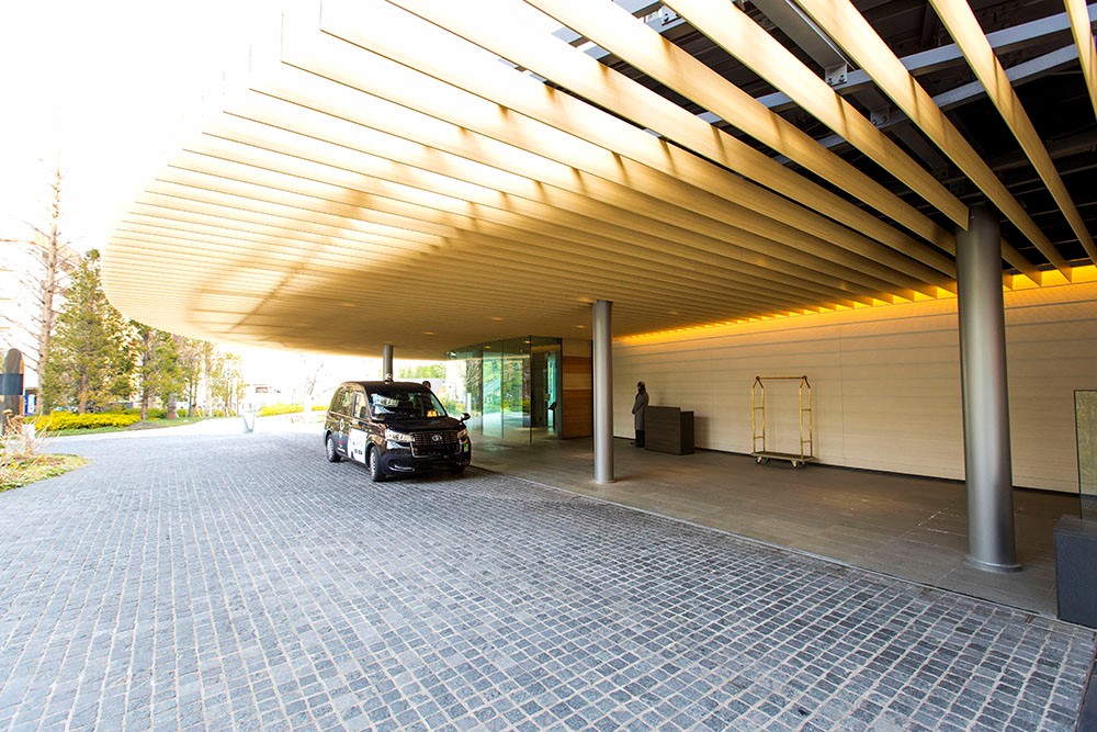 セキュリティ、プライバシー、デザイン。そのすべてに配慮したコーチエントランスのテーマは、地層。御影石が積層する壁は、地層を表現している。柱は土の中から掘り起こされた木「神代檜」がモチーフ。板を1枚おきに重ねて張る大和張りと光の演出により、空間美を高めている。